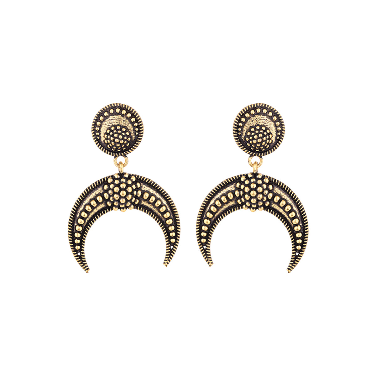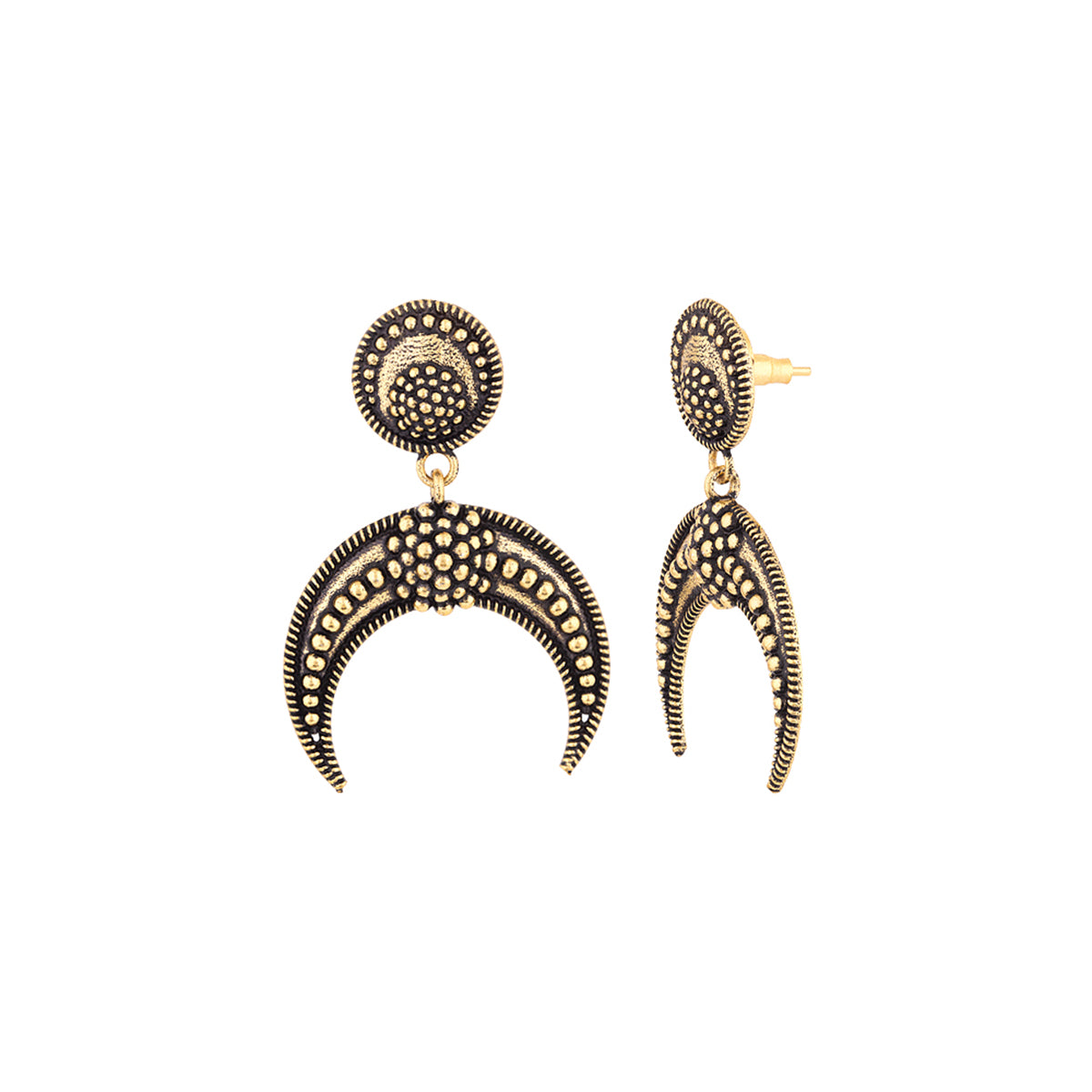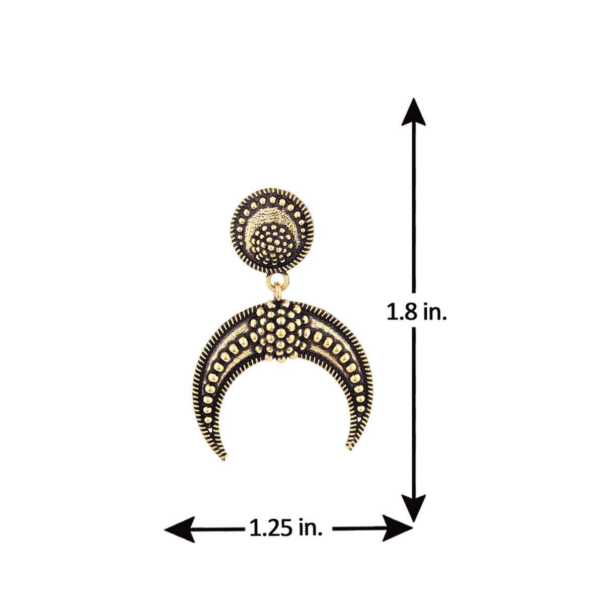 Half moon drop earrings made from brass. Oxidised gold plated and featuring a textured surface. Good for casual wear. This piece of jewelry comes with the Voylla assurance of quality and durability.