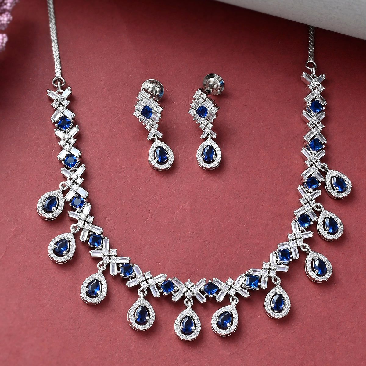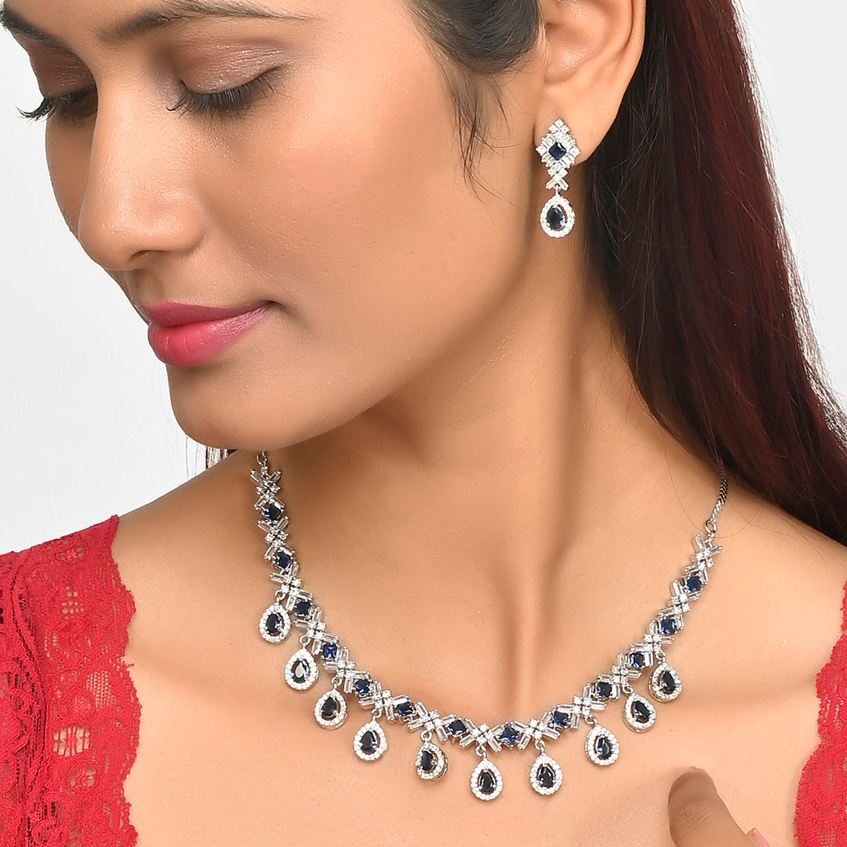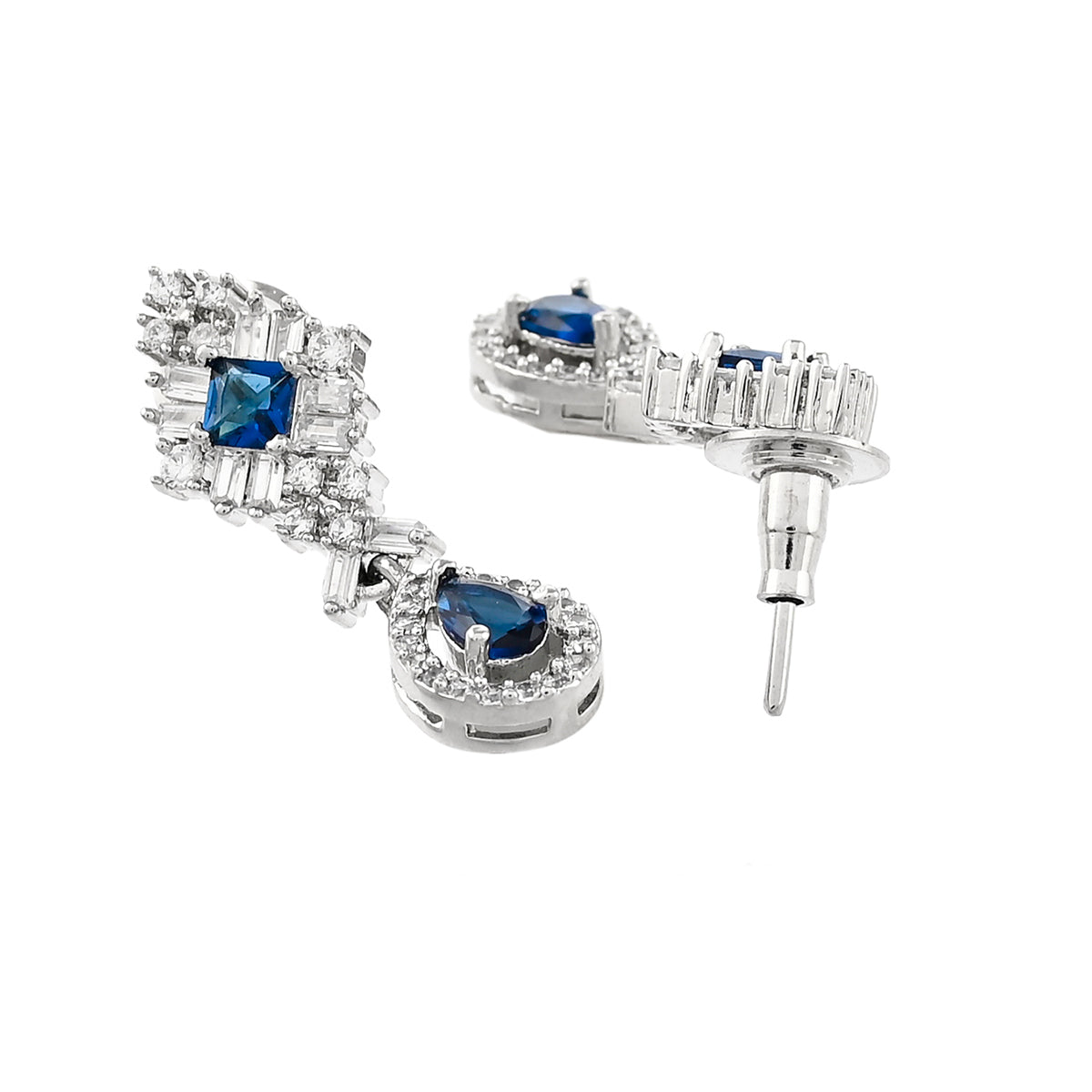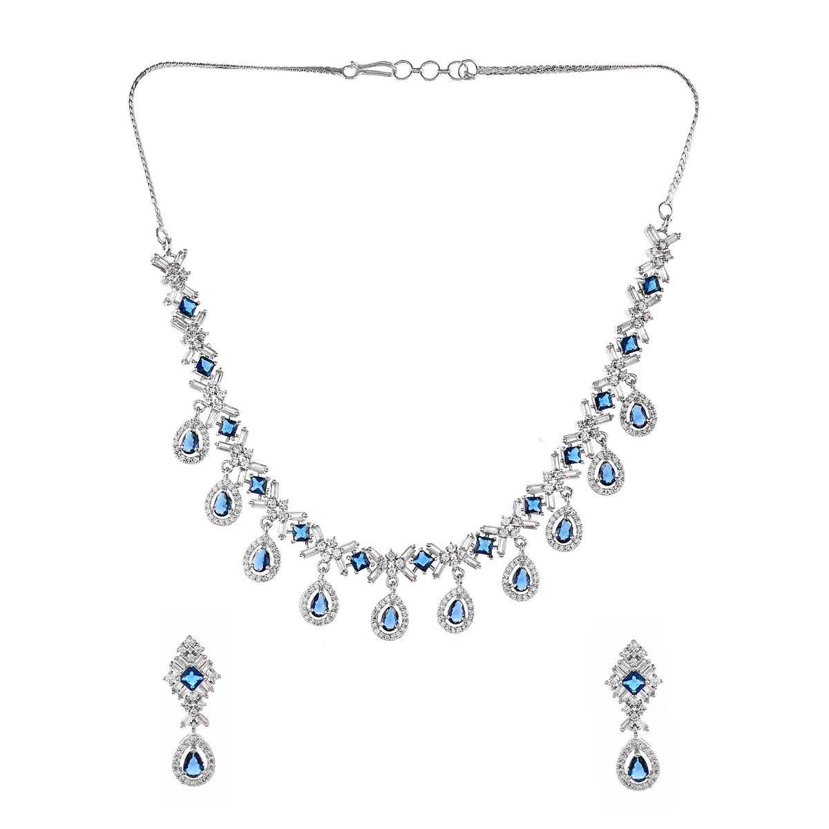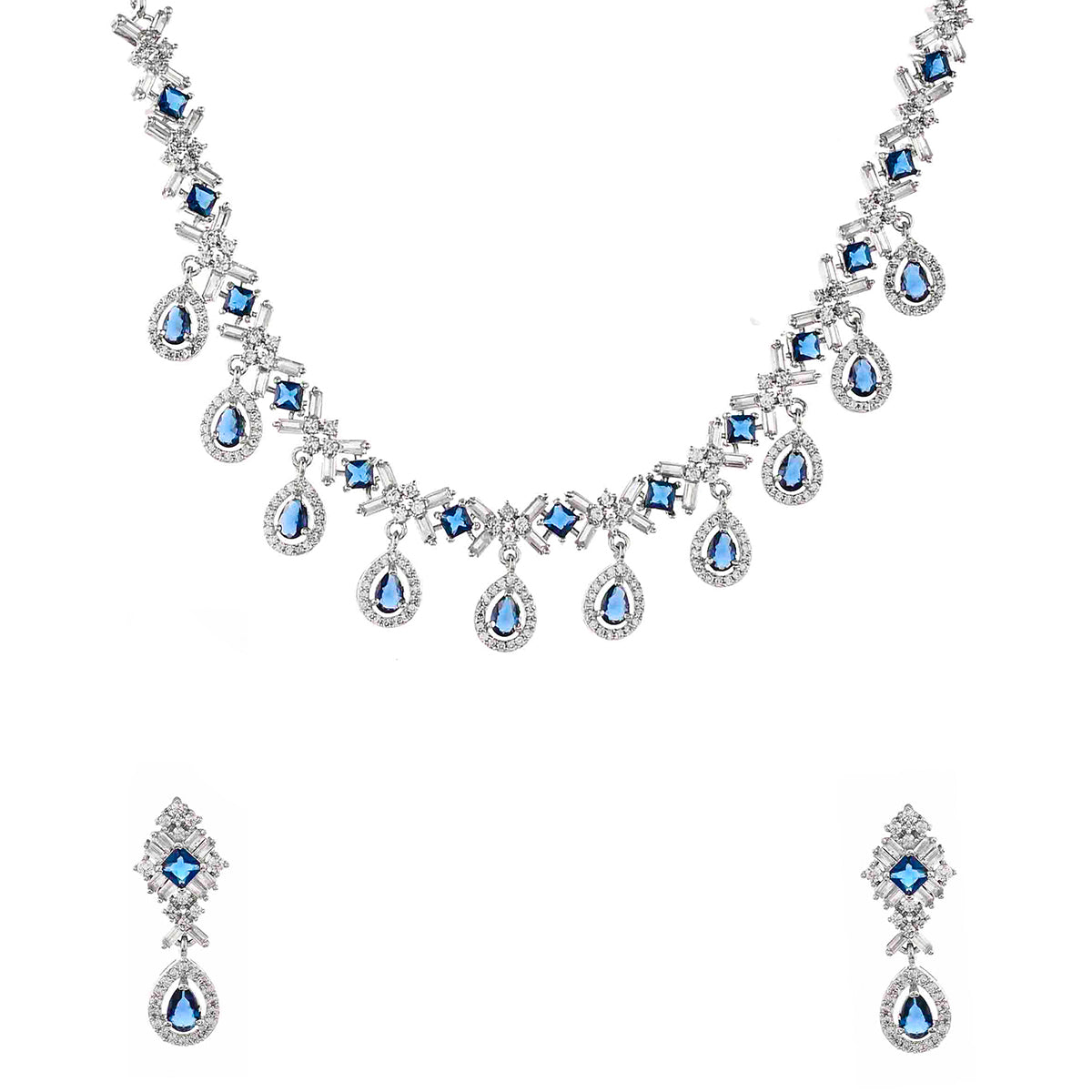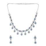 Blue and white teardrop cut zircons jewellery set, fashioned out of high quality brass. The silver plated necklace and earrings are lightweight and comfortable. A good match for formal looks of all kinds.