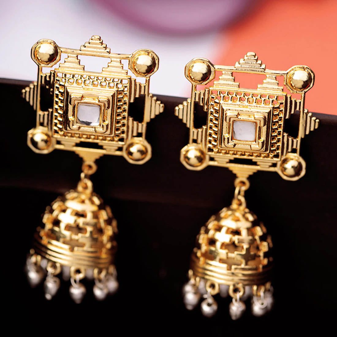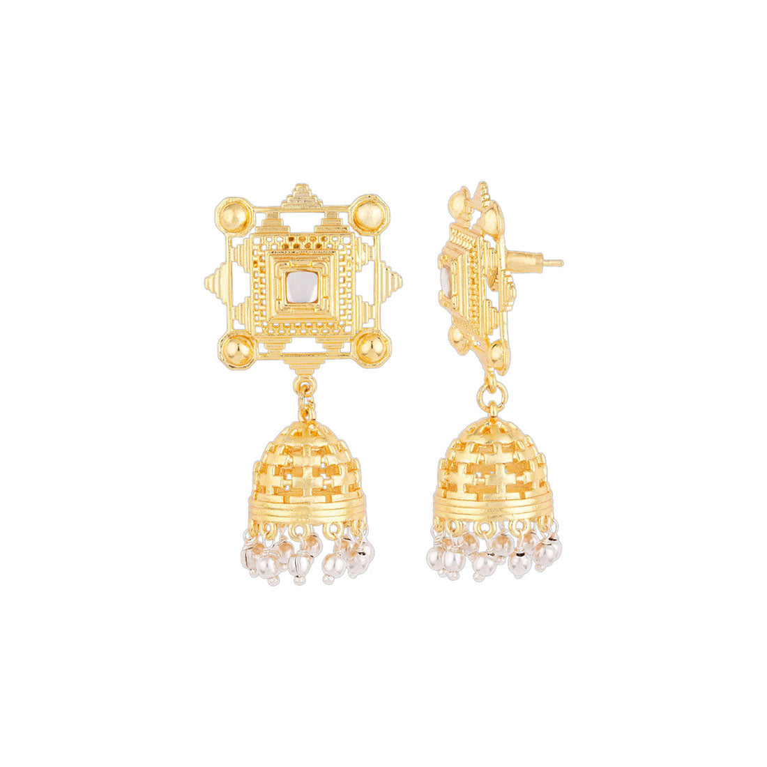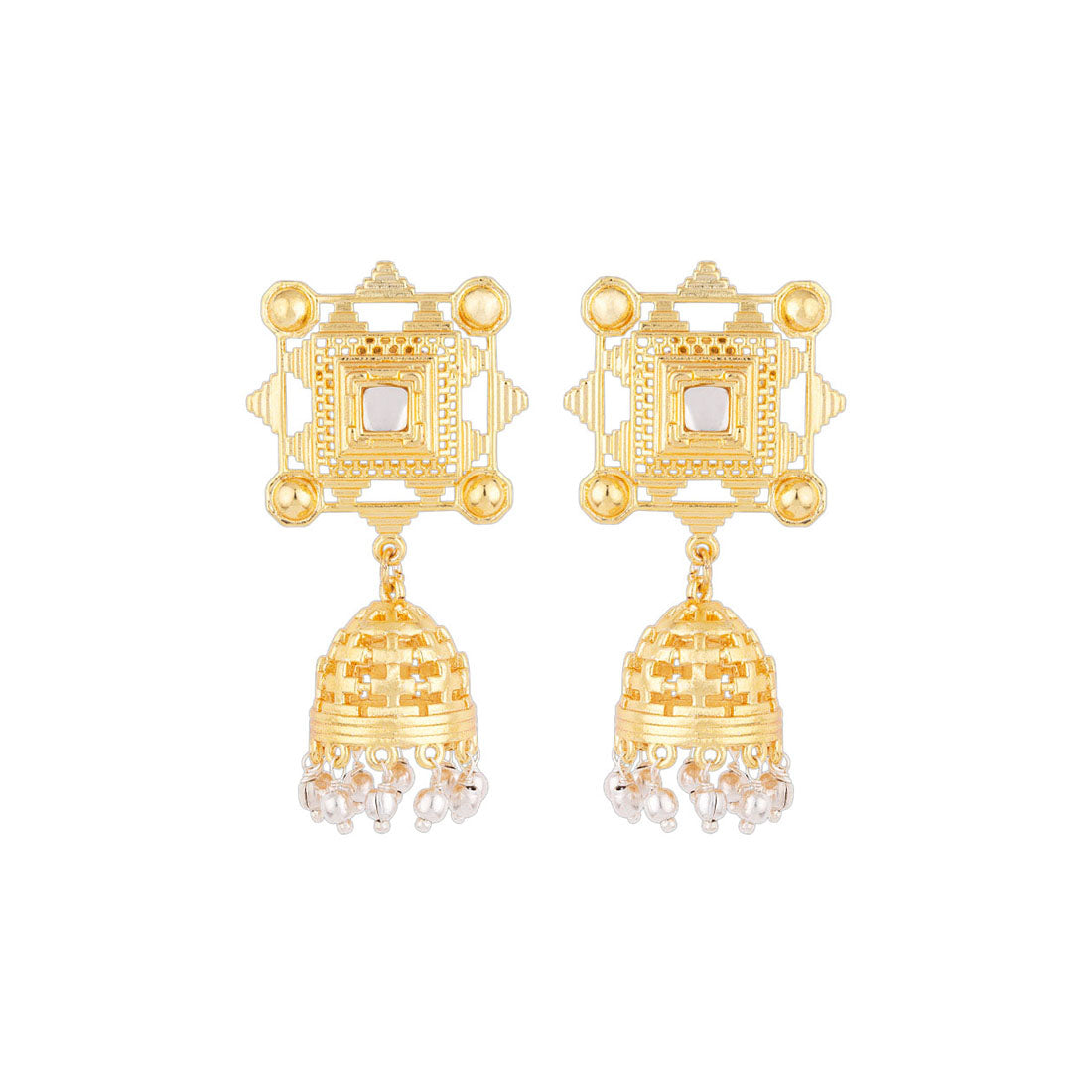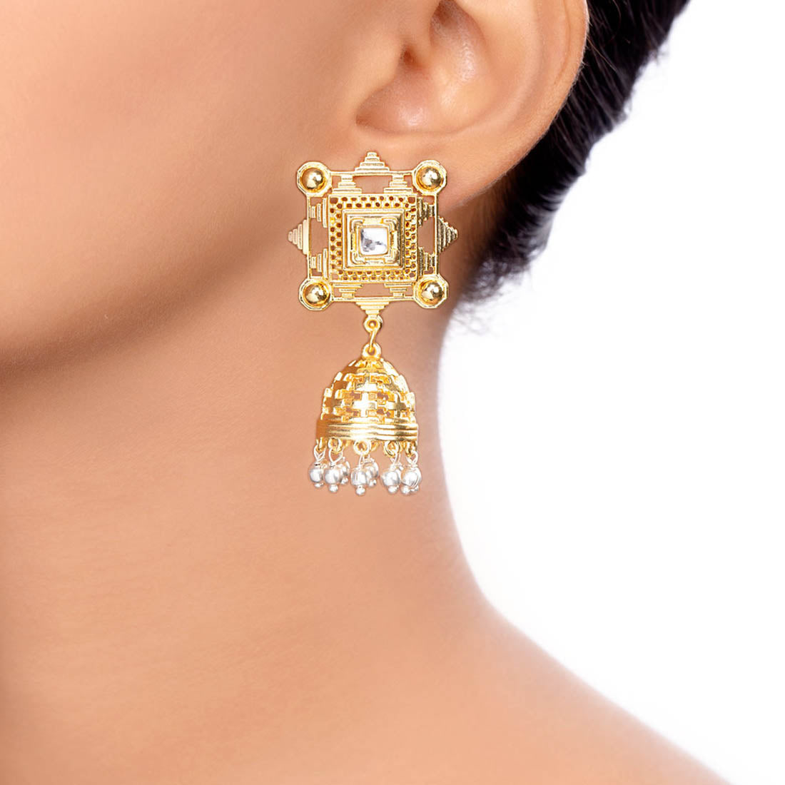 Lightly embellished jhumka earrings, inspired by iconic Rajasthani Stepwells. Yellow gold plated and crafted from brass. Pair with a casual kurta or light saree.