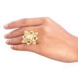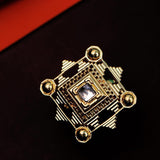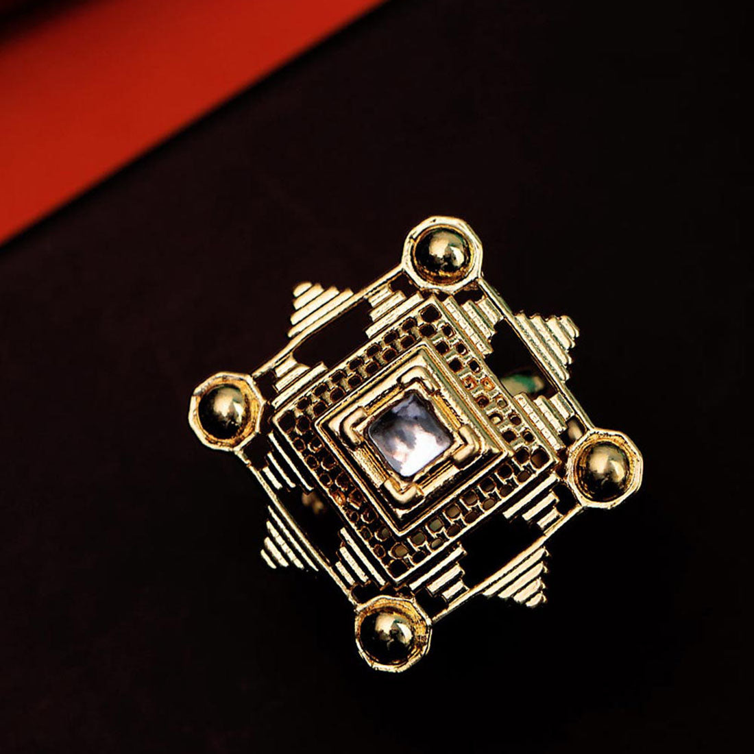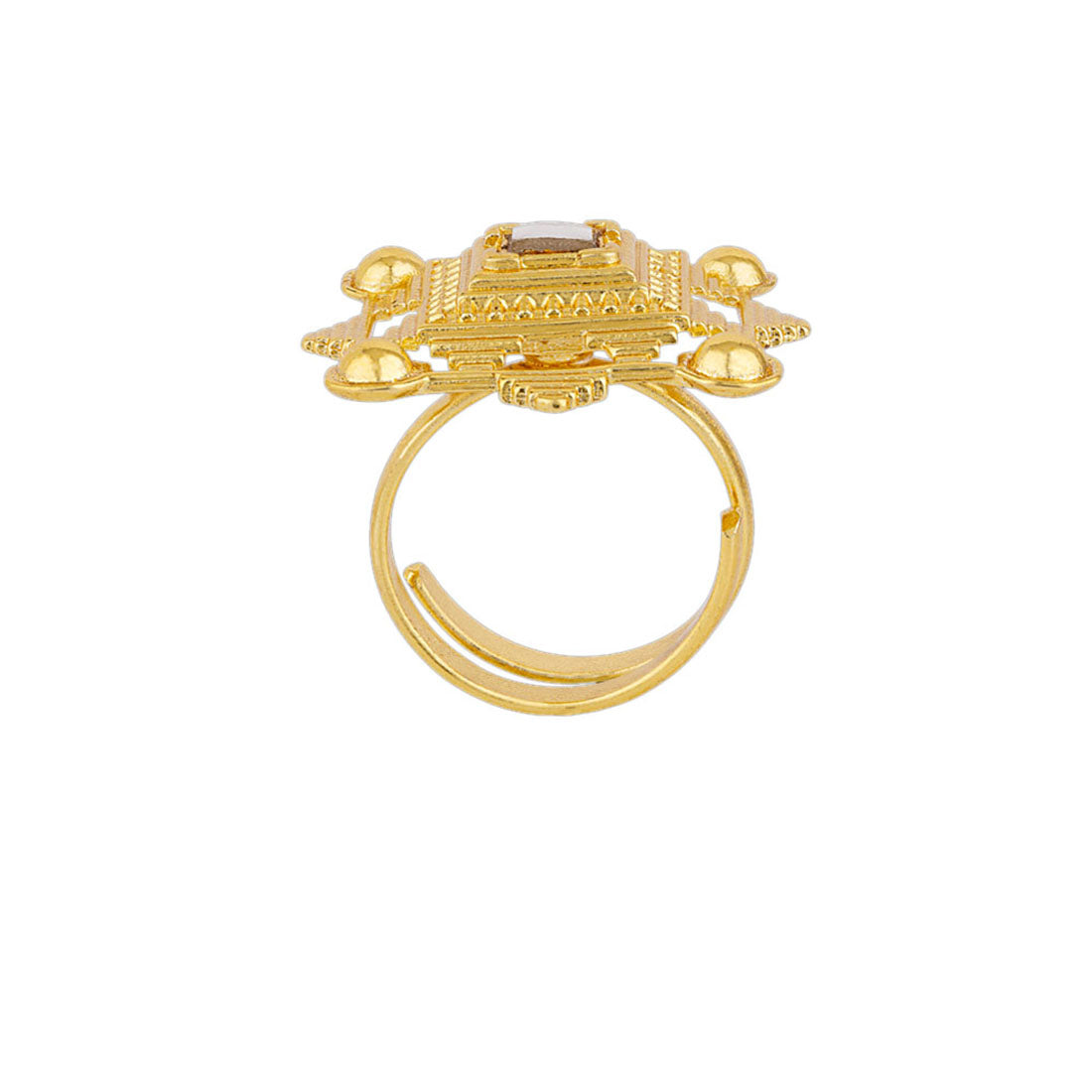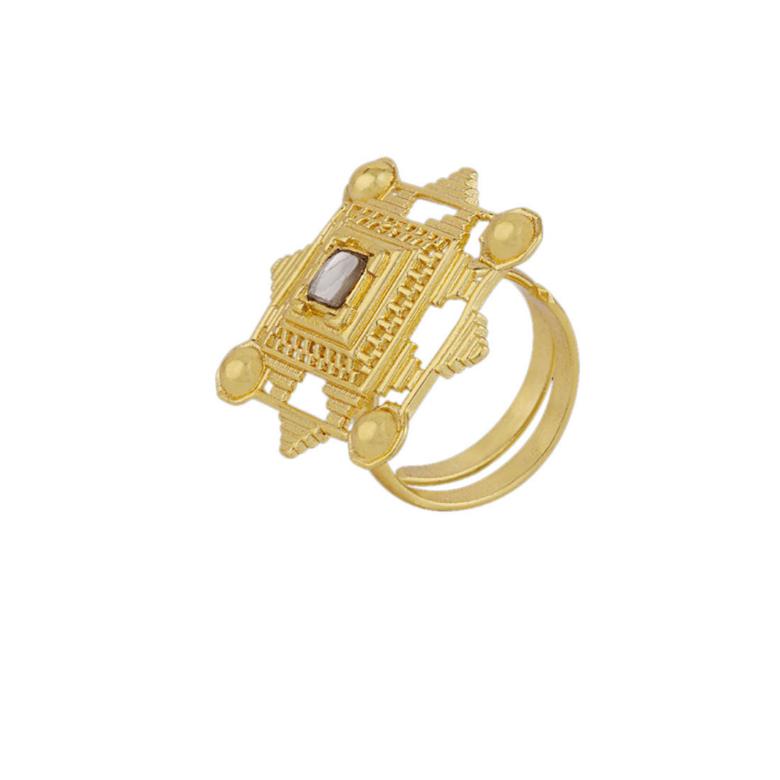 Inspired by iconic architecture of Indian Stepwells, this ring has been fashioned out of brass. Adorned with a gemstone and yellow gold plated. Wear with just about everything.