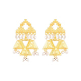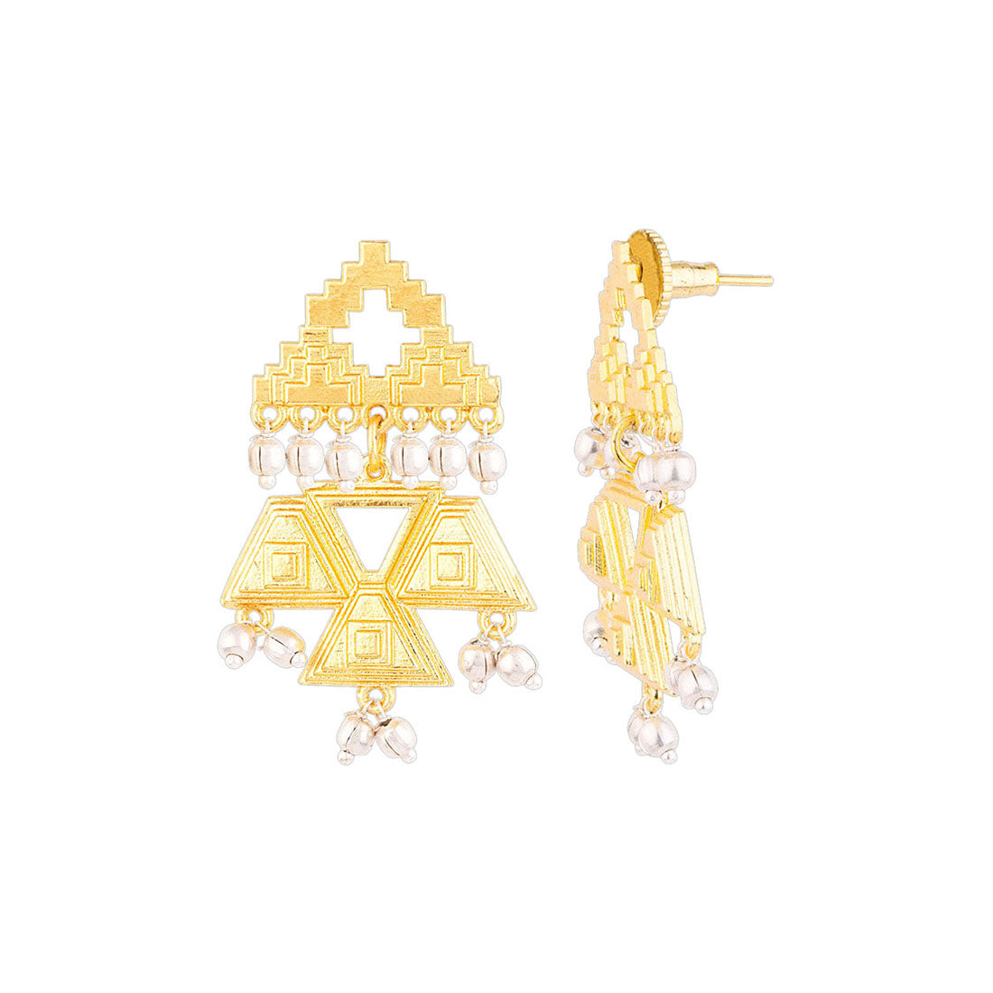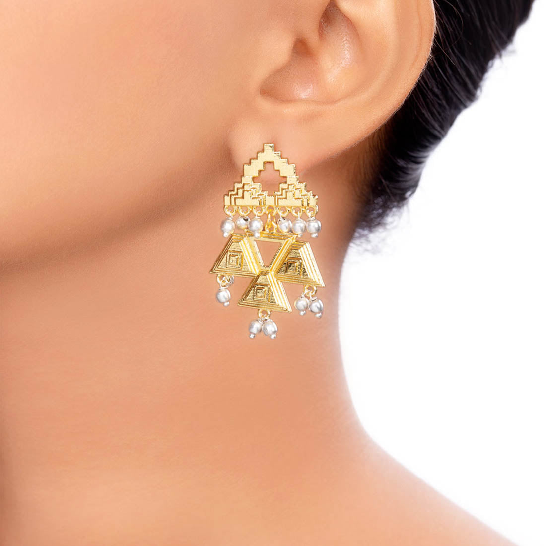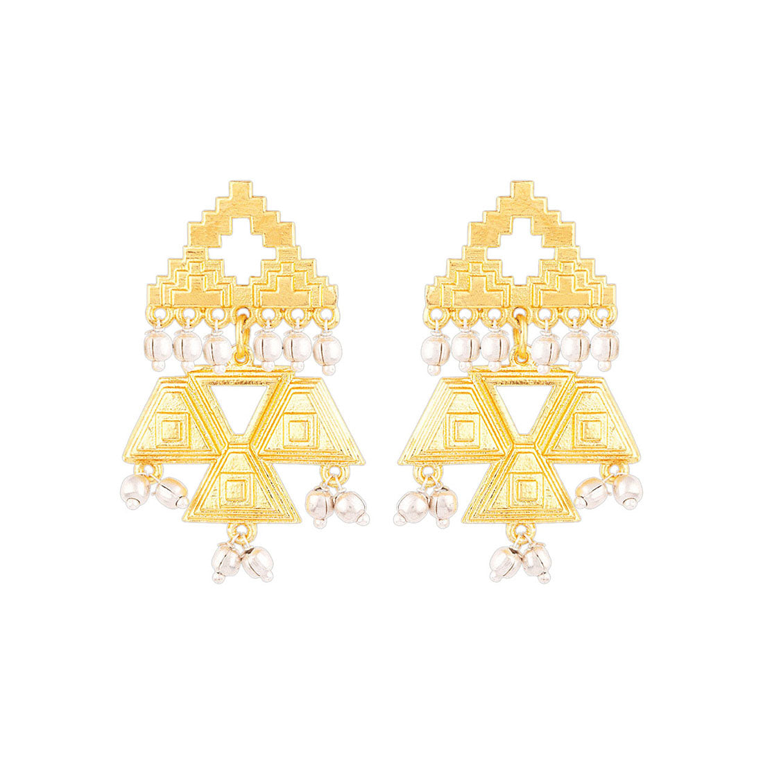 Rajasthan's Stepwells have inspired the design of these earrings, which have been crafted from brass and lightly embellished. Wear the yellow gold plated pair with an ethnic skirt.