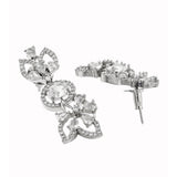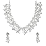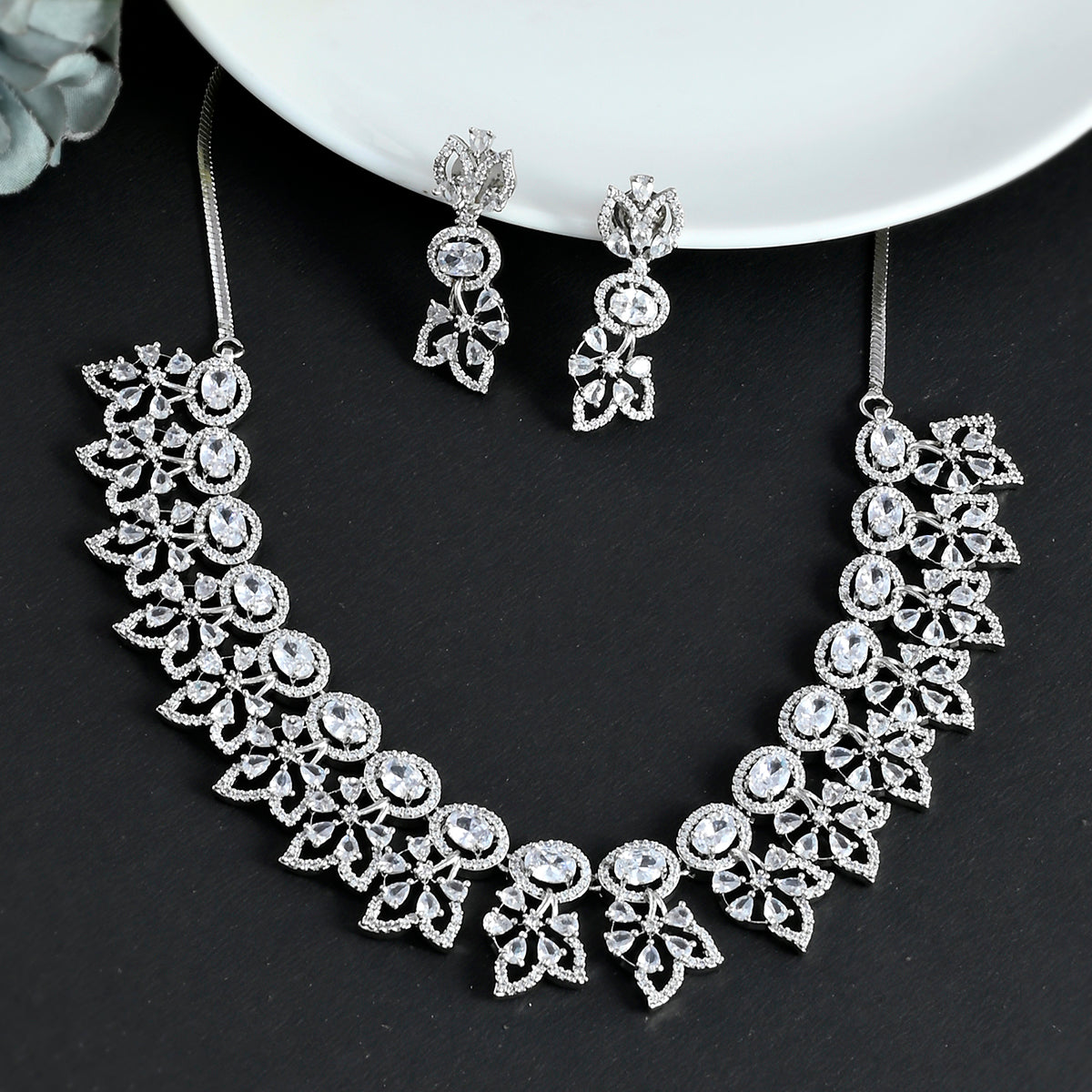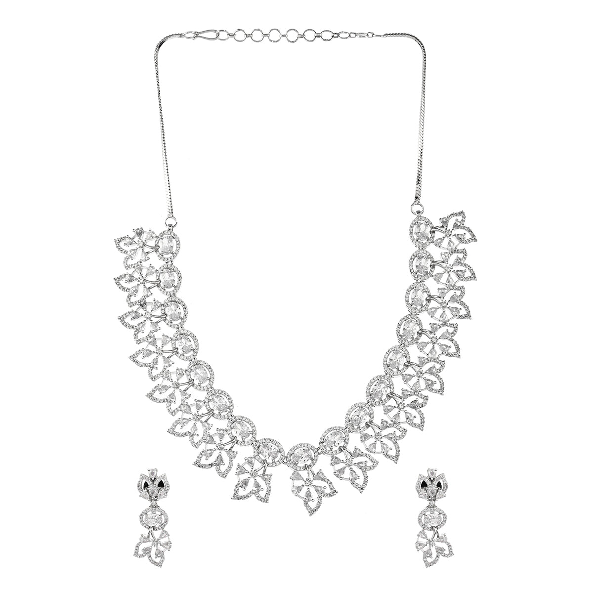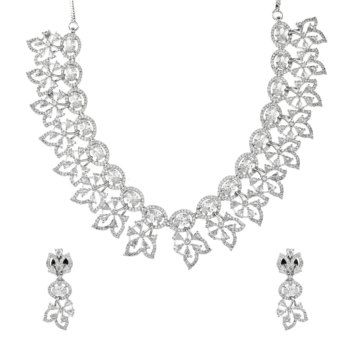 Brass floral motifs jewellery set with round cut zircon gemstones. Silver plated for added charm and a good match for formal looks of all kinds.