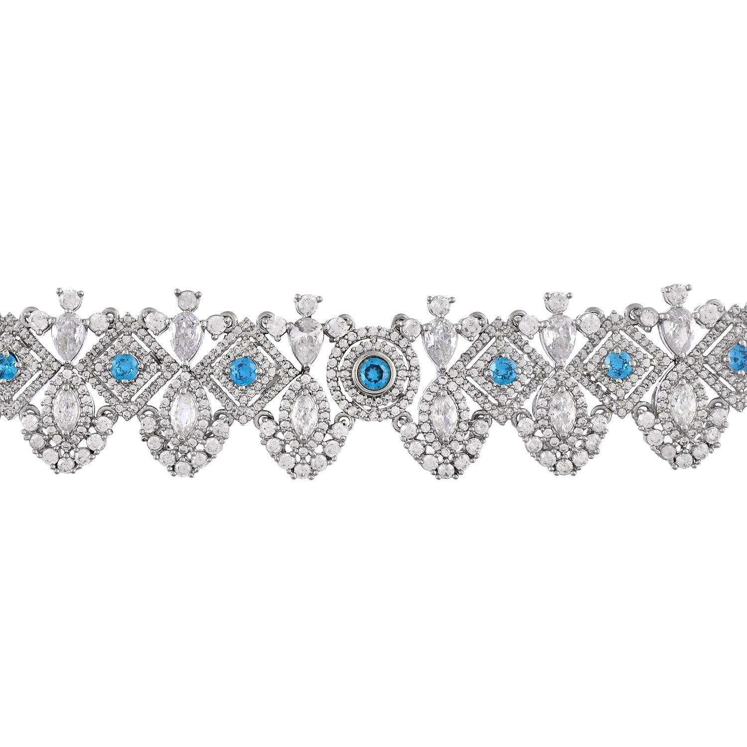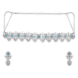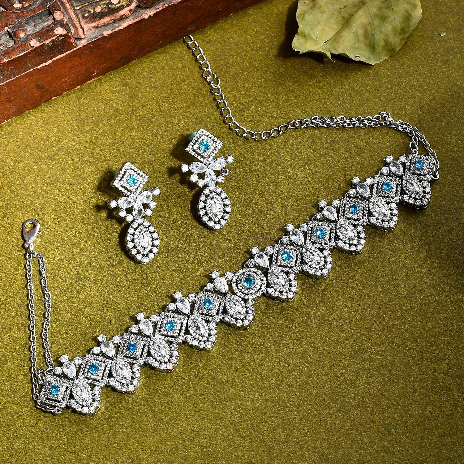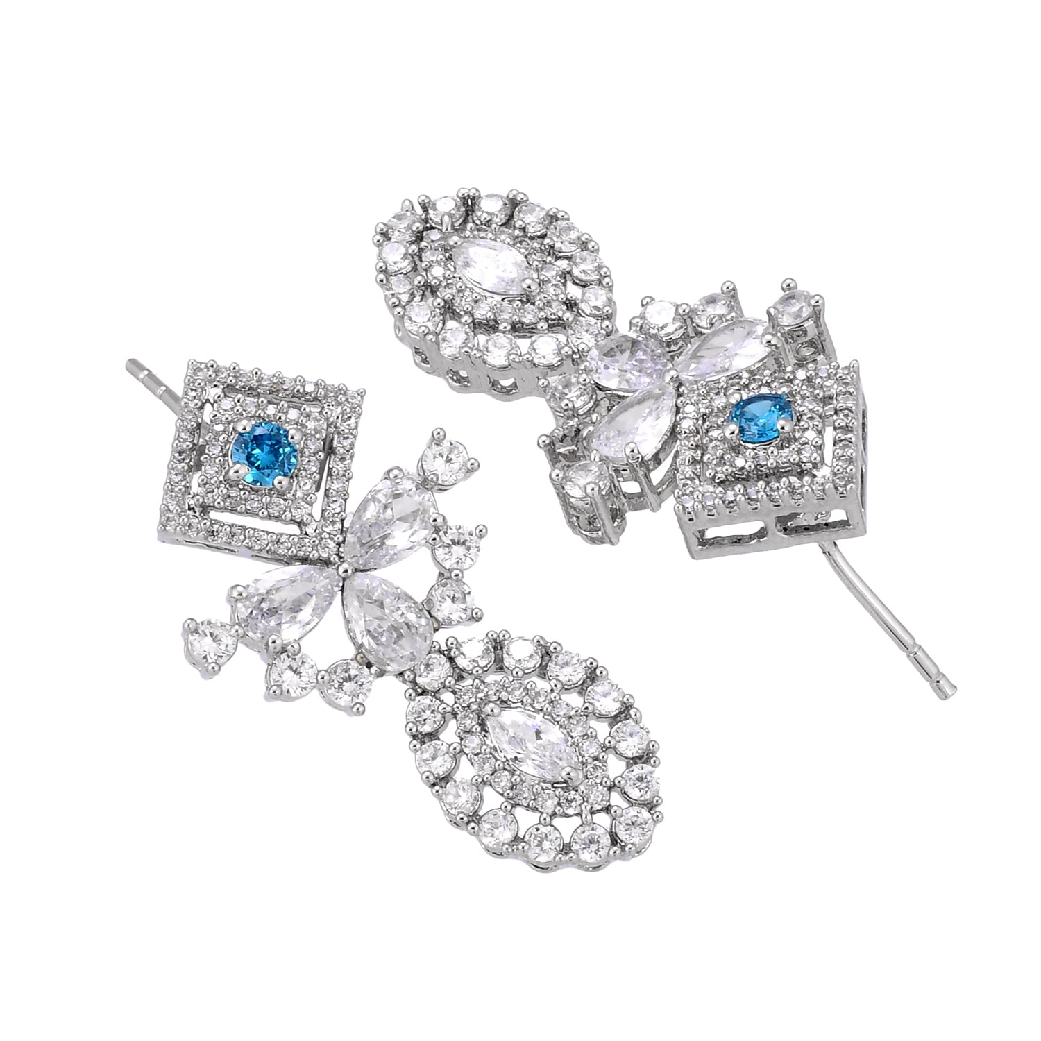 Inspired by the morning dew and the beauty of dawn, this lovely jewellery set has been fashioned out of brass. Teardrop and diamond cut turquoise blue and white zirconia gems adorn the silver plated necklace and earrings. Pair with a formal gown.