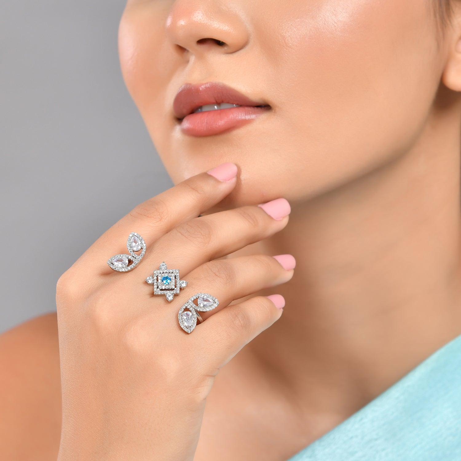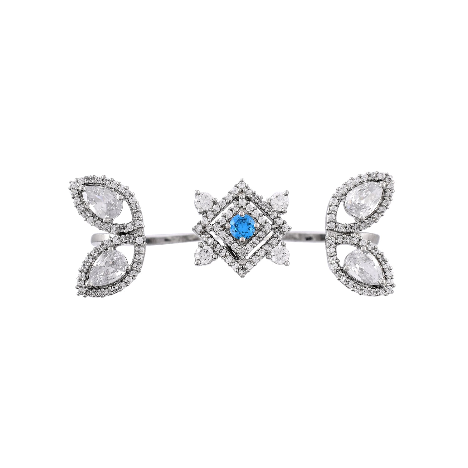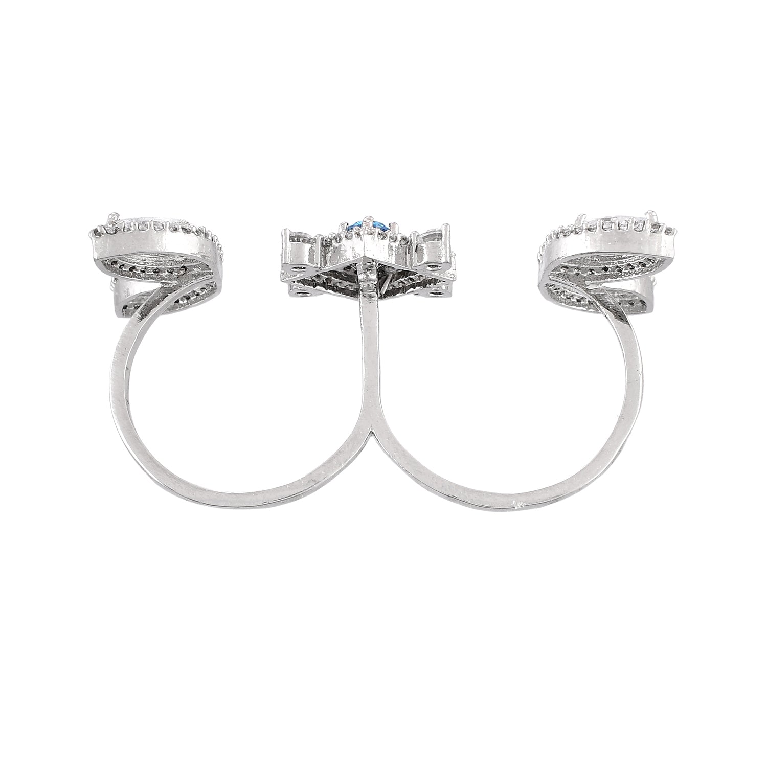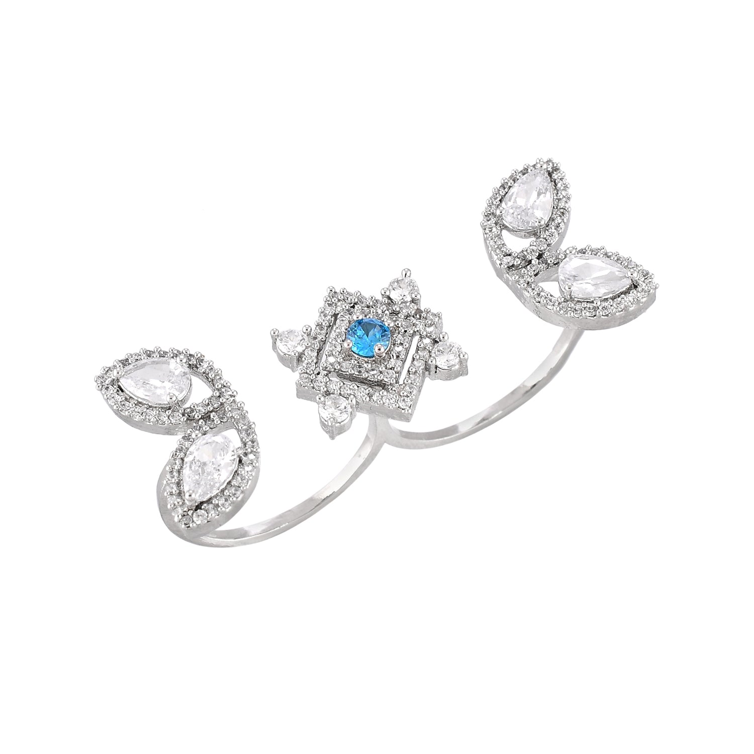The beauty of the morning dew and its purity have inspired this beautiful dual-finger ring, which has been made from brass. Embellished with white and turquoise cluster setting CZ gemstones, the silver plated ring is adjustable for maximum comfort.