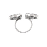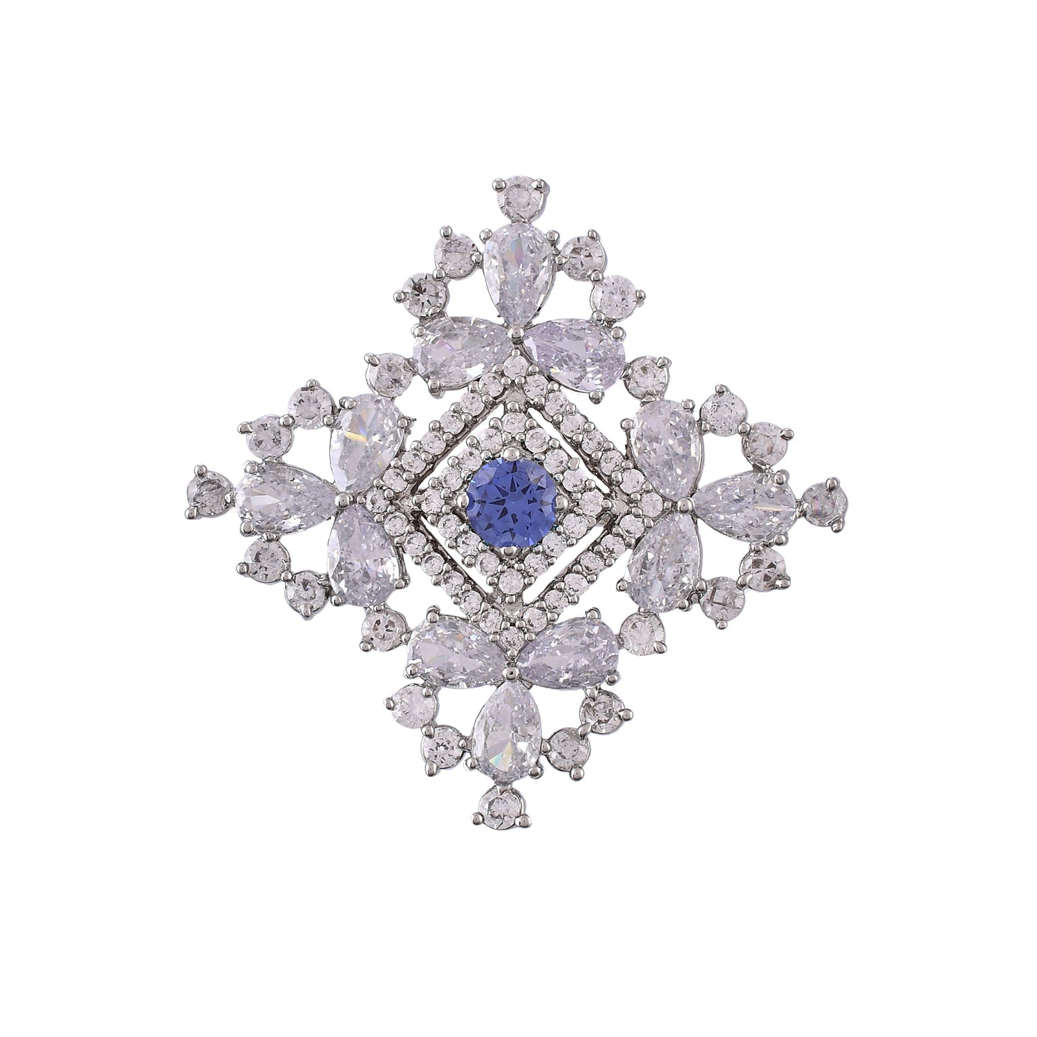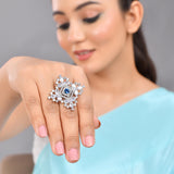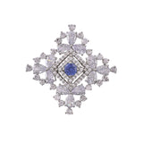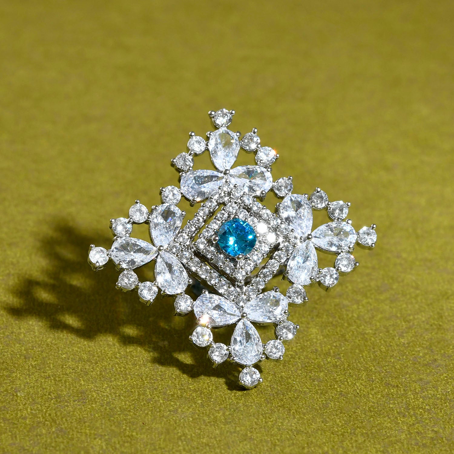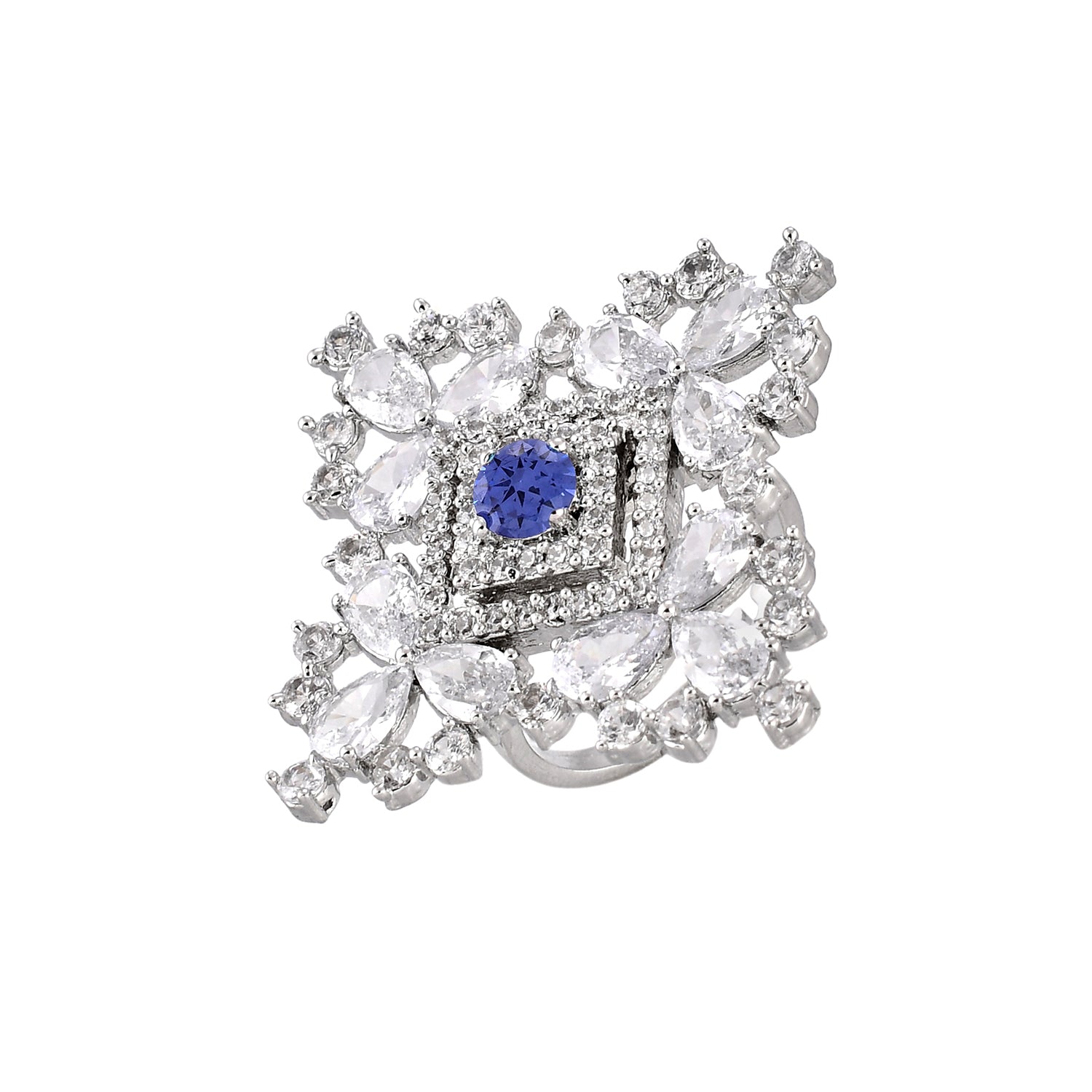 Opulent lattice pattern ring, designed as a tribute to the beauty of dawn and morning dew. Blue and white zirconia gemstones adorn this brass ring, which has been given a lovely silver plating. Pair with formal attire of all kinds.