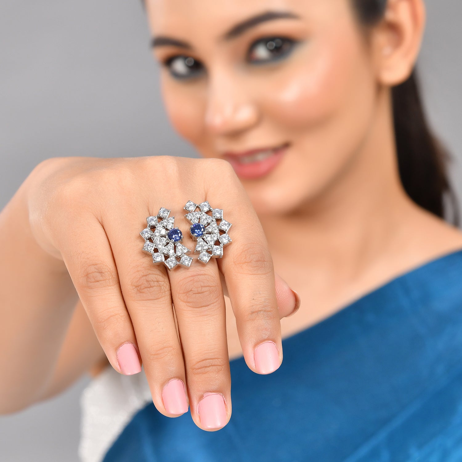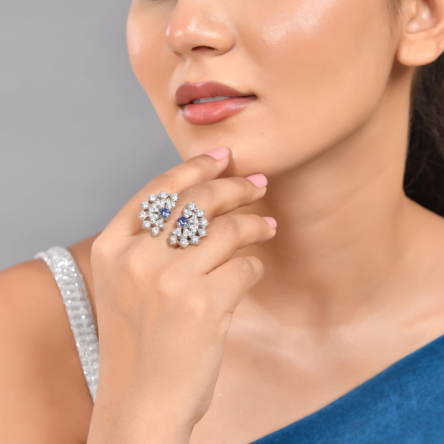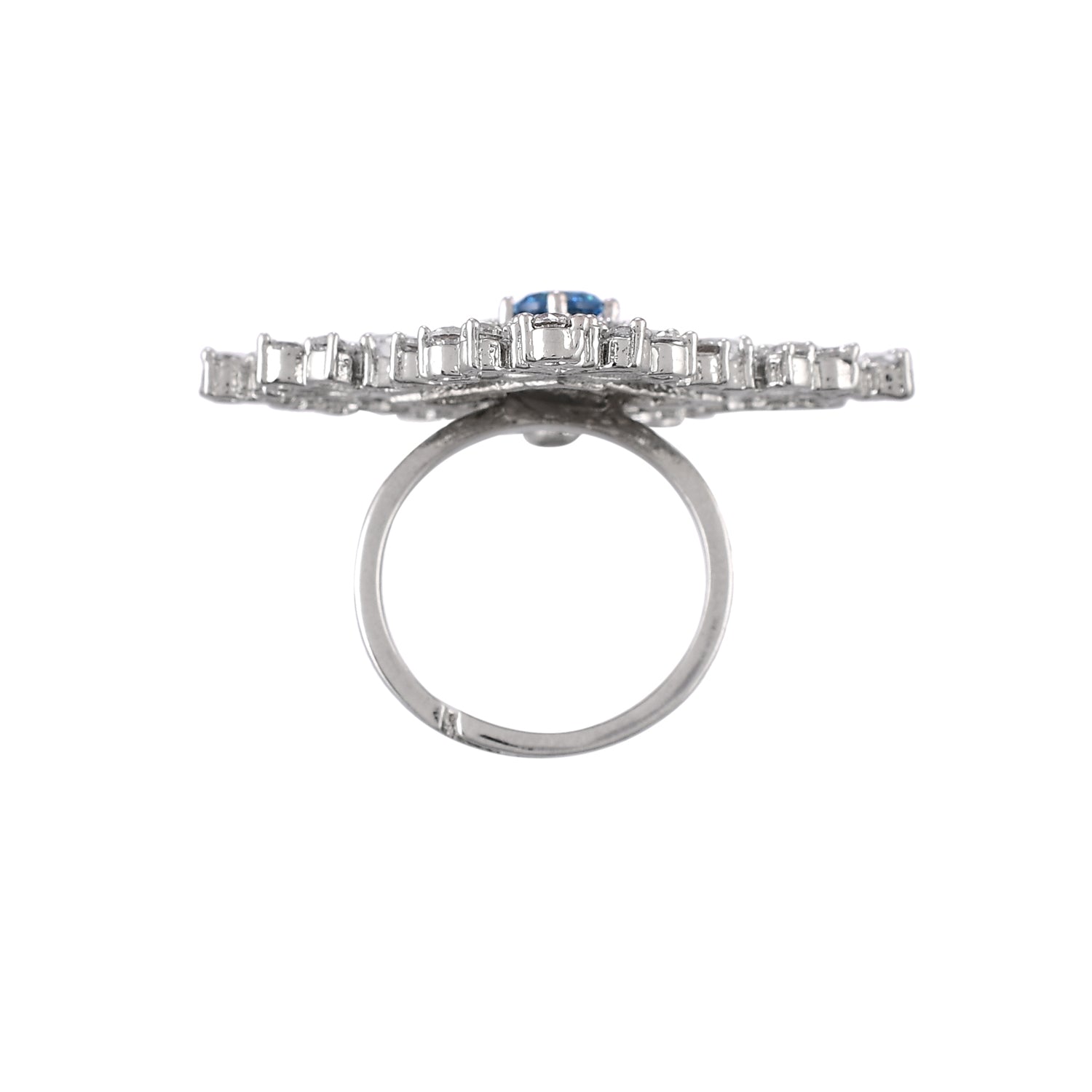 The morning dew and beauty of dawn have inspired this open design finger ring, which has been fashioned out of brass. Embellished with cubic zirconia gemstones and silver plated, the comfortable ring is versatile and lightweight.