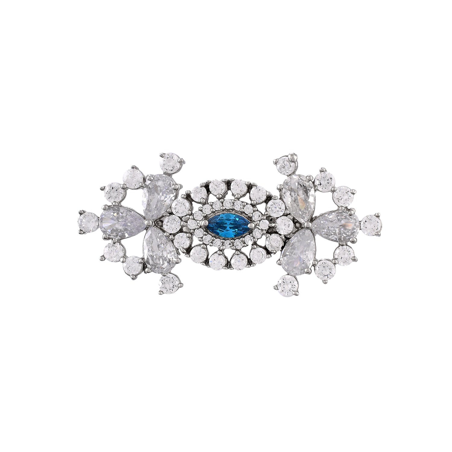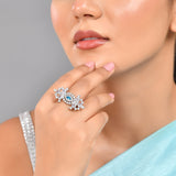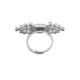 A beautiful finger ring, designed as a tribute to the sparkle and beauty of morning dew. Made from brass and embellished with perfectly cut cubic zirconia gemstones set in floral inspired patterns, the ring is silver plated for added charm. Pair with formal attire.