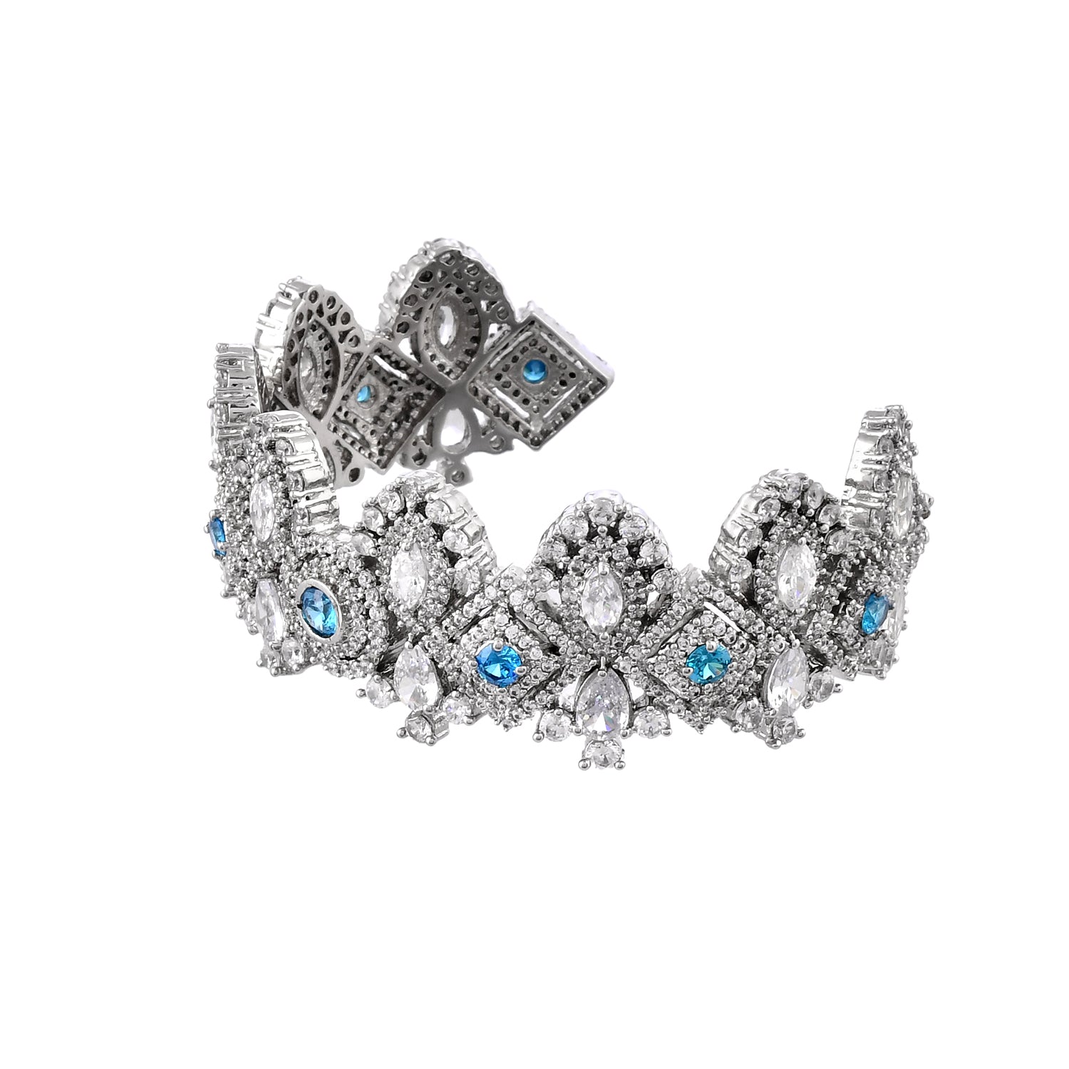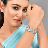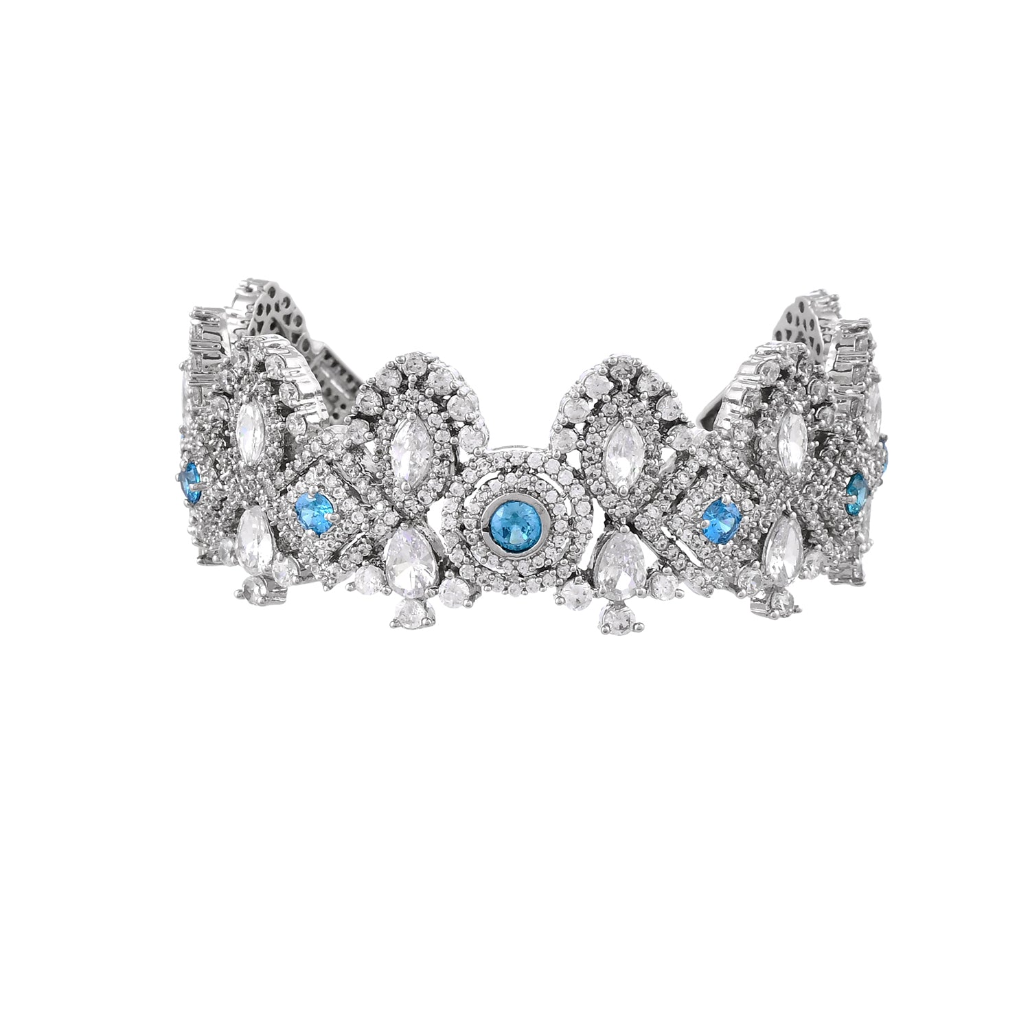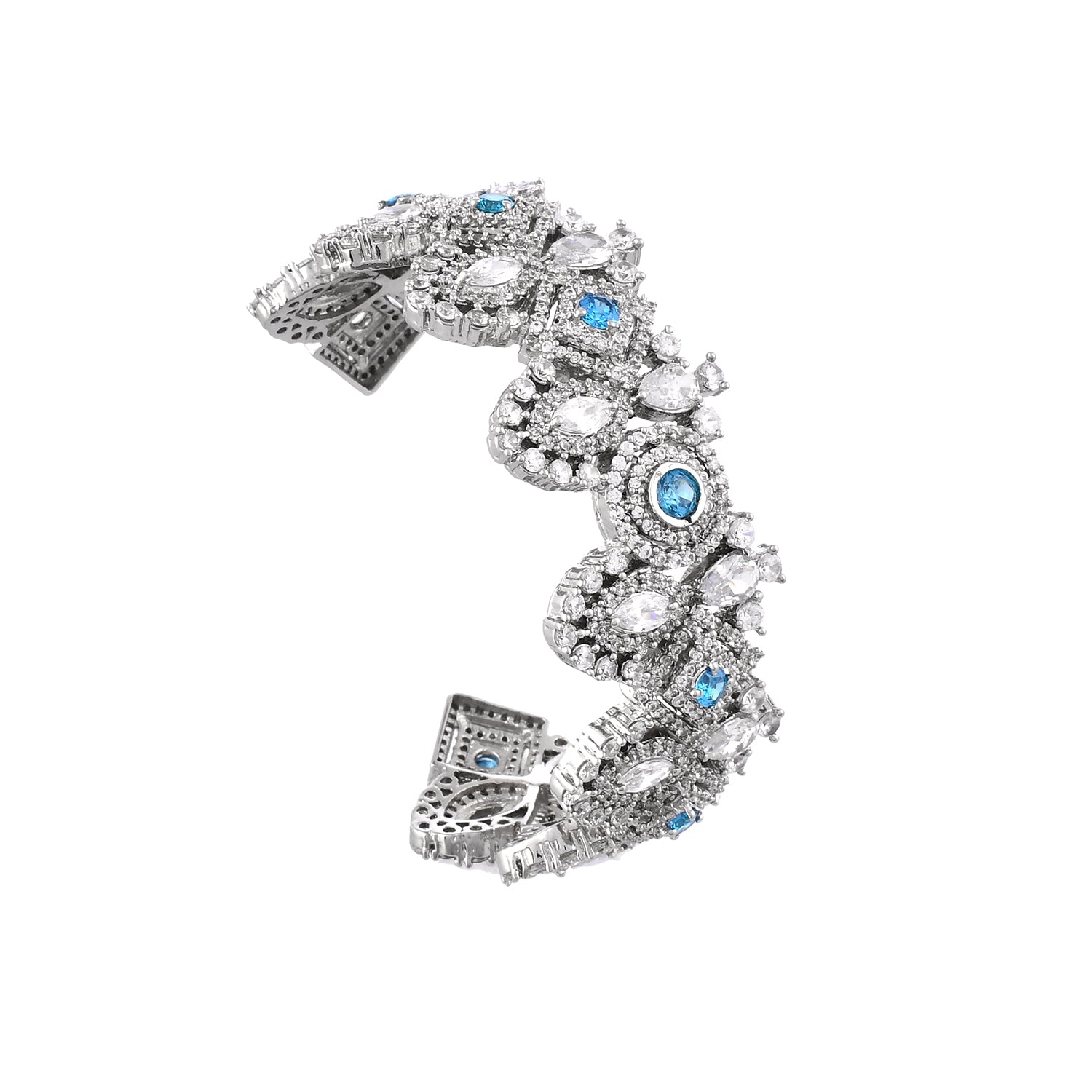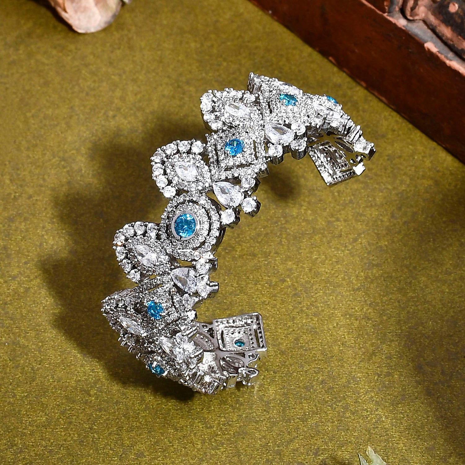 Inspired by the beauty of the morning dew in all its glory, this luxurious cuff bracelet has been fashioned out of brass. Silver plated and embellished with perfectly cut white and blue CZ gems in a cluster setting, the bracelet will pair well with all your formal attire.
