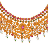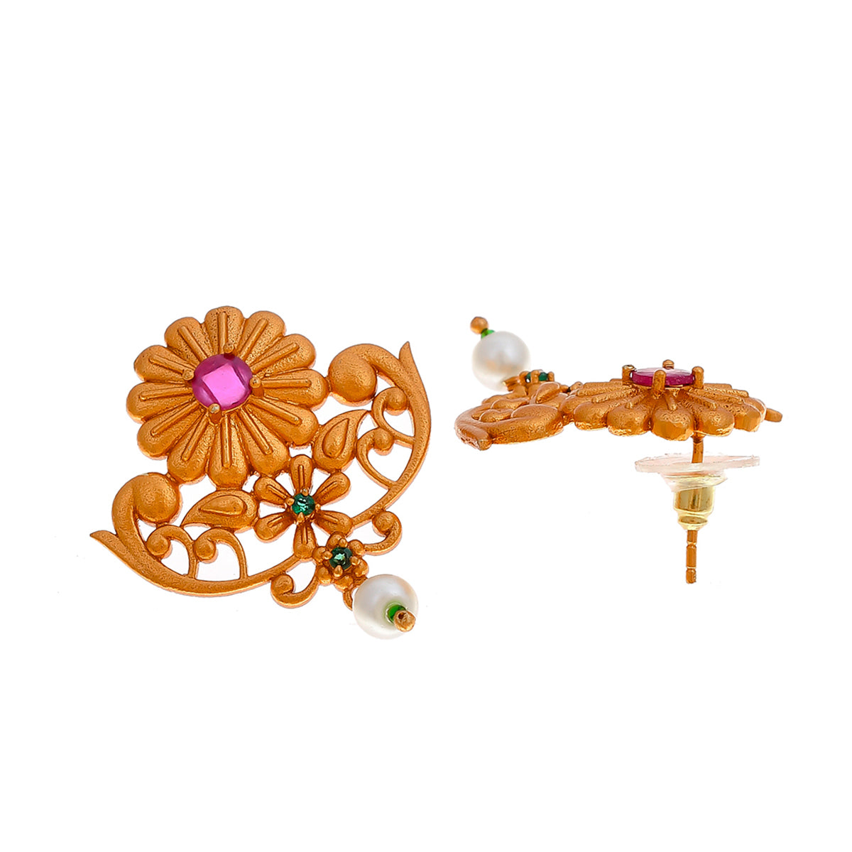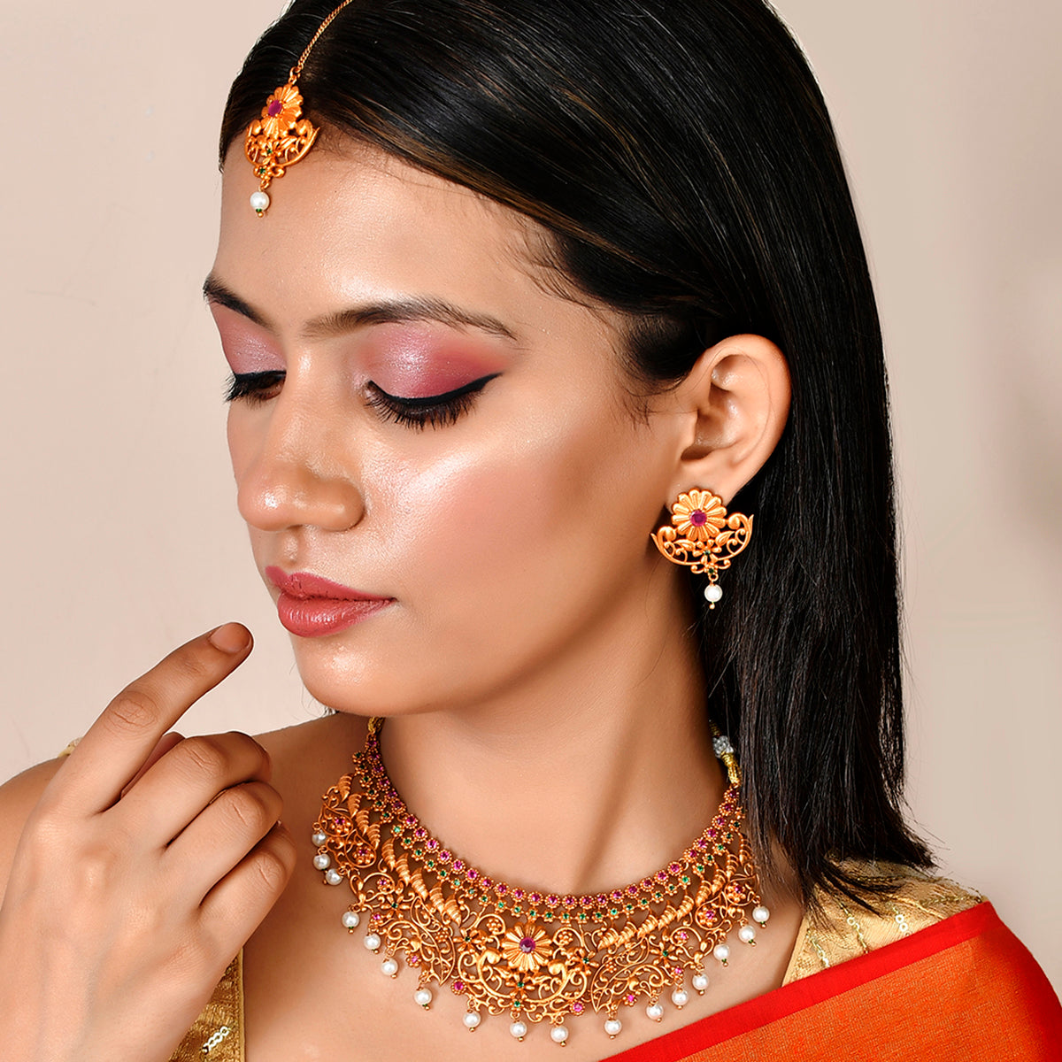 Add a touch of sophistication to your ethnic look with our Red Matte Gold Plated Mang Tika Set from the Bela Collection. The striking red stones and the matte gold plating create a stunning contrast, making this set a perfect accessory for special occasions.