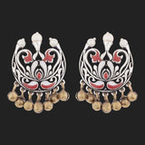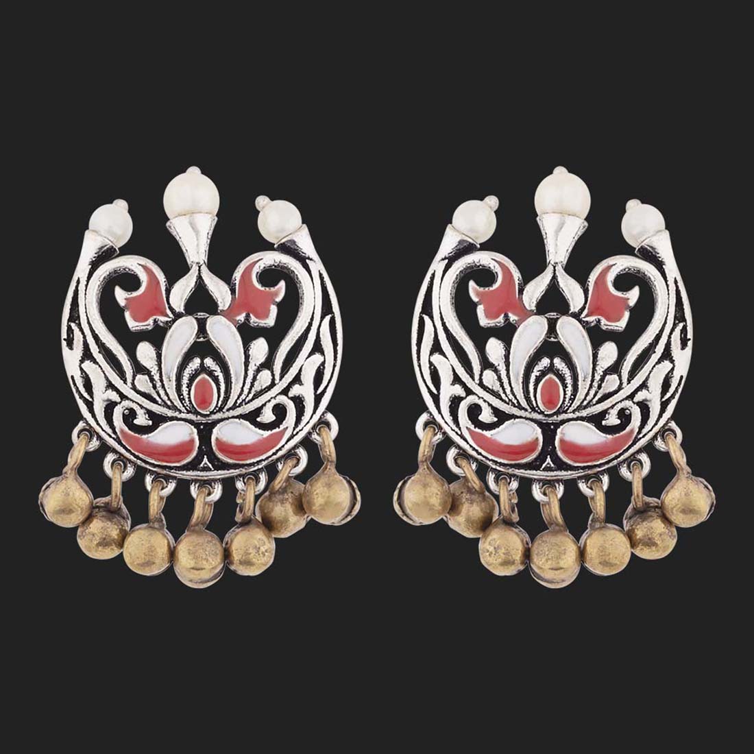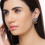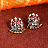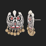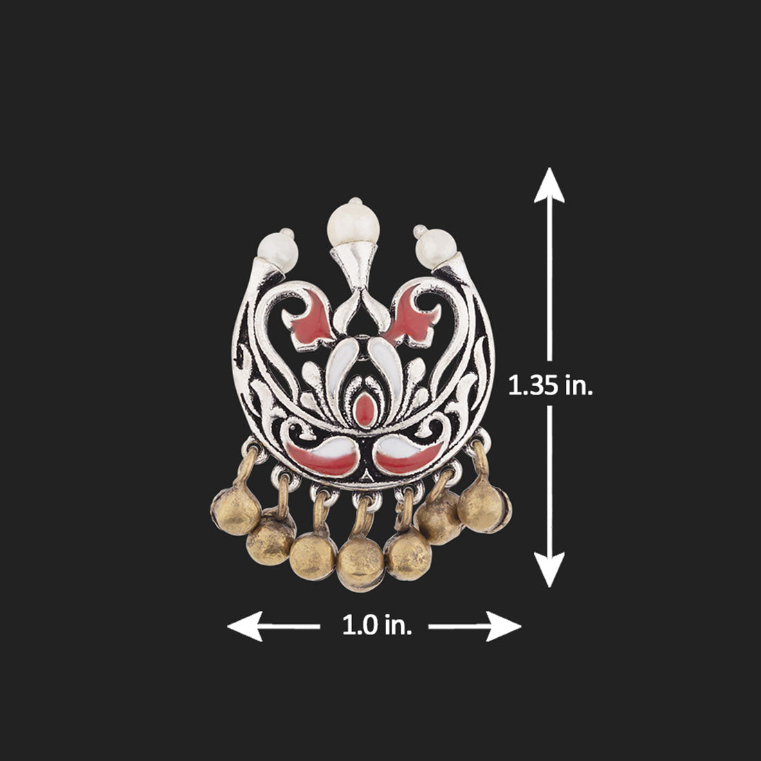 The art and culture of Benaras have inspired these paisley and flowers earrings, which have been crafted from brass. Enameled and mini ghungroos embellished, the oxidised silver plated pair can be worn with casual ethnic and Indo-Western attire.