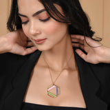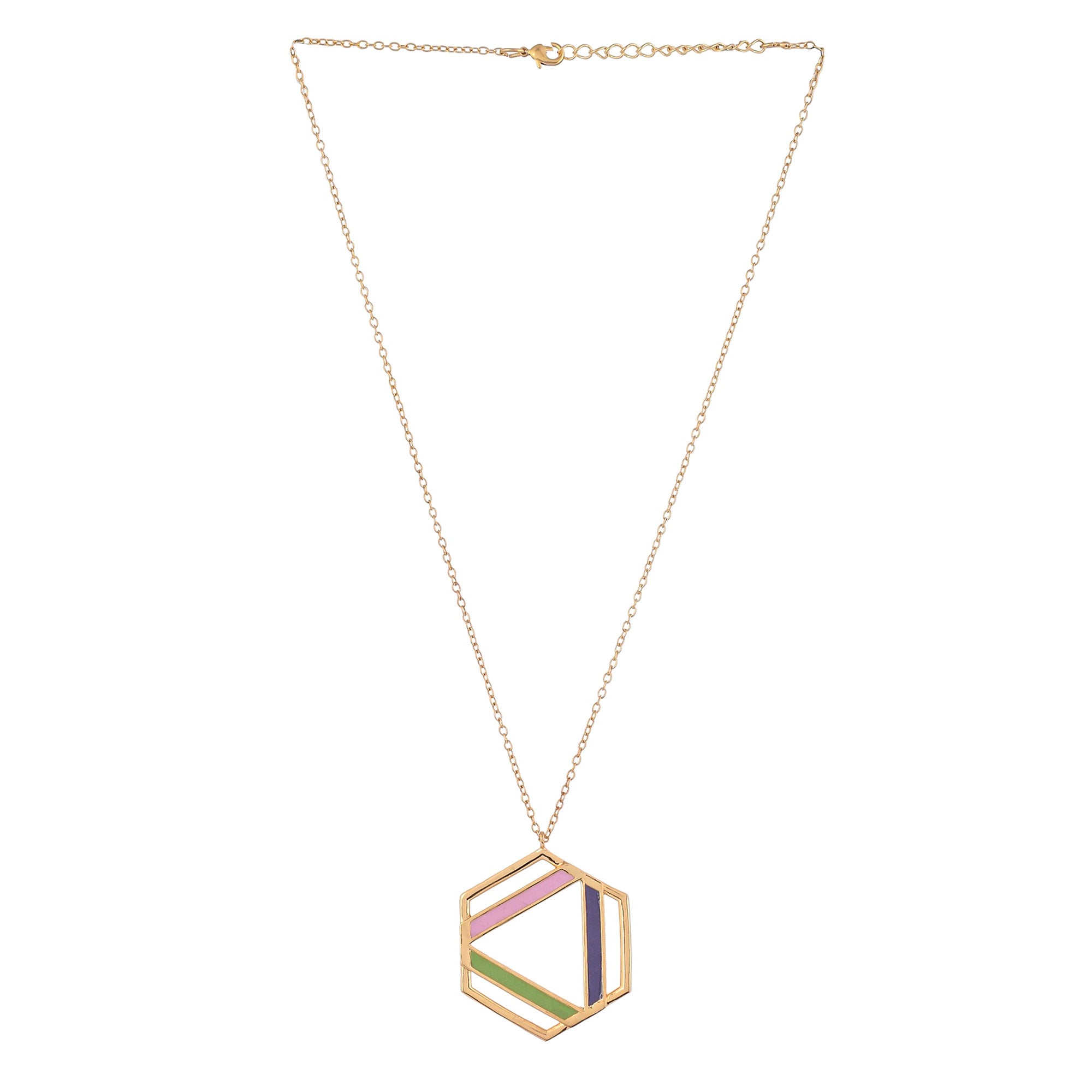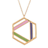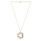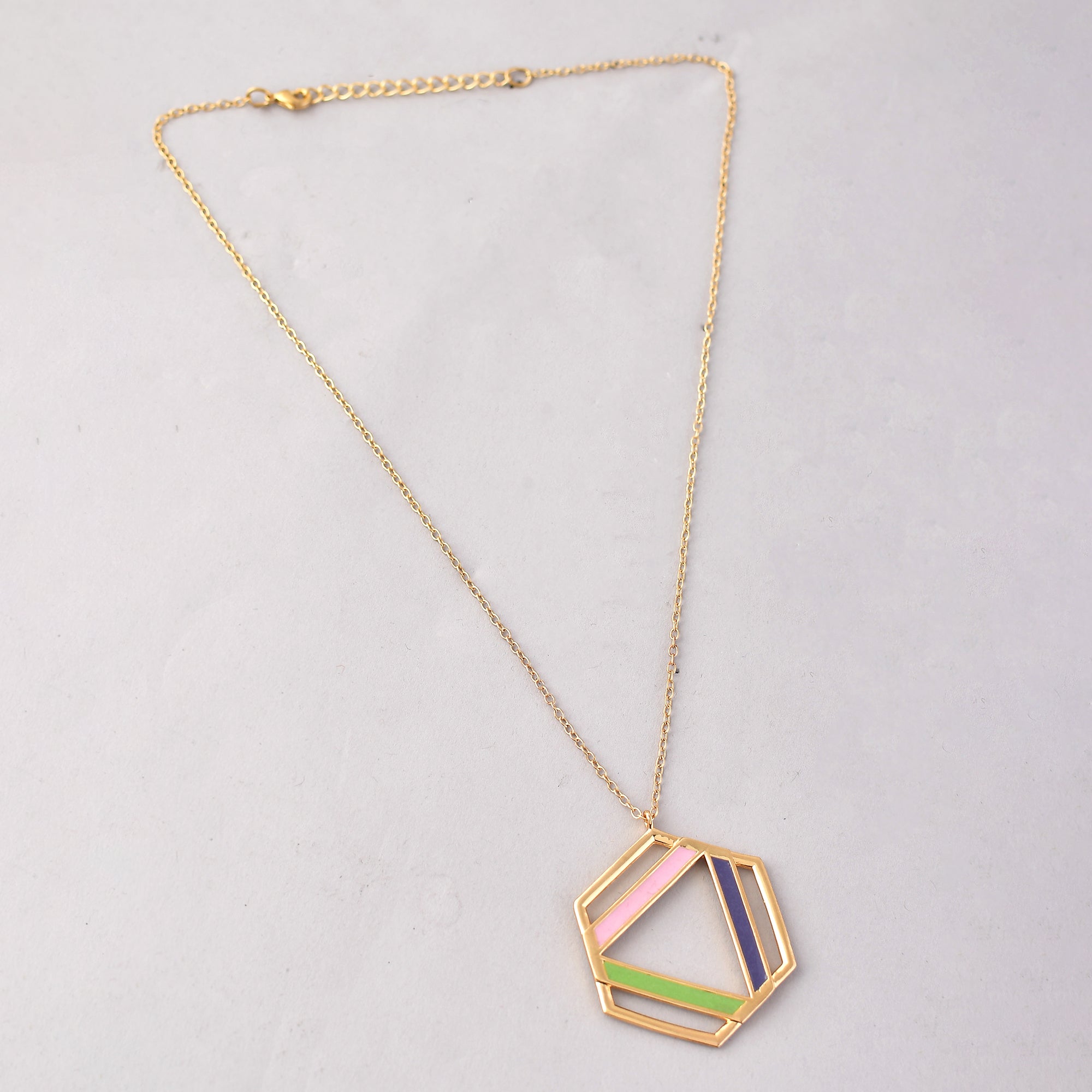 Inspired by the Benzene ring structure, this long necklace with a large pendant has been fashioned out of brass. Gold plating and enamel add to the charm of this versatile and lightweight piece.