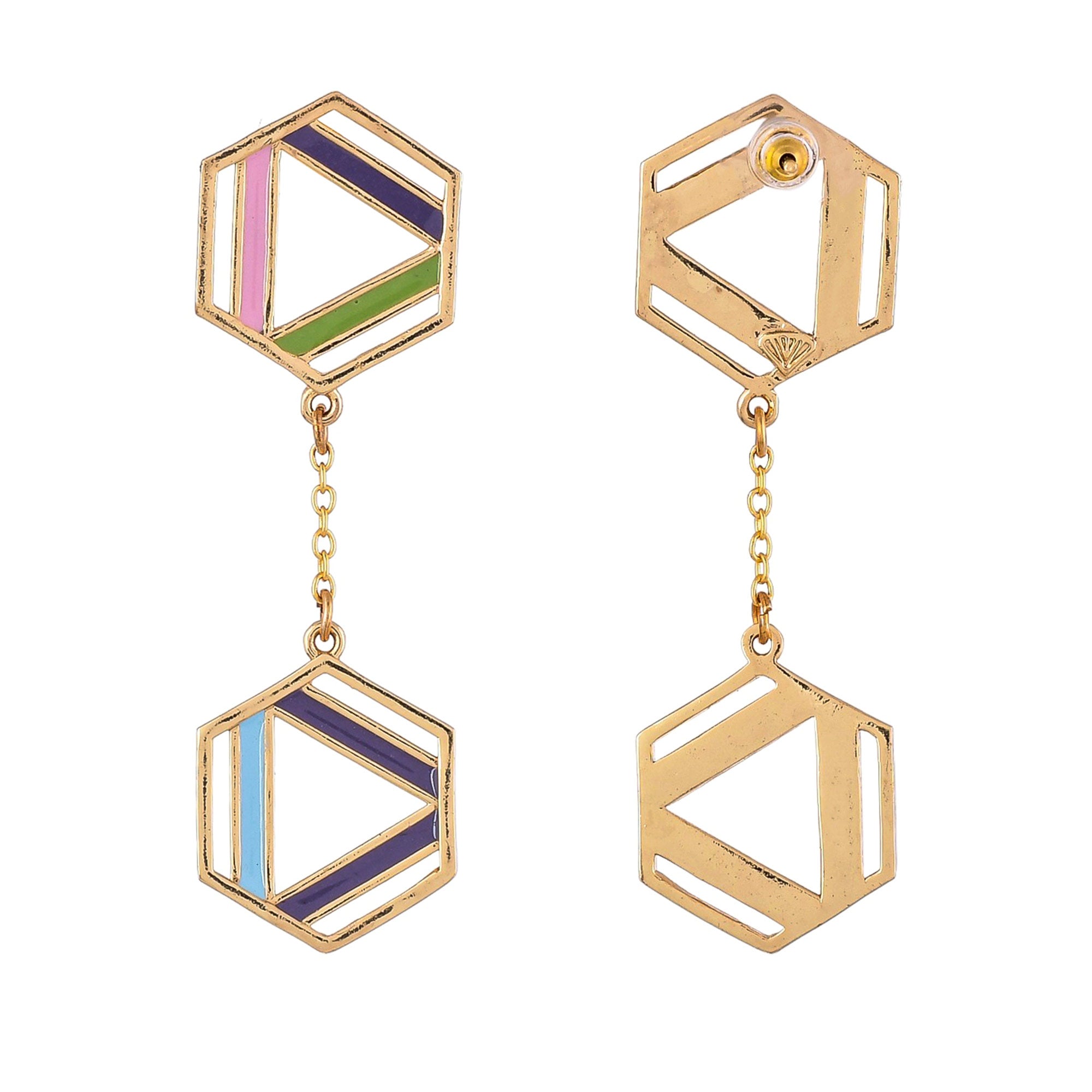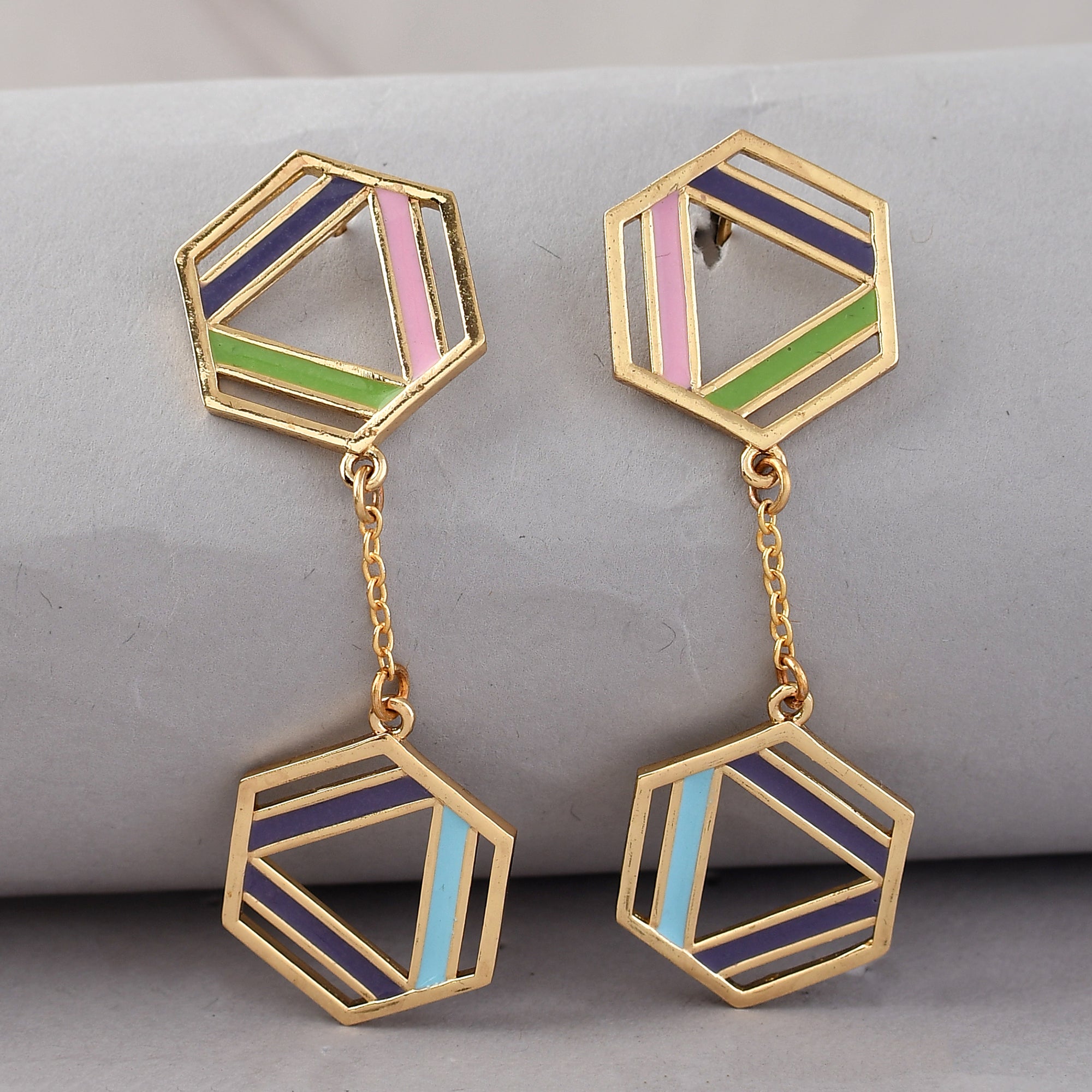 The structure ring of Benzene has inspired these layered drop earrings, which have been fashioned out of brass and gold plated. The fun and quirky enamelled pair is versatile and lightweight.
