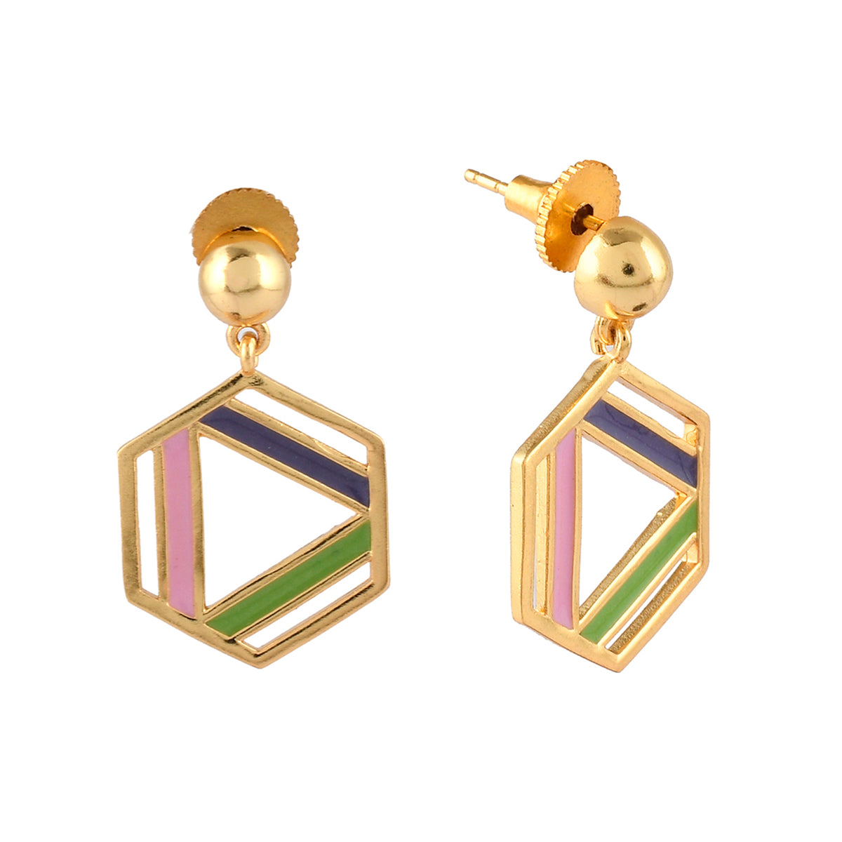 Casual drop earrings featuring a hexagon design, inspired by the molecular structure of Benzene. The enamelled pair has been fashioned out of brass. Gold plated and lightweight, the earrings are versatile enough to be paired with a wide range of looks.