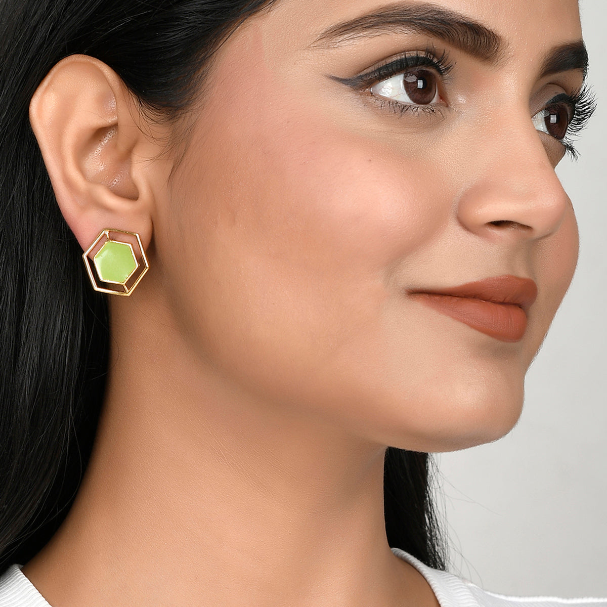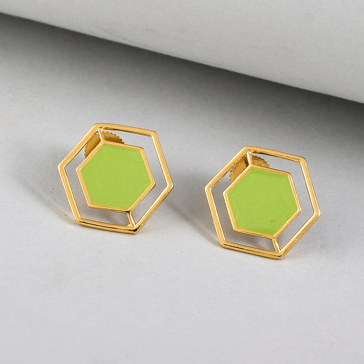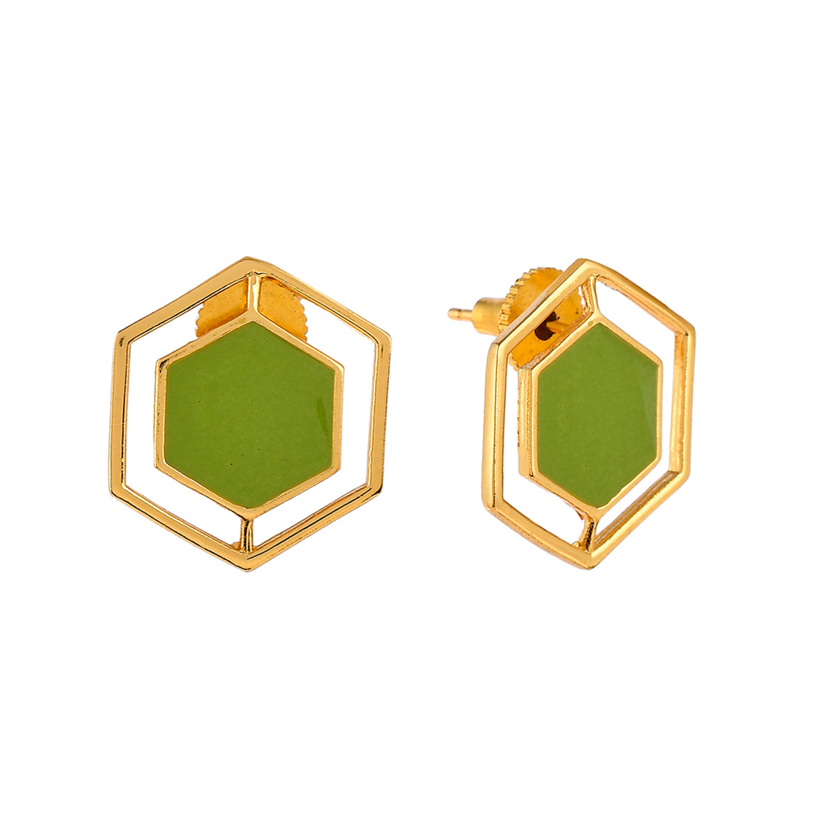 Benzene Gold Green Enamel Hexagon Stud Earrings