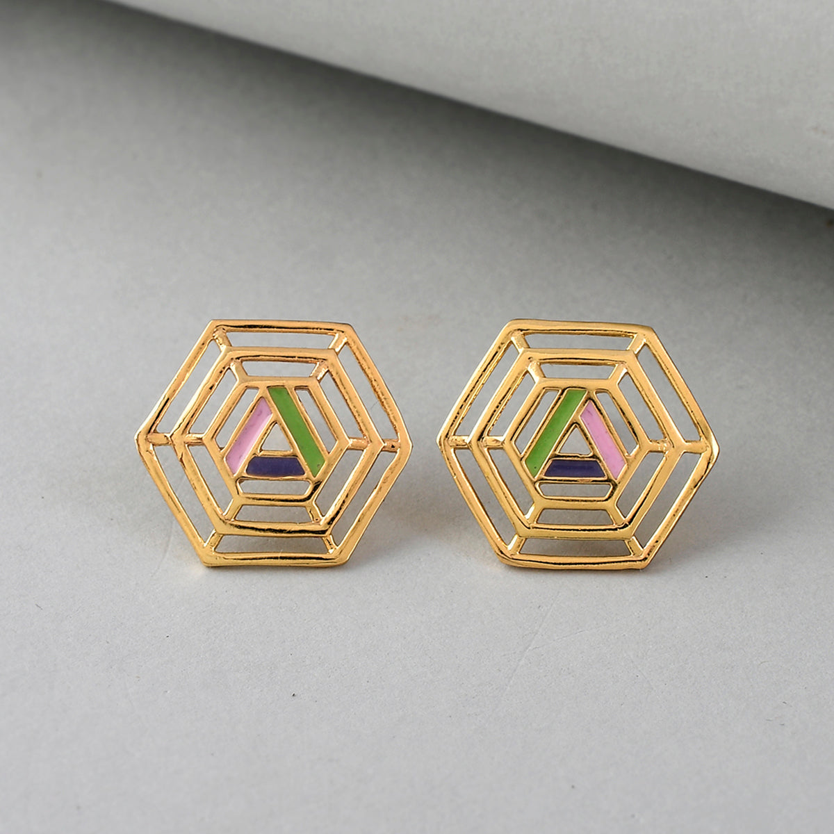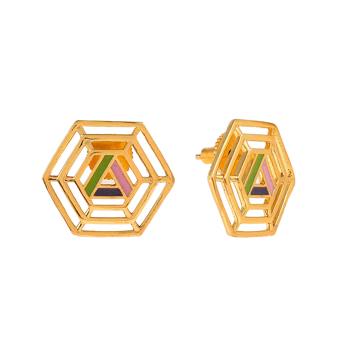 Inspired by the Benzene compound's molecular structure, these hexagon stud earrings have been fashioned out of quality brass. Gold plated and enamelled, the lightweight pair is versatile enough to be paired with just about everything.