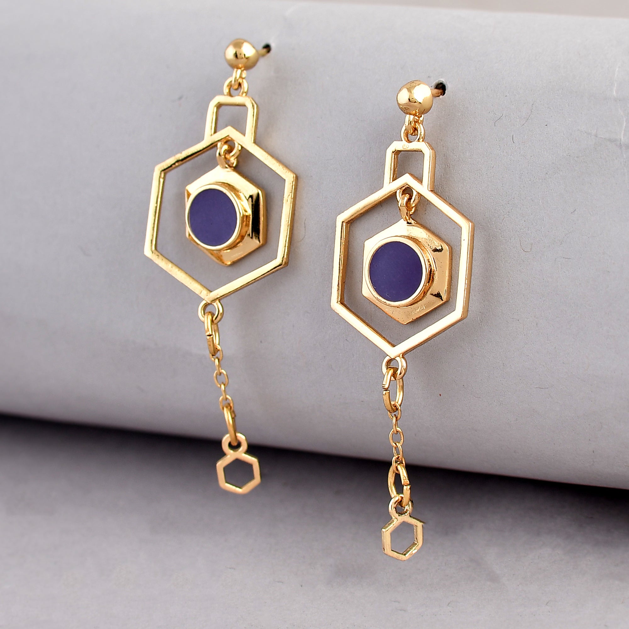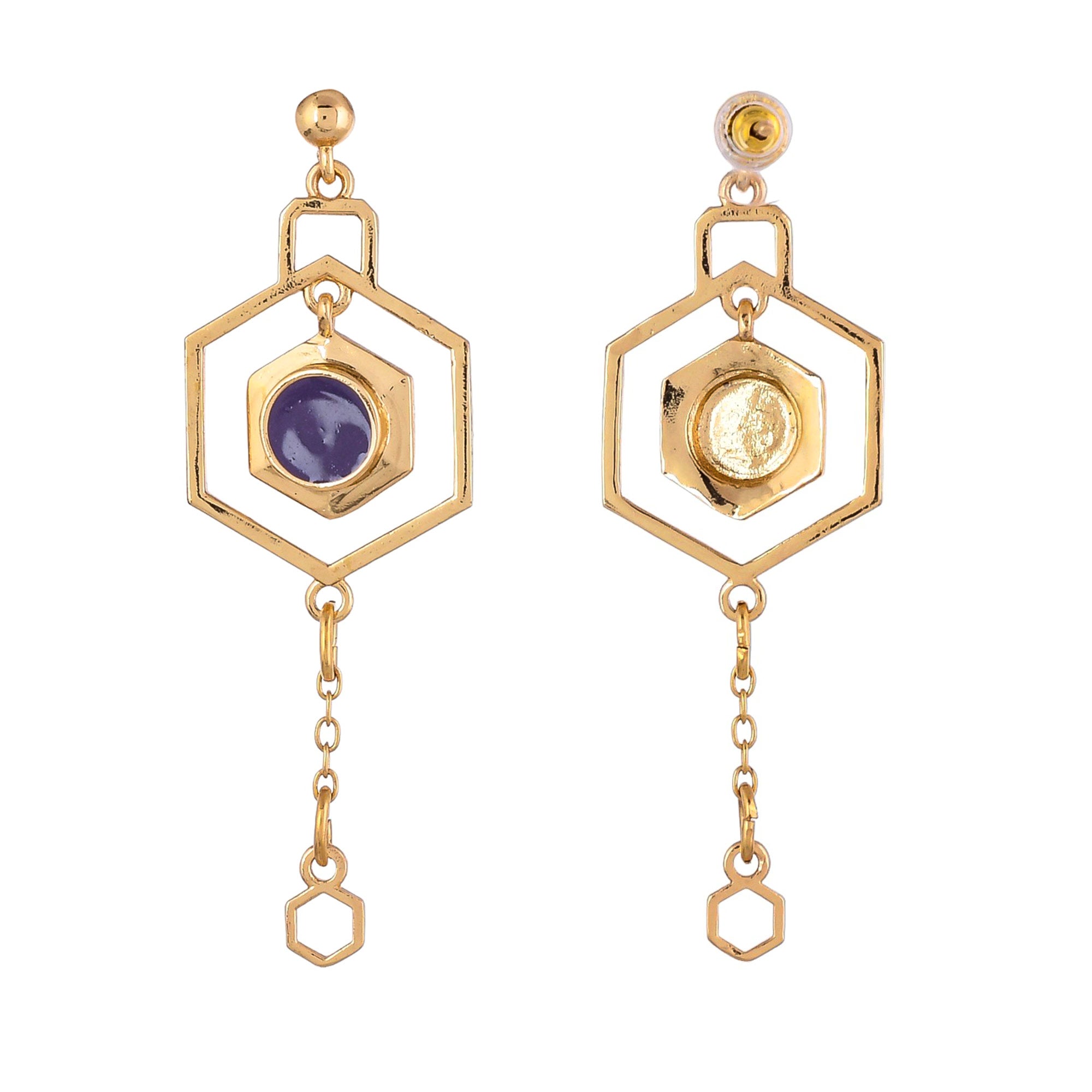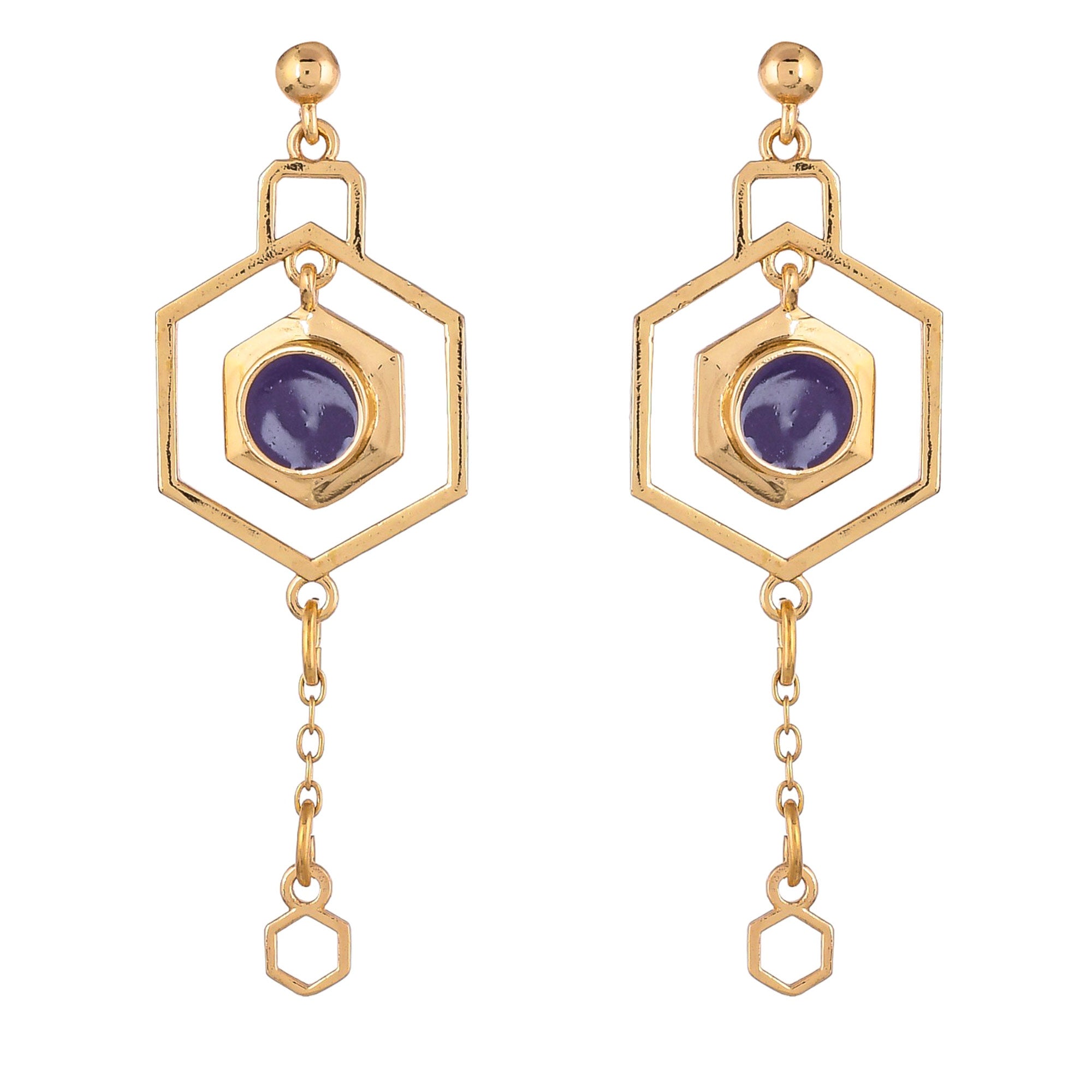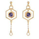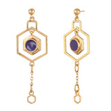 Inspired by the ring structure of Benzene, these contemporary design drop earrings have been crafted from brass. Gold plated and embellished with purple gems, the earrings can be paired with just about everything.