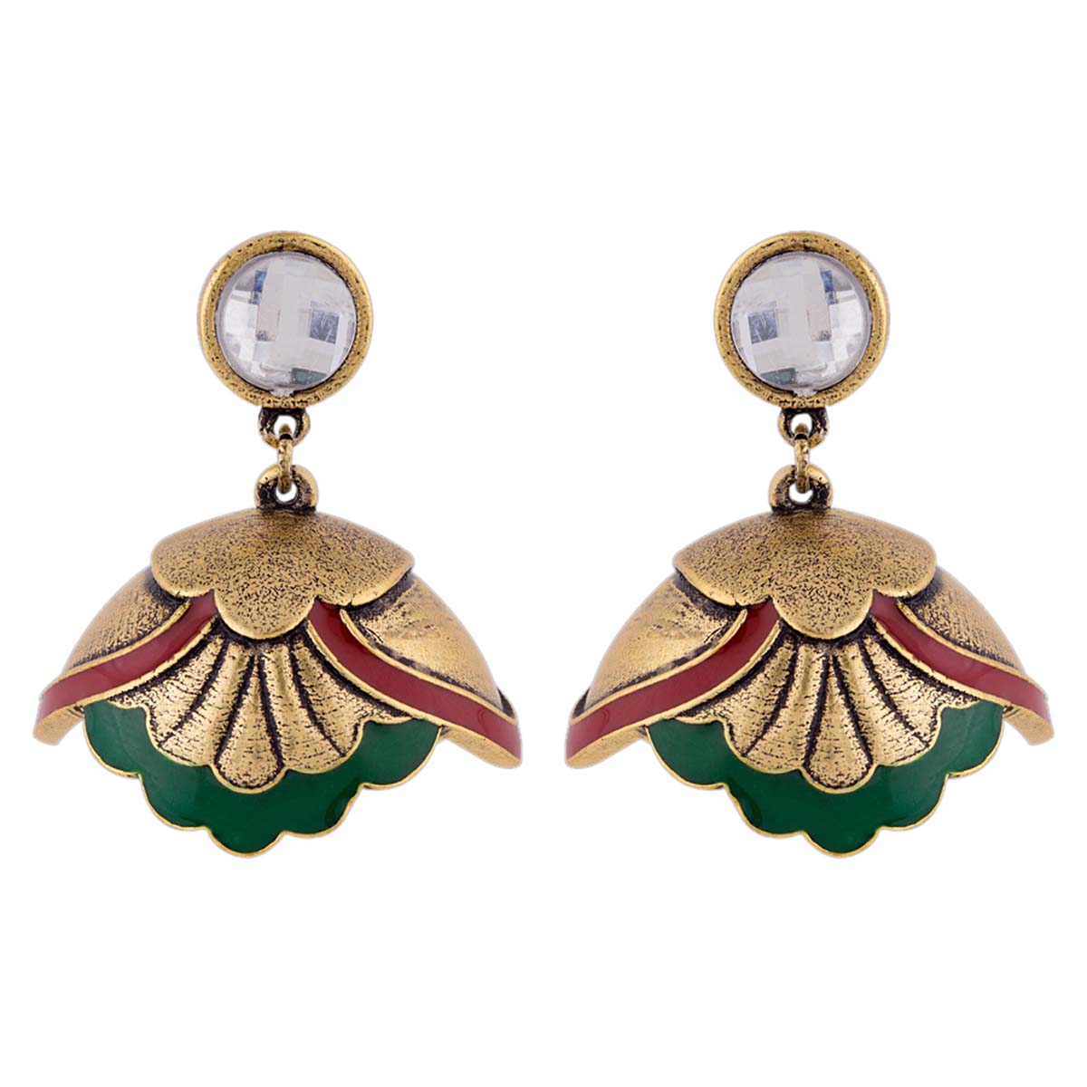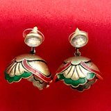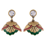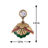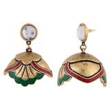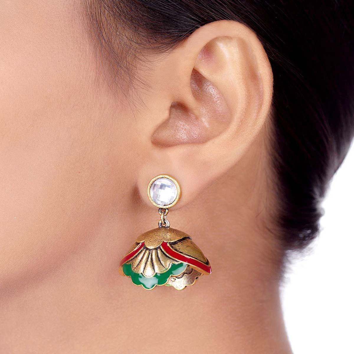 Floral style earrings fashioned after patterns and designs found on traditional Bharatnatyam attire. Embellished with gems and red and green enamel details. Made from brass and dye gold plated. Match with a casual kurta.