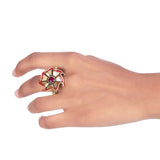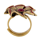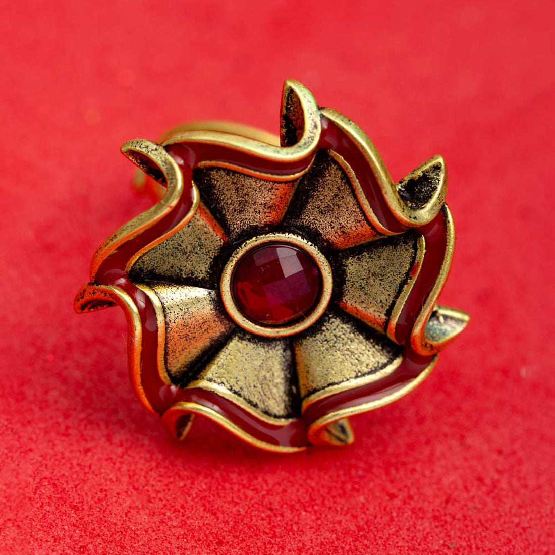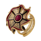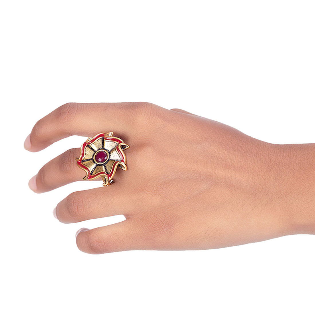 Brass finger ring with a pleated and floral pattern, inspired by the traditional dress worn during Bharatnatyam performances. Red stone and enamel embellished and dye gold plated. Pair with any of your favourite outfits. This piece of jewelry comes with the Voylla assurance of quality and durability.