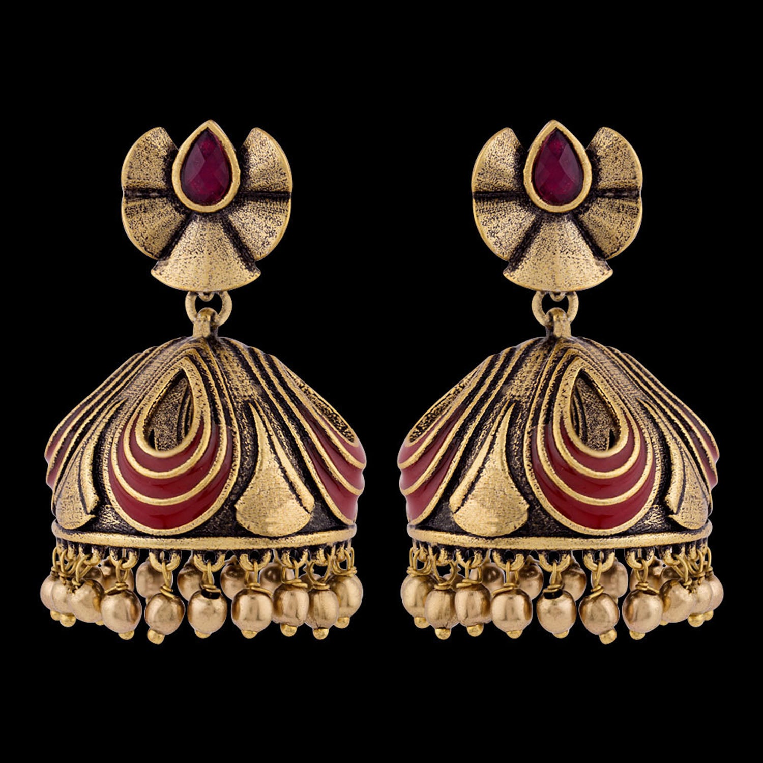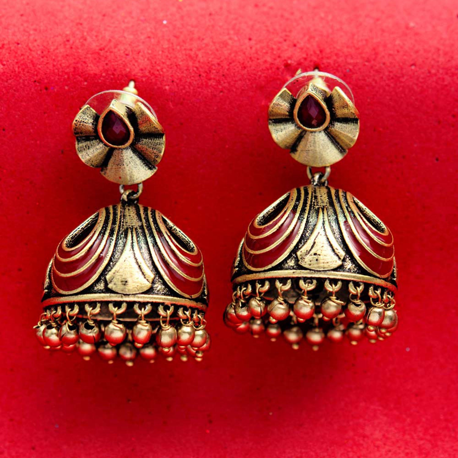Graced with red stones and tiny metal embellishments, the Bharatnatyam dresses inspired earrings have been crafted from brass. Wear the earrings with a salwaar suit or saree, or even an Indo-Western tunic.
