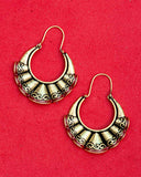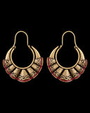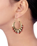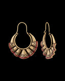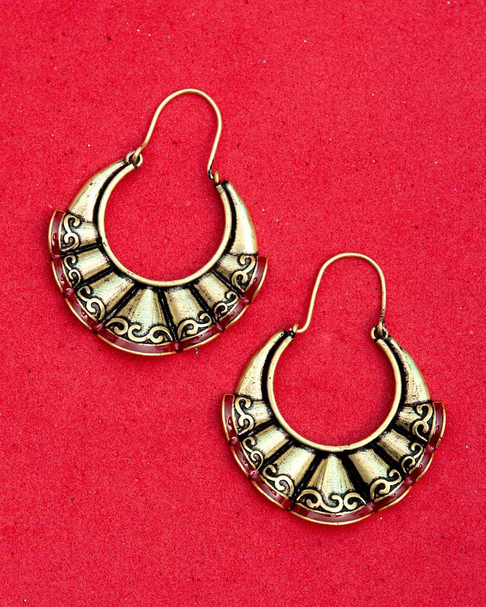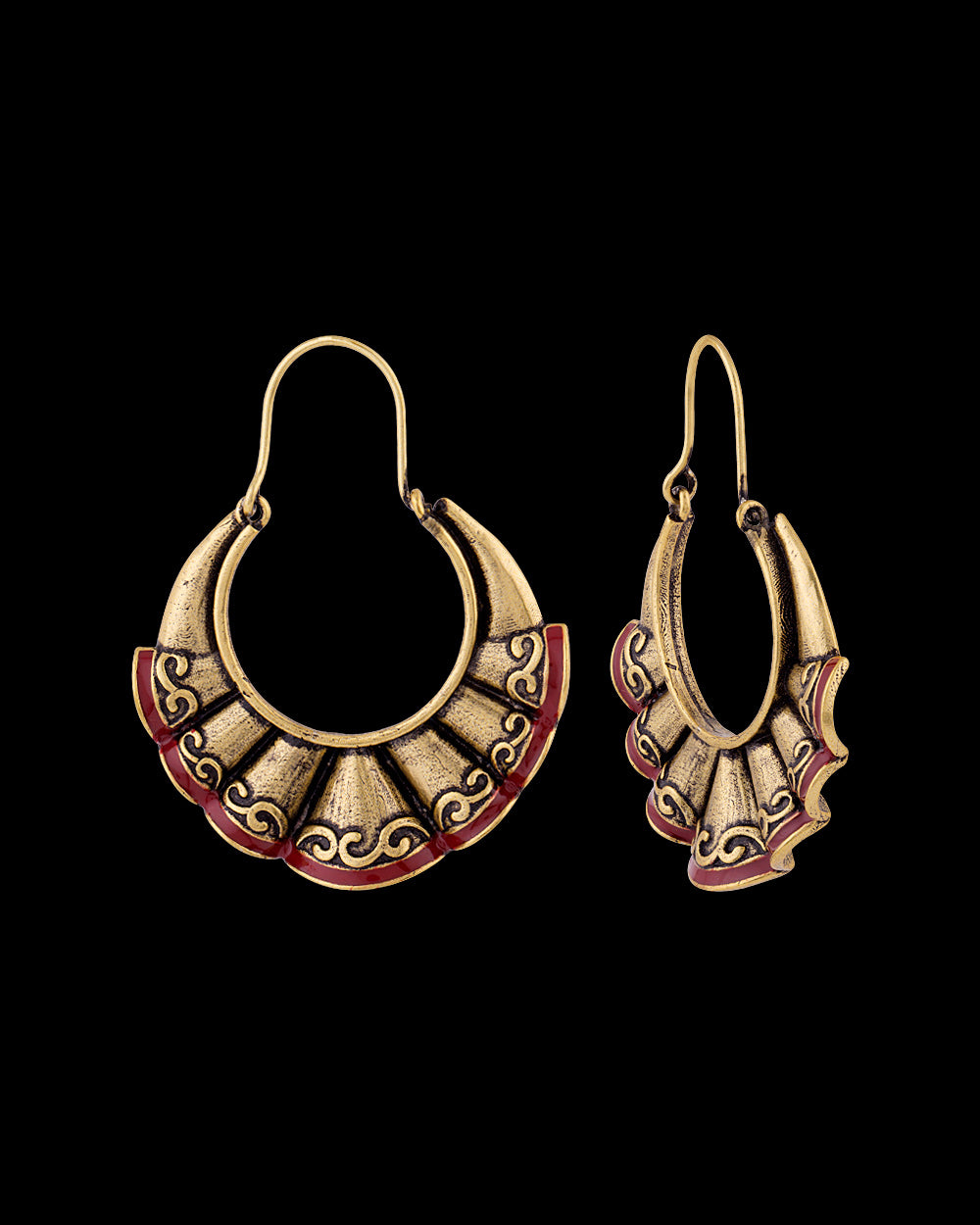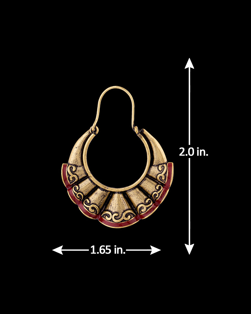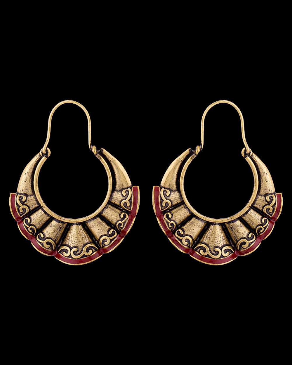 Hoop earrings with a pleated pattern fashioned after Bharatnatyam outfits. Made from brass and dye gold plated. Lightly embellished with red enamel and a perfect match for Western dresses.