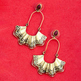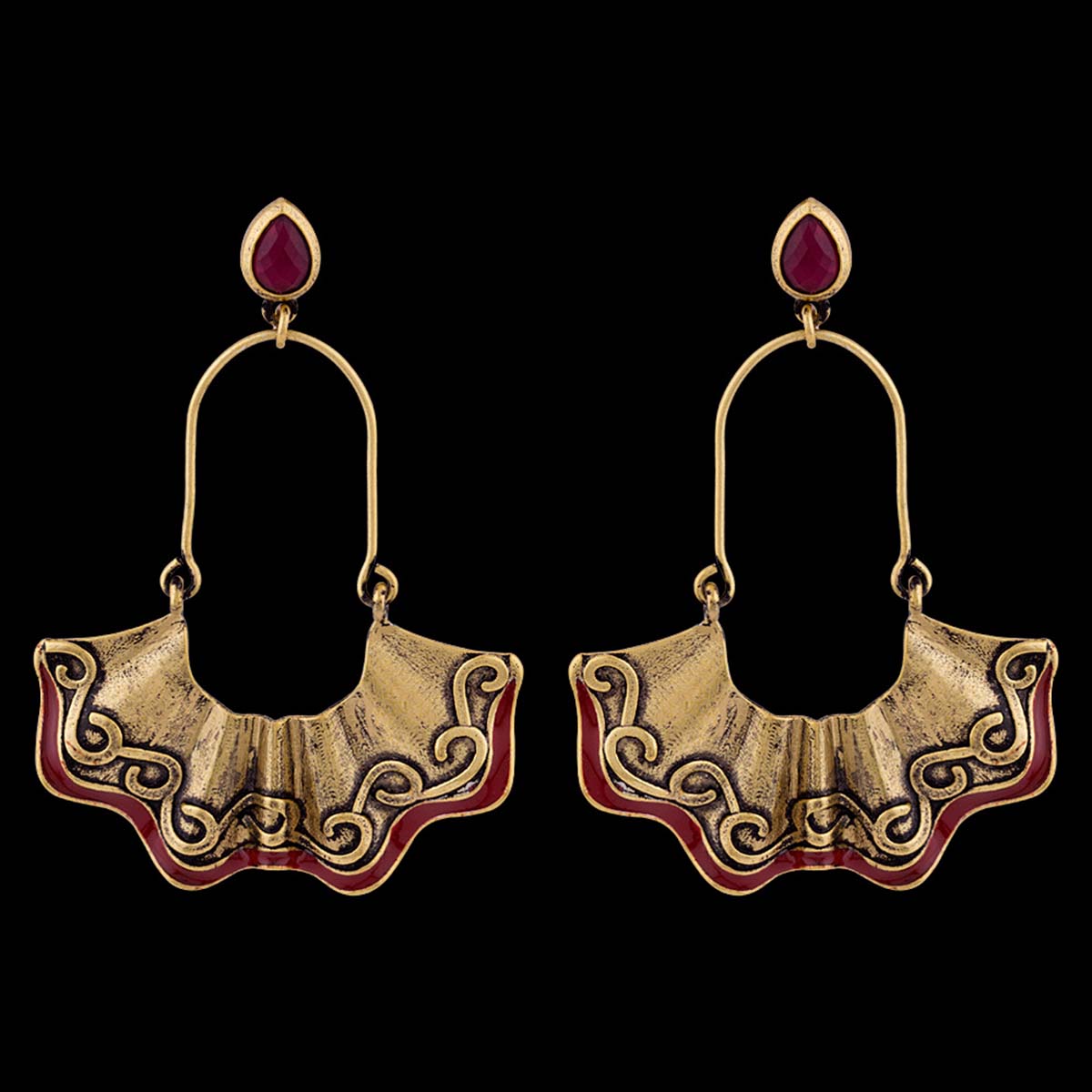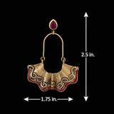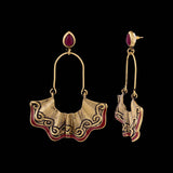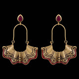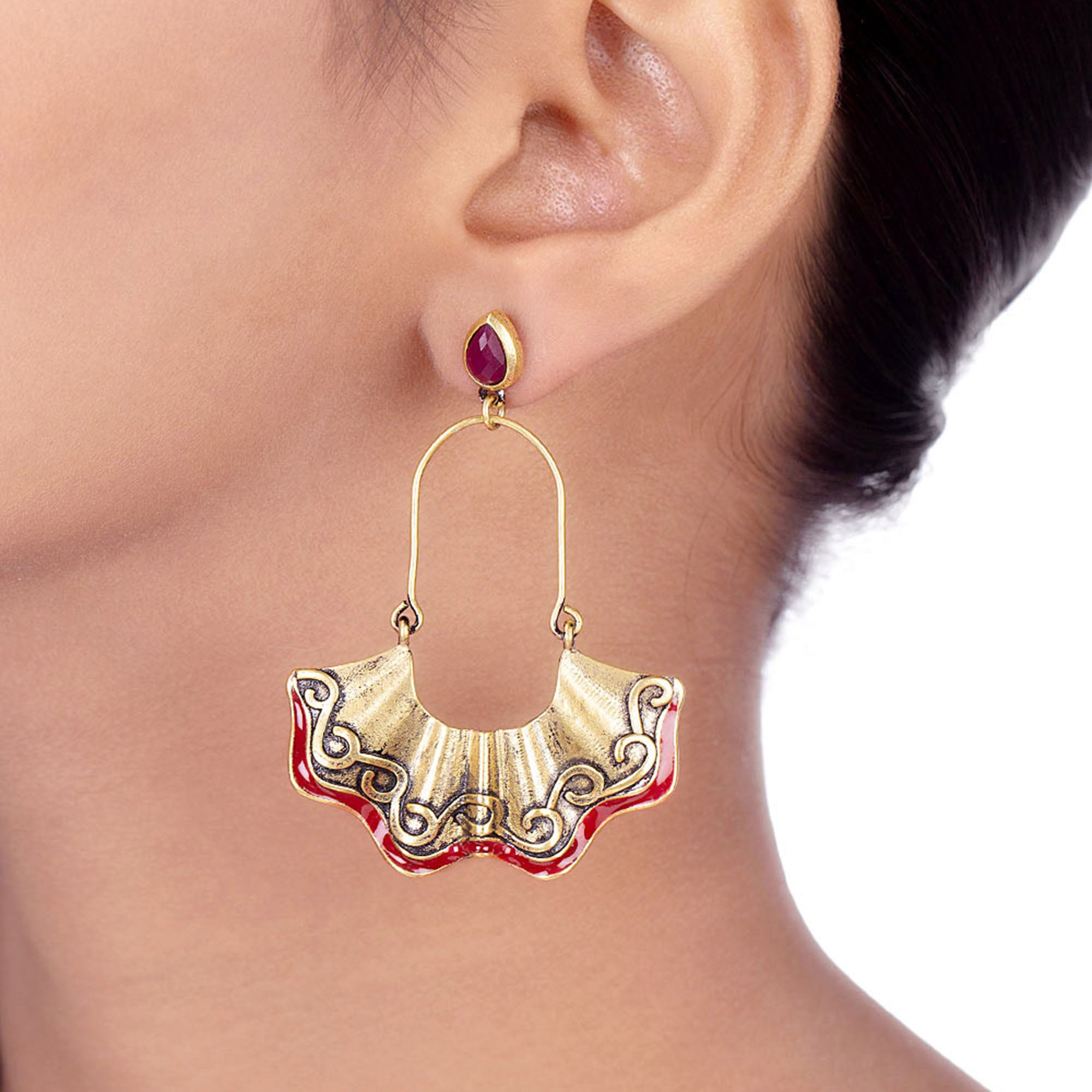 Fashioned into a pleated design, inspired from classic Bharatnatyam dresses, these earrings have been crafted from brass. Featuring red gemstones and enamel details and dye gold plated. Wear with a summer dress.