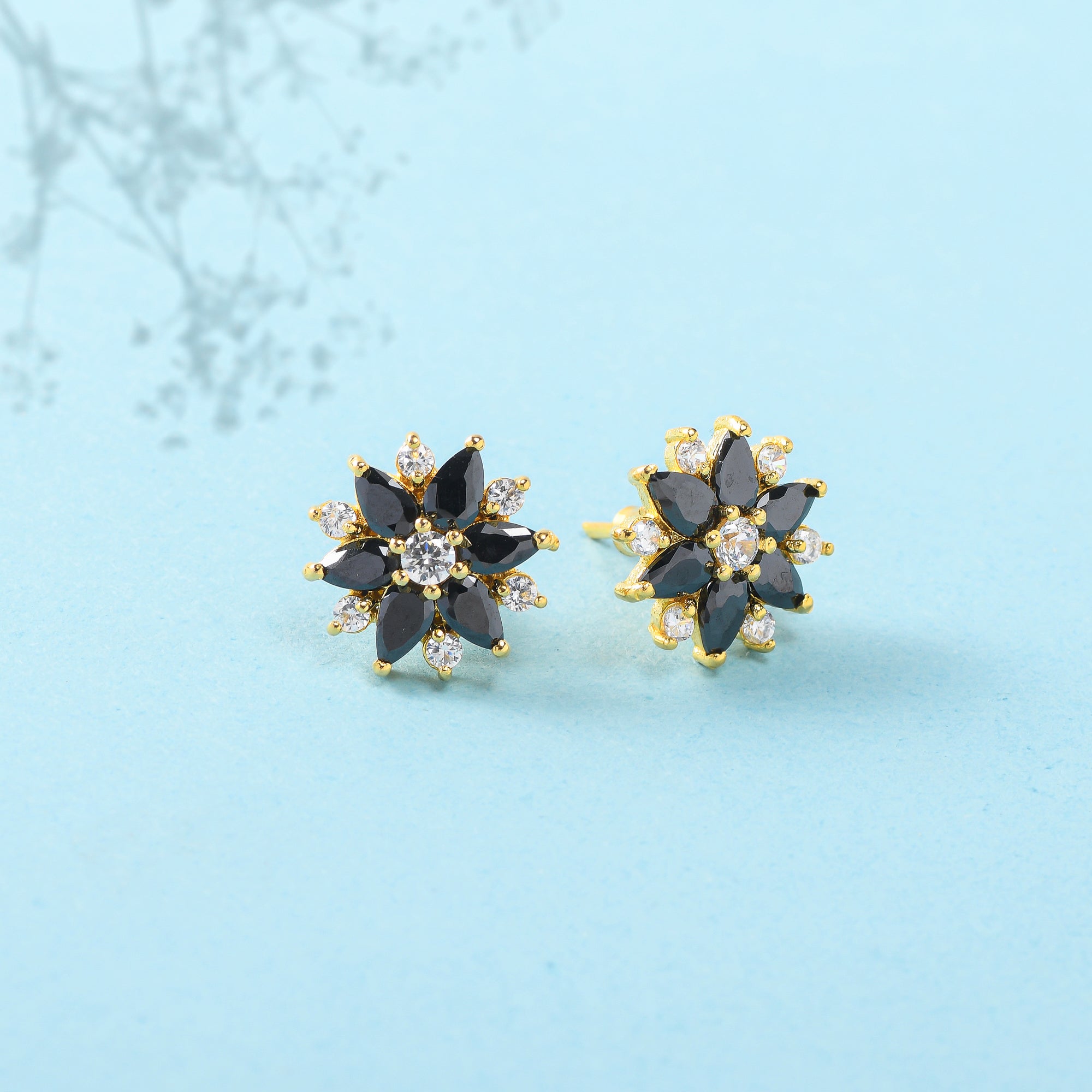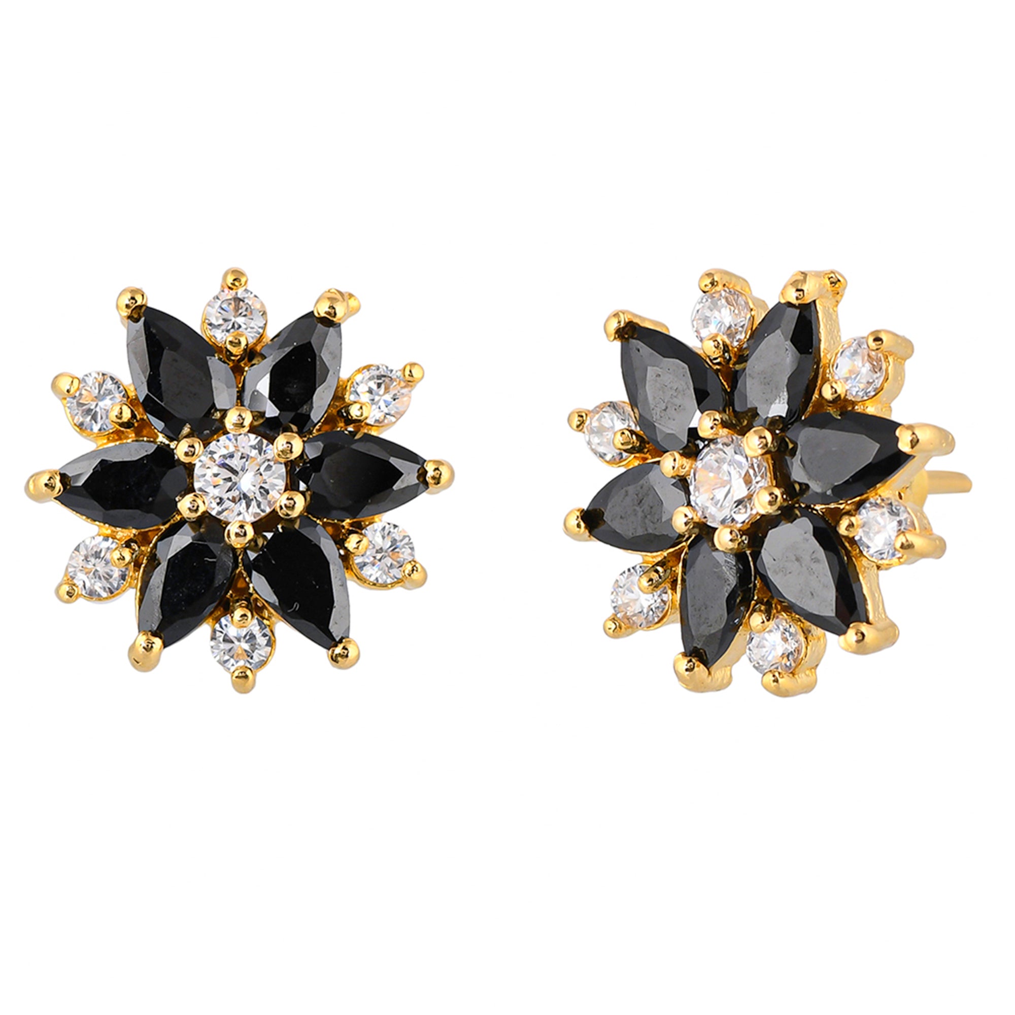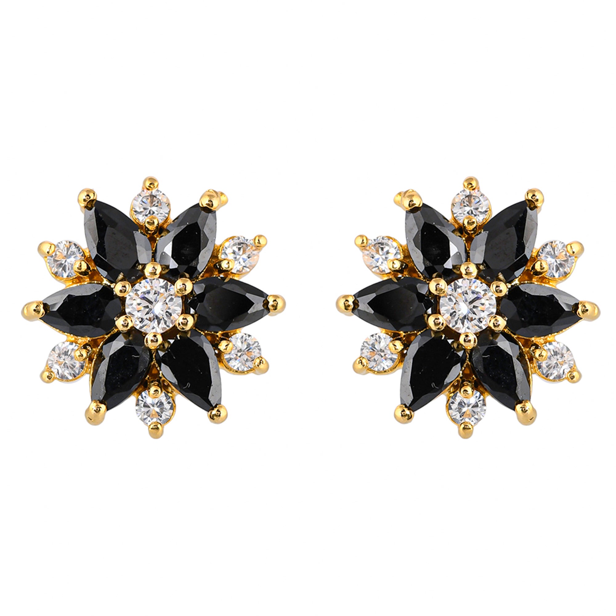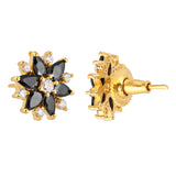 Black and white cluster setting CZ adorned brass stud earrings. Gold plated and a good match for everyday looks.