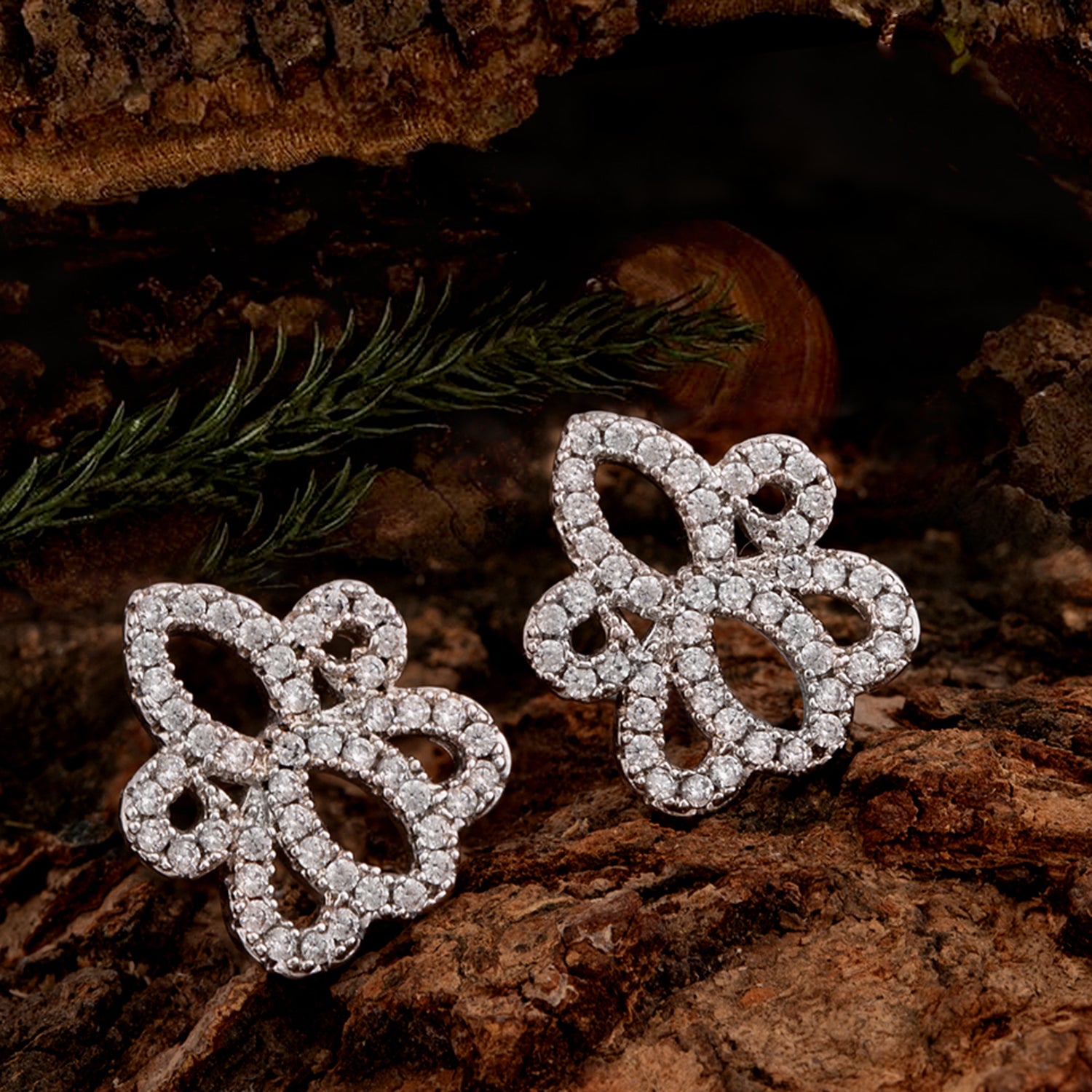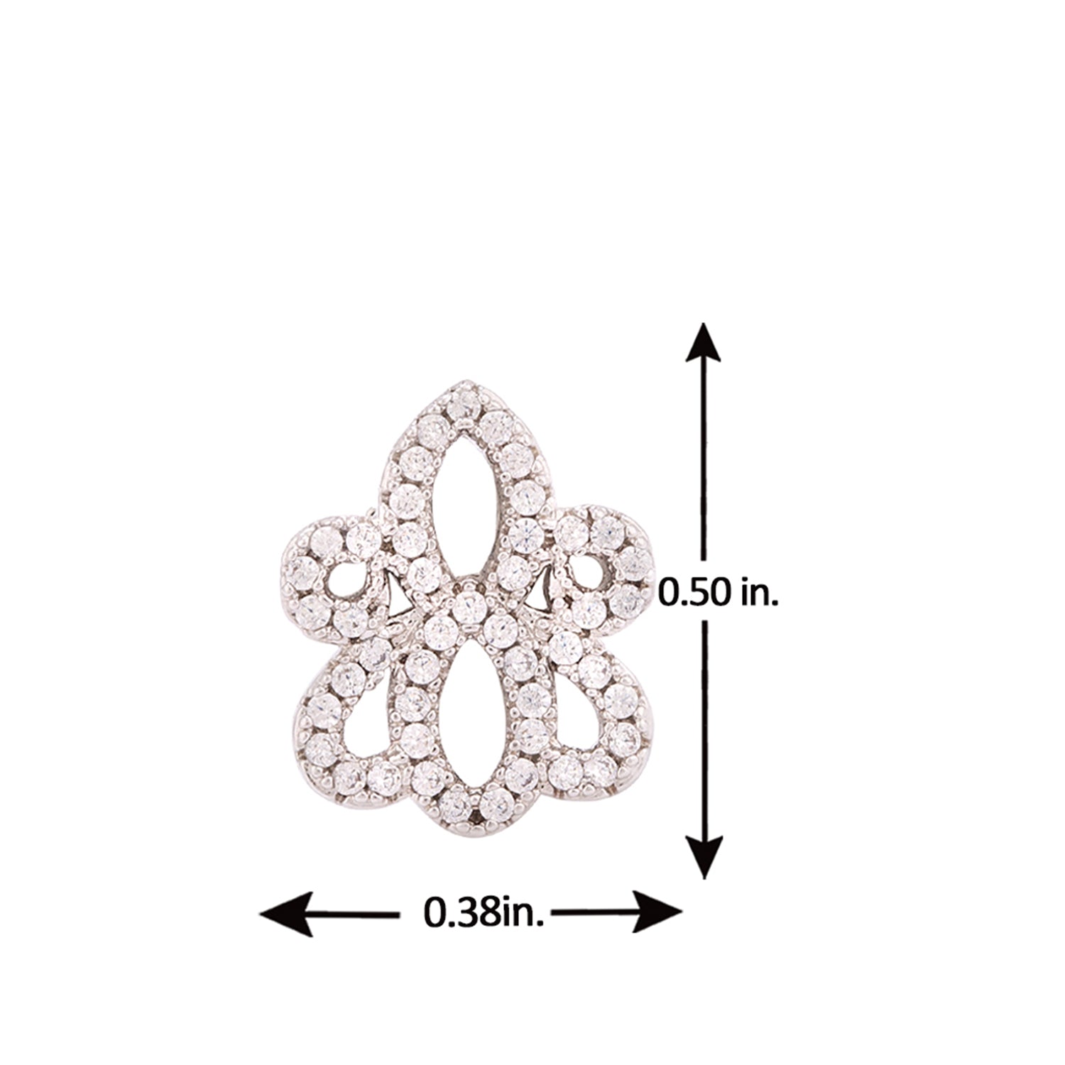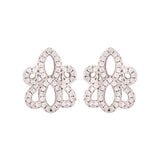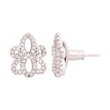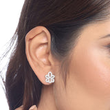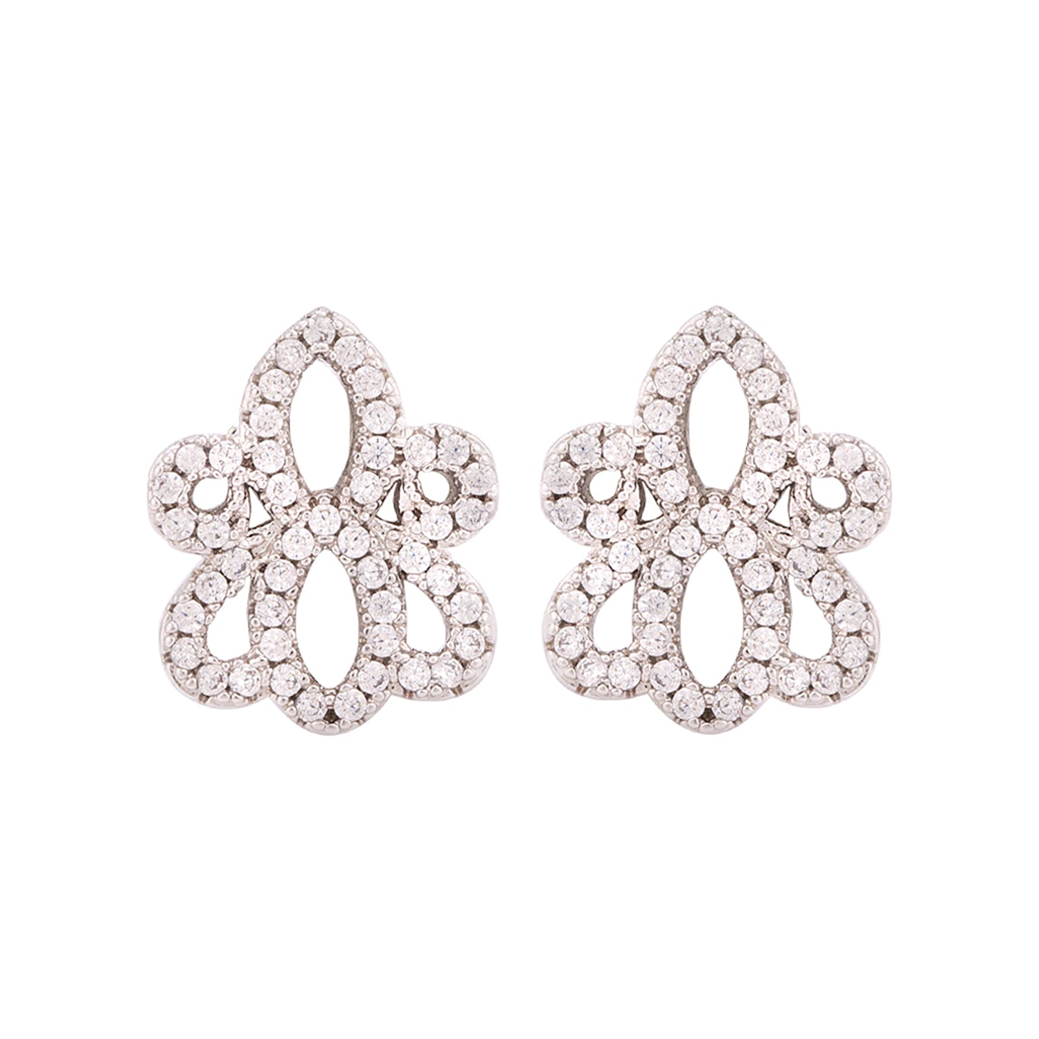 Floral motif stud earrings fashioned out of brass. Silver plated and zircon embellished. Pair with a summer dress or cocktail gown.