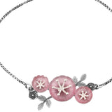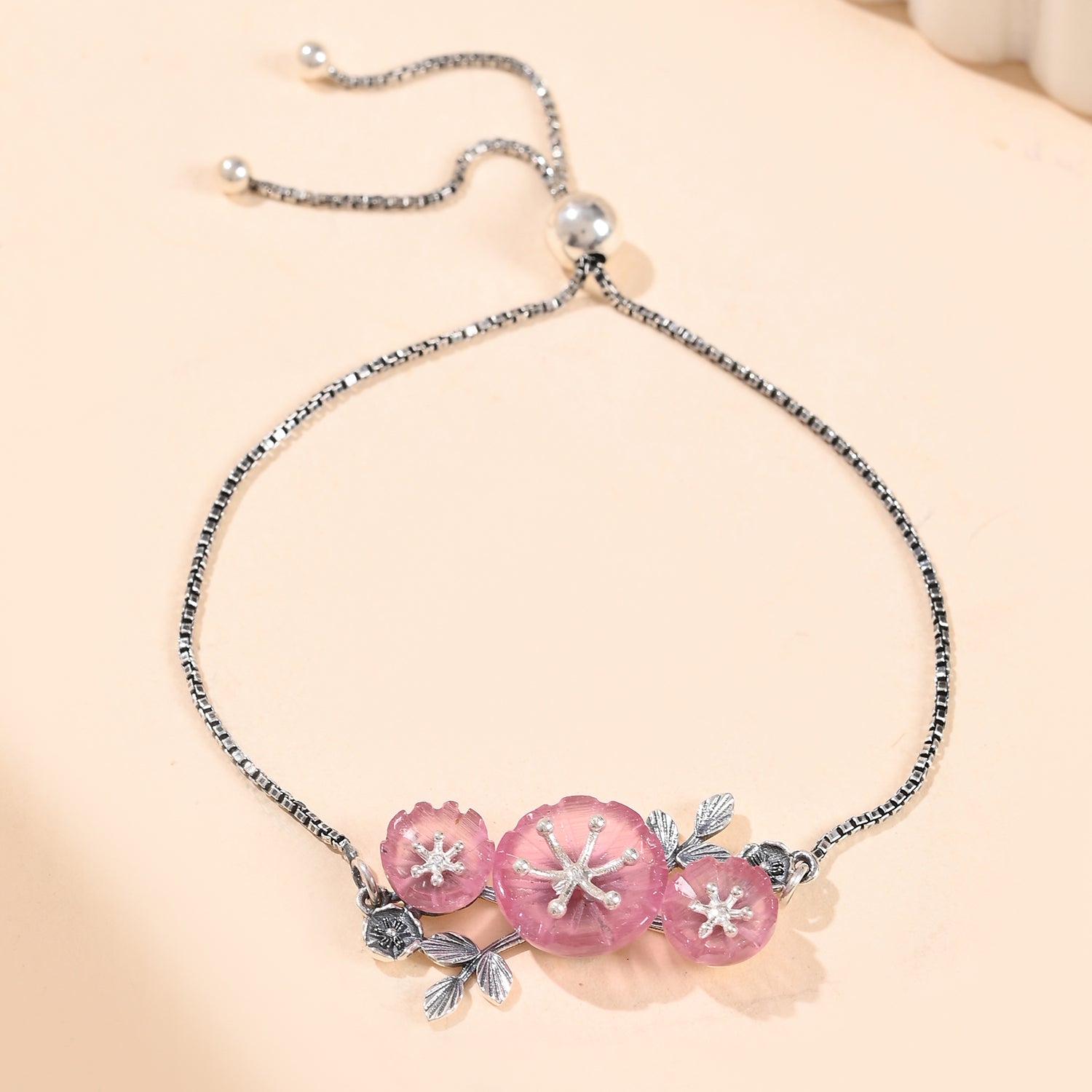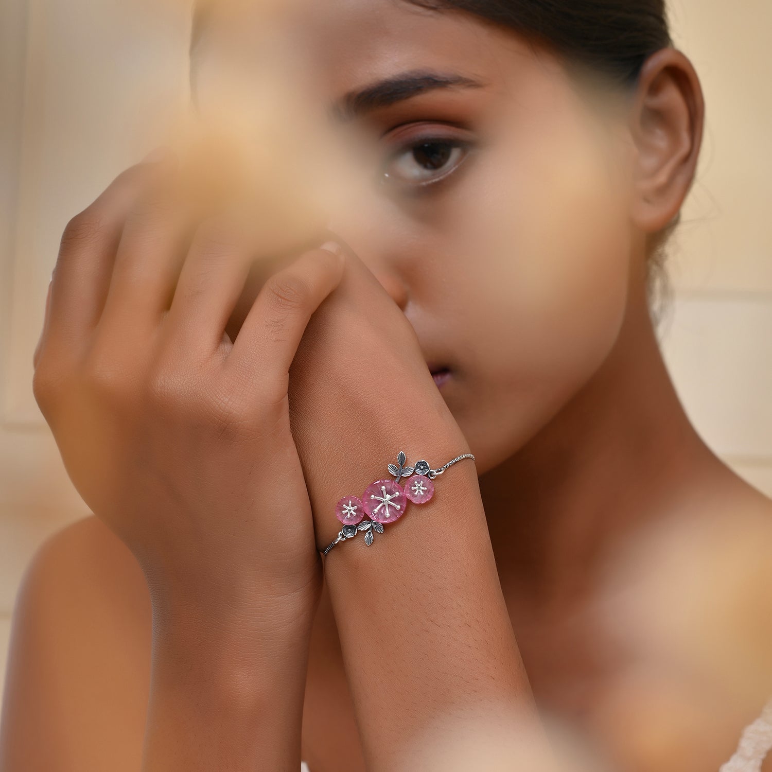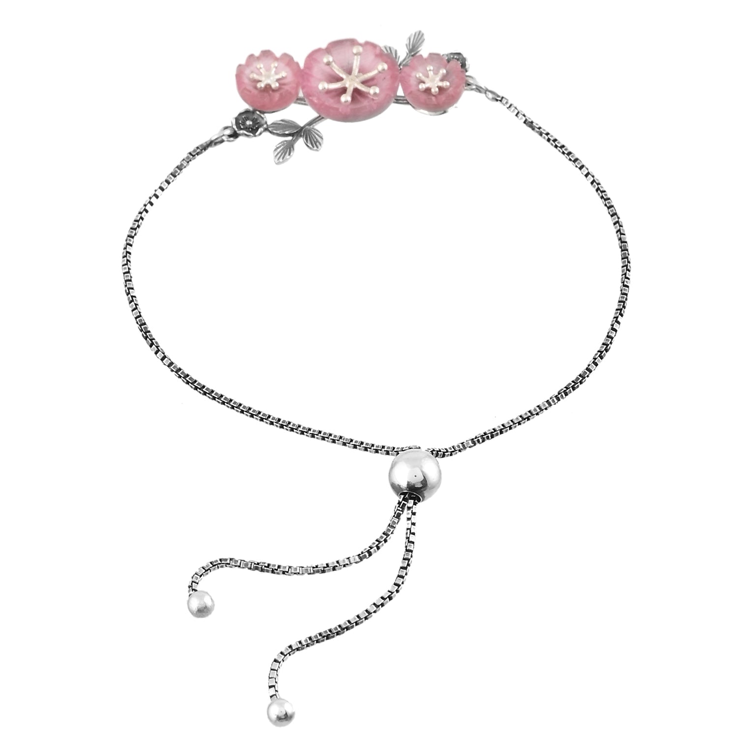 The Bloom 925 Sterling Silver Mio Bracelet is a stunning piece that captures the essence of nature’s beauty and feminine elegance. Inspired by the delicate cherry blossoms, this bracelet features intricately carved floral stones in a soft pink hue, symbolizing feminine power, mystique, and beauty. The oxidized silver detailing adds a vintage charm, while the pearls at the ends of the adjustable closure enhance its elegance. This bracelet is perfect for the self-driven, fashion-forward woman who loves to make a statement with her chic, elegant, yet bold style. Ideal for everyday wear, office wear, or as a thoughtful gift for special occasions like Diwali, it embodies grace and confidence, making it a timeless addition to any jewelry collection.
