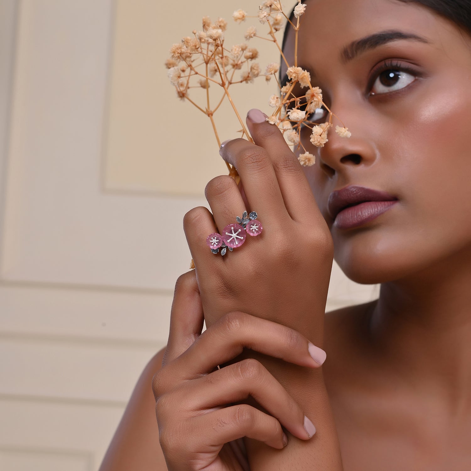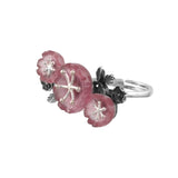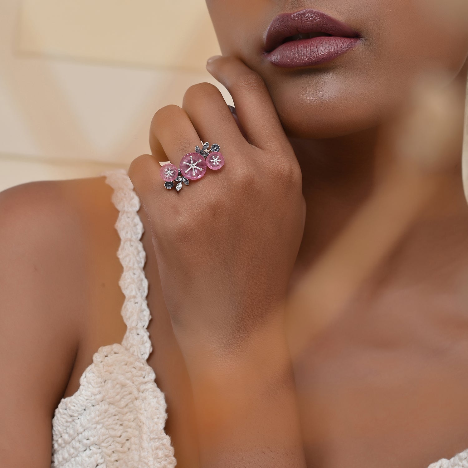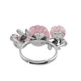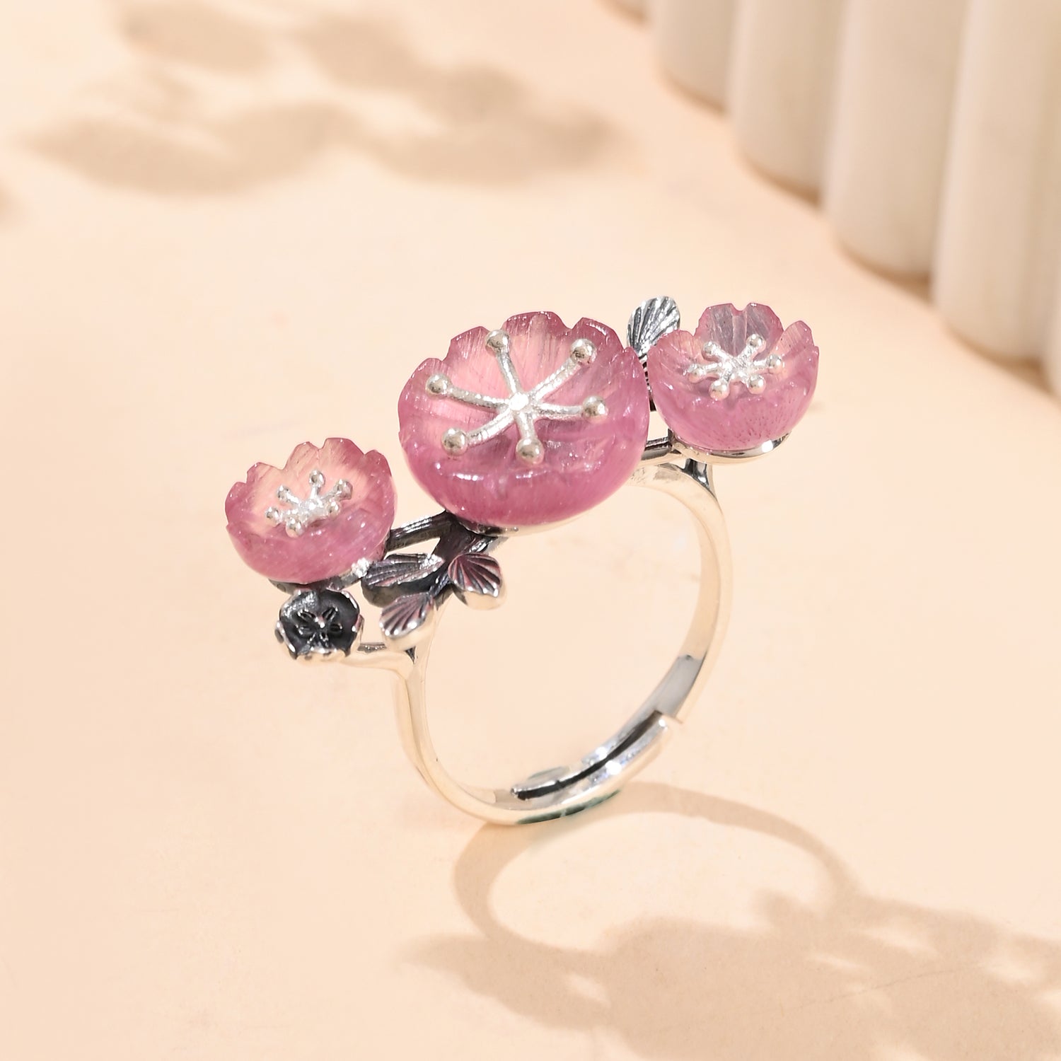 The Bloom 925 Sterling Silver Misaki Ring is a stunning piece of jewelry that captures the essence of nature’s beauty and feminine elegance. Inspired by the delicate cherry blossoms, this ring features a meticulously hand-carved floral stone that sits gracefully on an oxidized silver band. The intricate design of the flower, with its lifelike petals and central stamen, is complemented by the band that branches out into smaller stems and leaves, creating a harmonious blend of nature and artistry. This ring is perfect for the self-driven woman who values individuality and confidence, making it an ideal accessory for any occasion, whether it’s everyday wear, office wear, or a special gift for a loved one. The timeless appeal of floral motifs ensures that this piece remains a cherished addition to any jewelry collection
