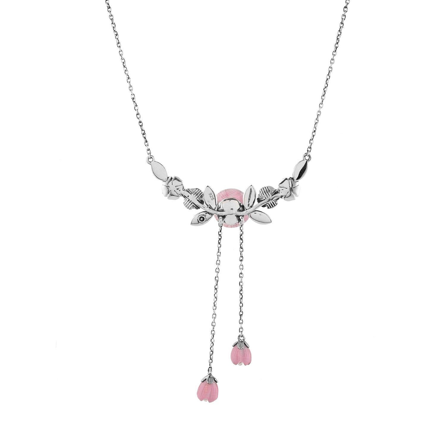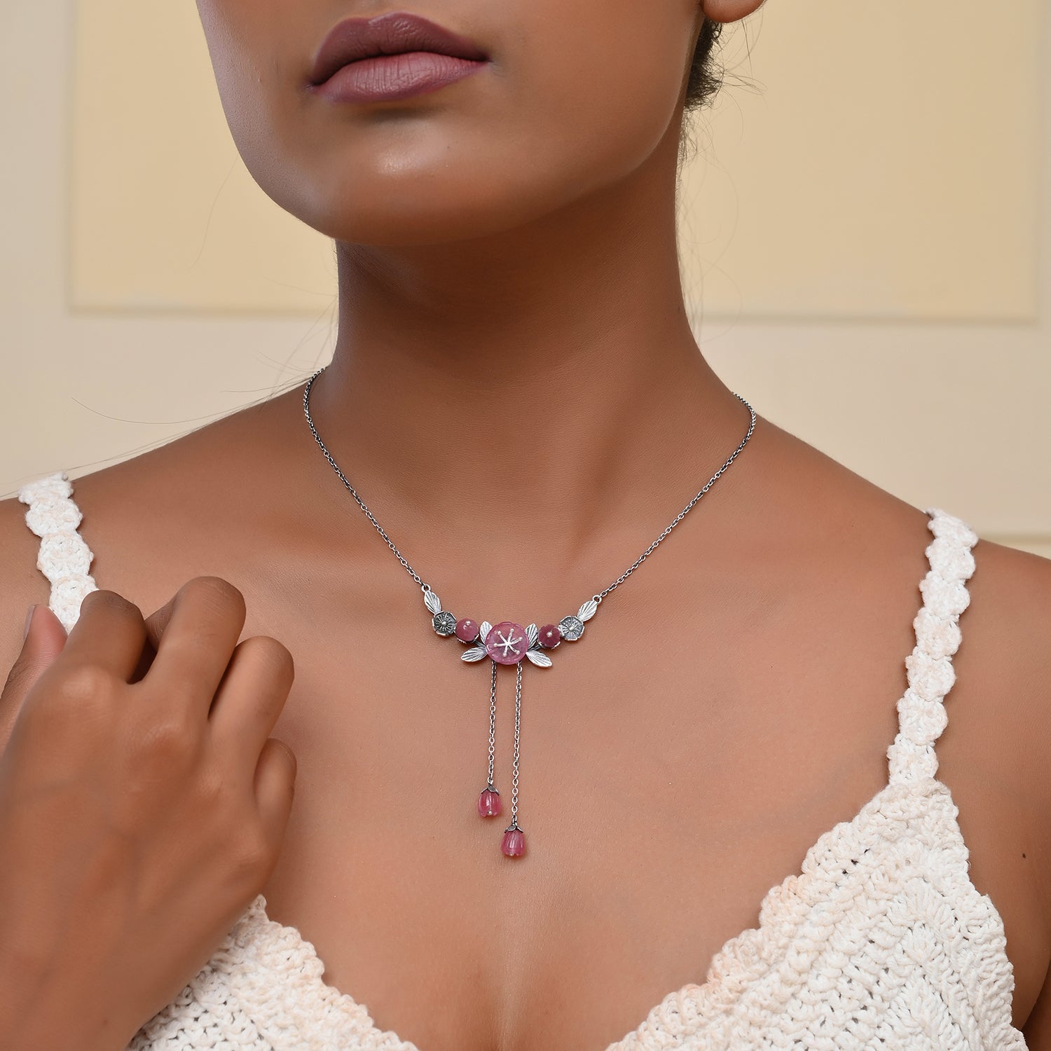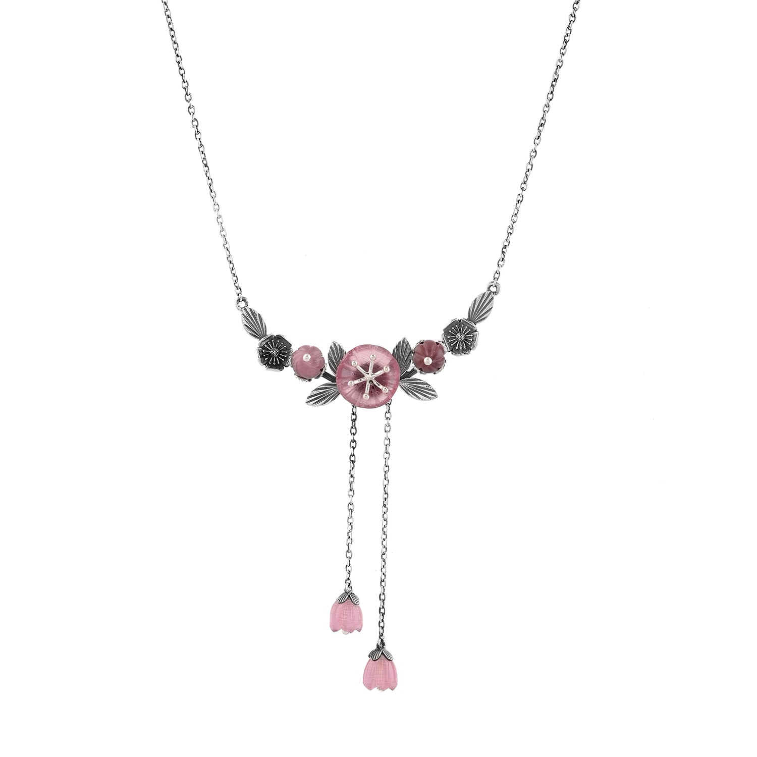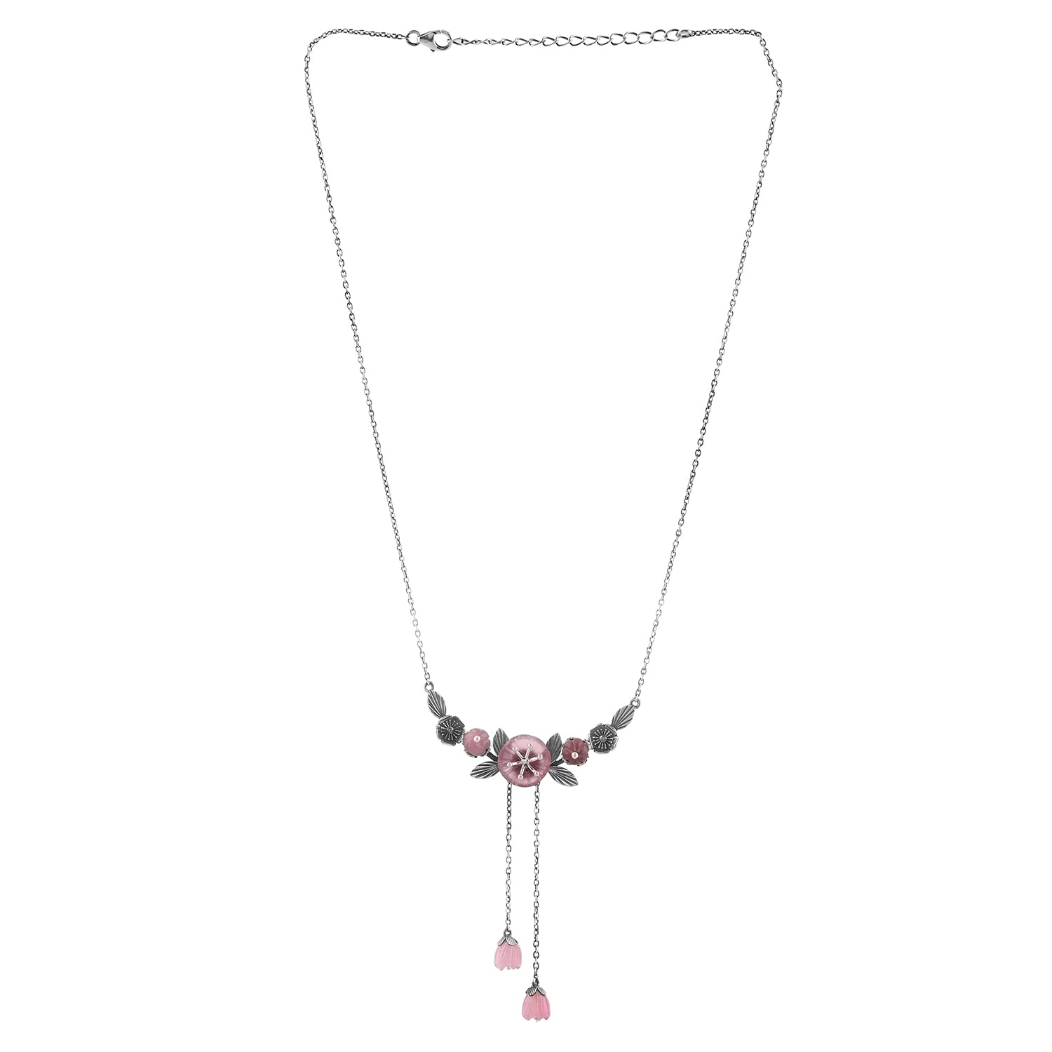 The Bloom 925 Sterling Silver Misaki Necklace is a stunning piece that captures the essence of spring and the timeless beauty of nature. Inspired by the delicate cherry blossoms, this necklace features intricately carved floral stones that symbolize feminine strength and beauty. The soft pink flowers are complemented by an oxidized silver finish, giving the piece an elegant yet vintage appeal. Pearls dangle gracefully from the floral centerpiece, adding a touch of sophistication and movement to the design. This necklace is not only a fashion statement but also a celebration of individuality and femininity, making it an ideal accessory for confident women who appreciate timeless elegance in their everyday wear or for special festive occasions.