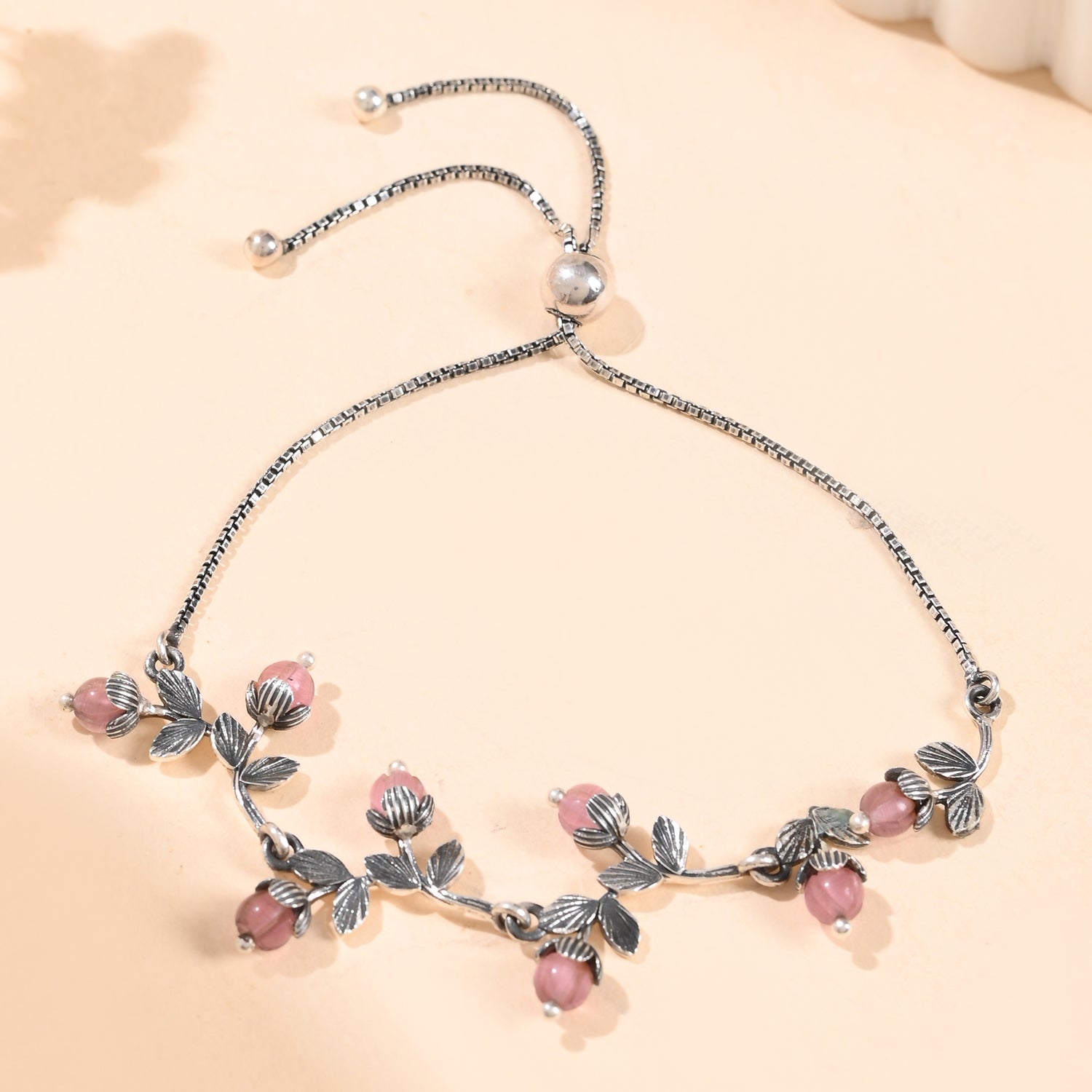 The Bloom 925 Sterling Silver Saki Bracelet is a stunning piece that beautifully captures the essence of femininity and individuality. Inspired by the delicate cherry blossoms, this bracelet features intricately carved floral stones that symbolize feminine power, mystique, and beauty. The addition of lustrous pearls enhances its elegance, while the oxidized finish on the sterling silver gives it a timeless, vintage appeal. This bracelet is perfect for the self-driven woman who loves to express her chic, bold style with confidence. Whether for everyday wear, office attire, or festive occasions, this floral bracelet is a versatile and elegant accessory that celebrates the unique beauty of every woman.