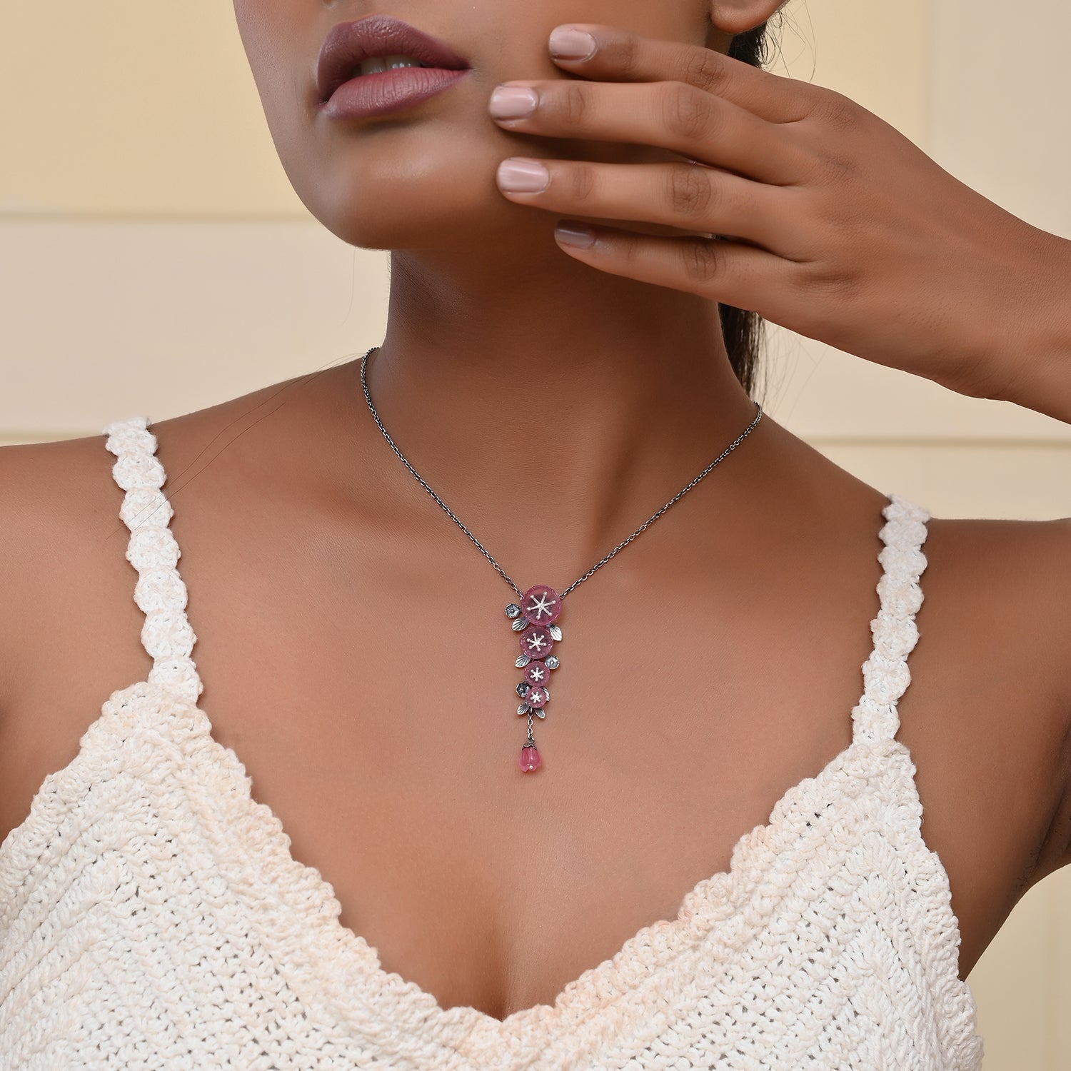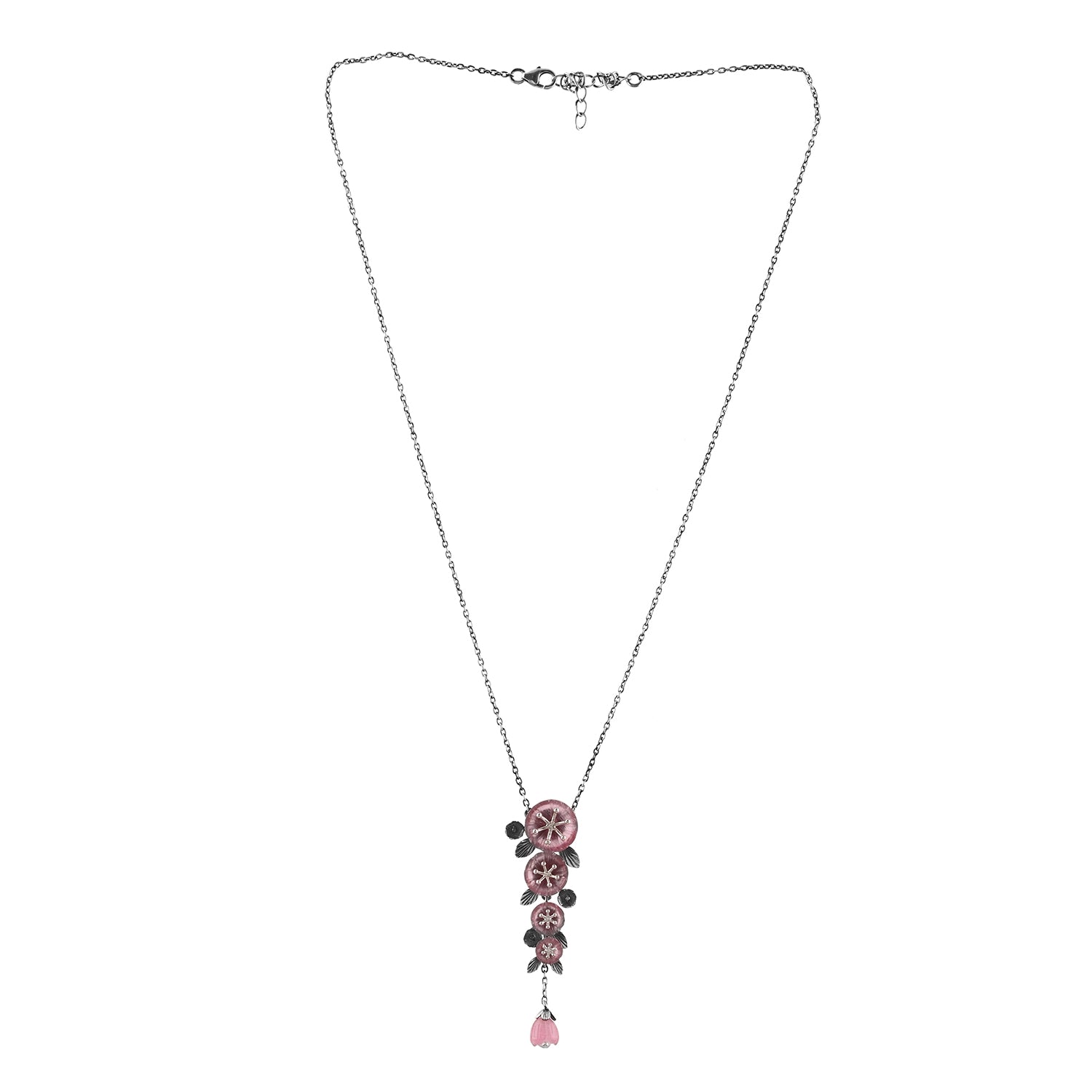 The Bloom 925 Sterling Silver Sakura Layered Necklace is a stunning piece that captures the essence of cherry blossoms, symbolizing feminine power, mystique, and beauty. This exquisite necklace features hand-carved floral stones that resemble delicate cherry blossoms, complemented by pearls and an oxidized finish to enhance its antique look. The design reflects the timeless elegance of nature, making it a perfect accessory for any occasion. Whether for festive celebrations or everyday office wear, this necklace is ideal for the self-driven woman who loves to live life on her own terms, embracing chic elegance with a touch of boldness.
