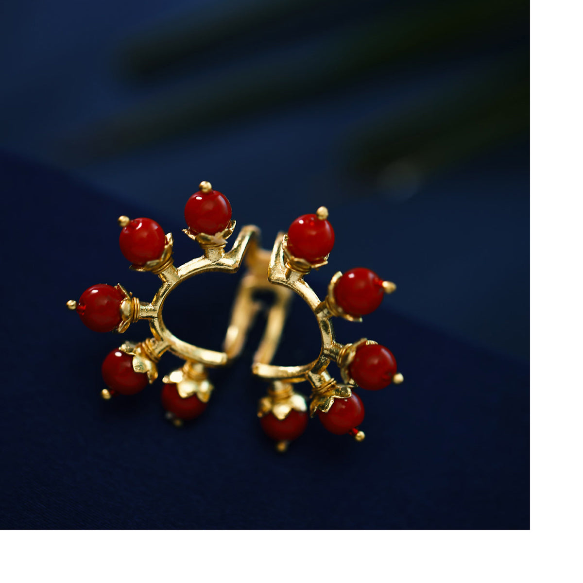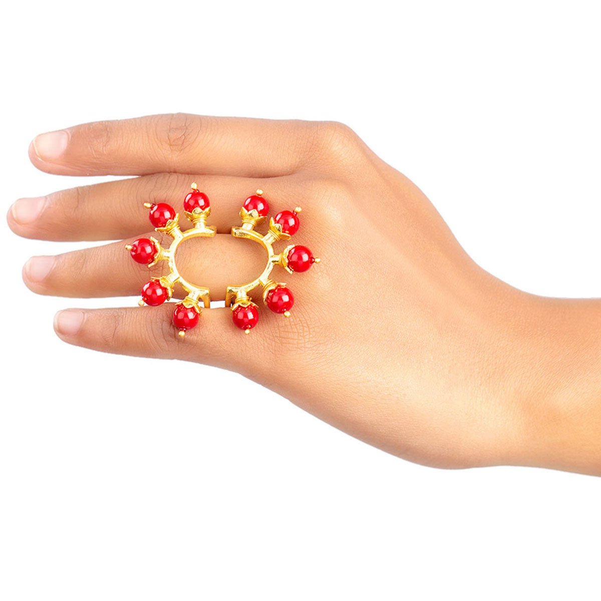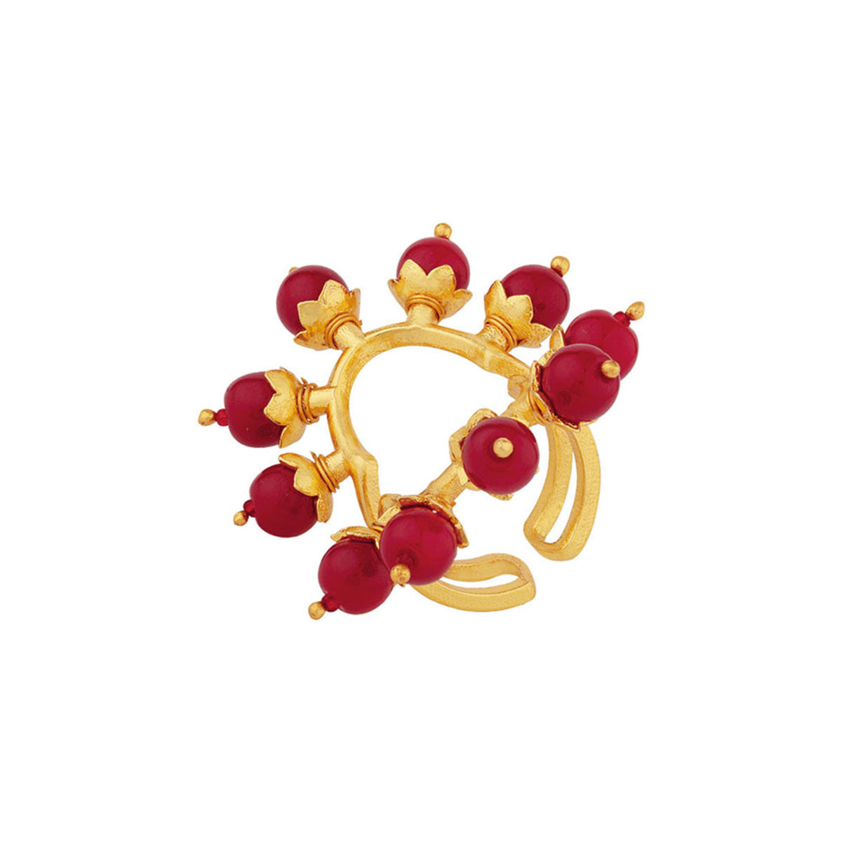Aztec style two finger ring, made from brass and adorned with red gems. Yellow gold plated, the ring is perfect for everyday wear.