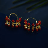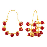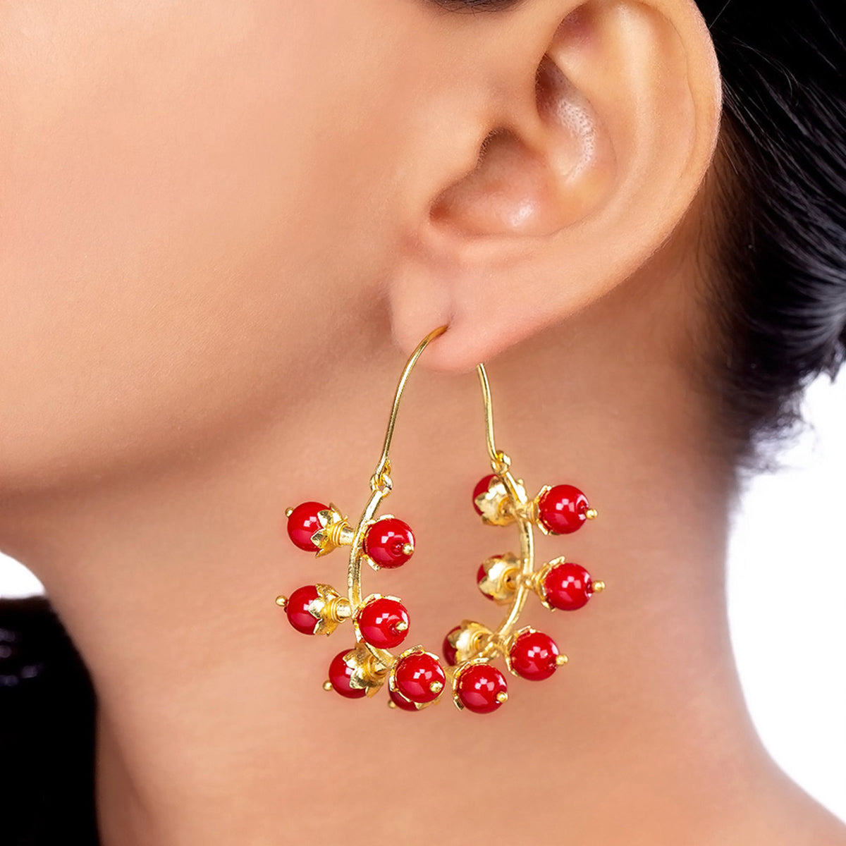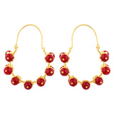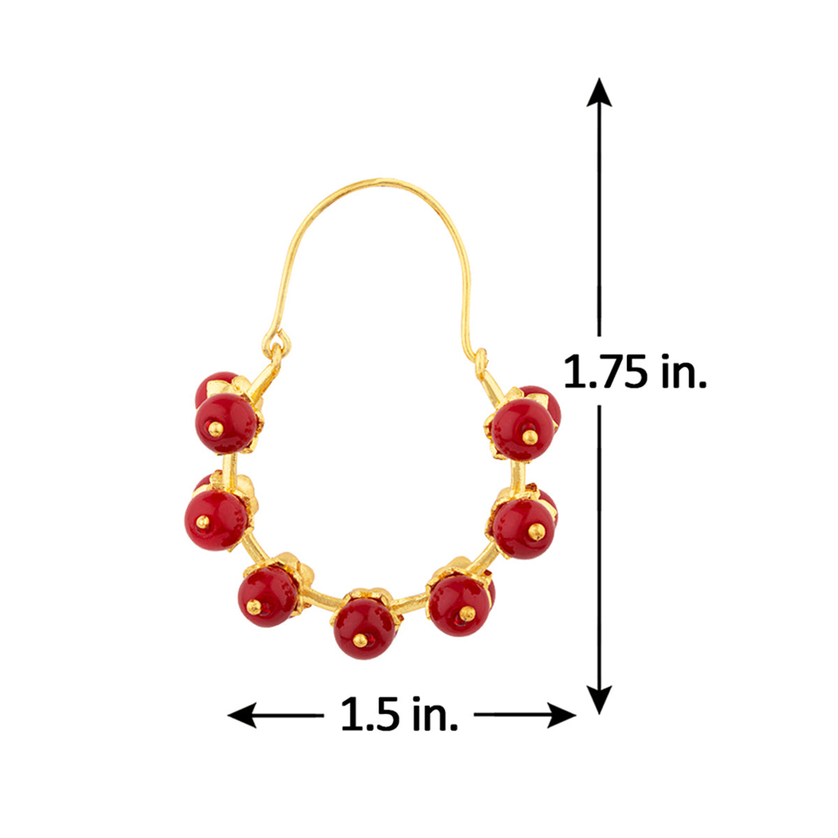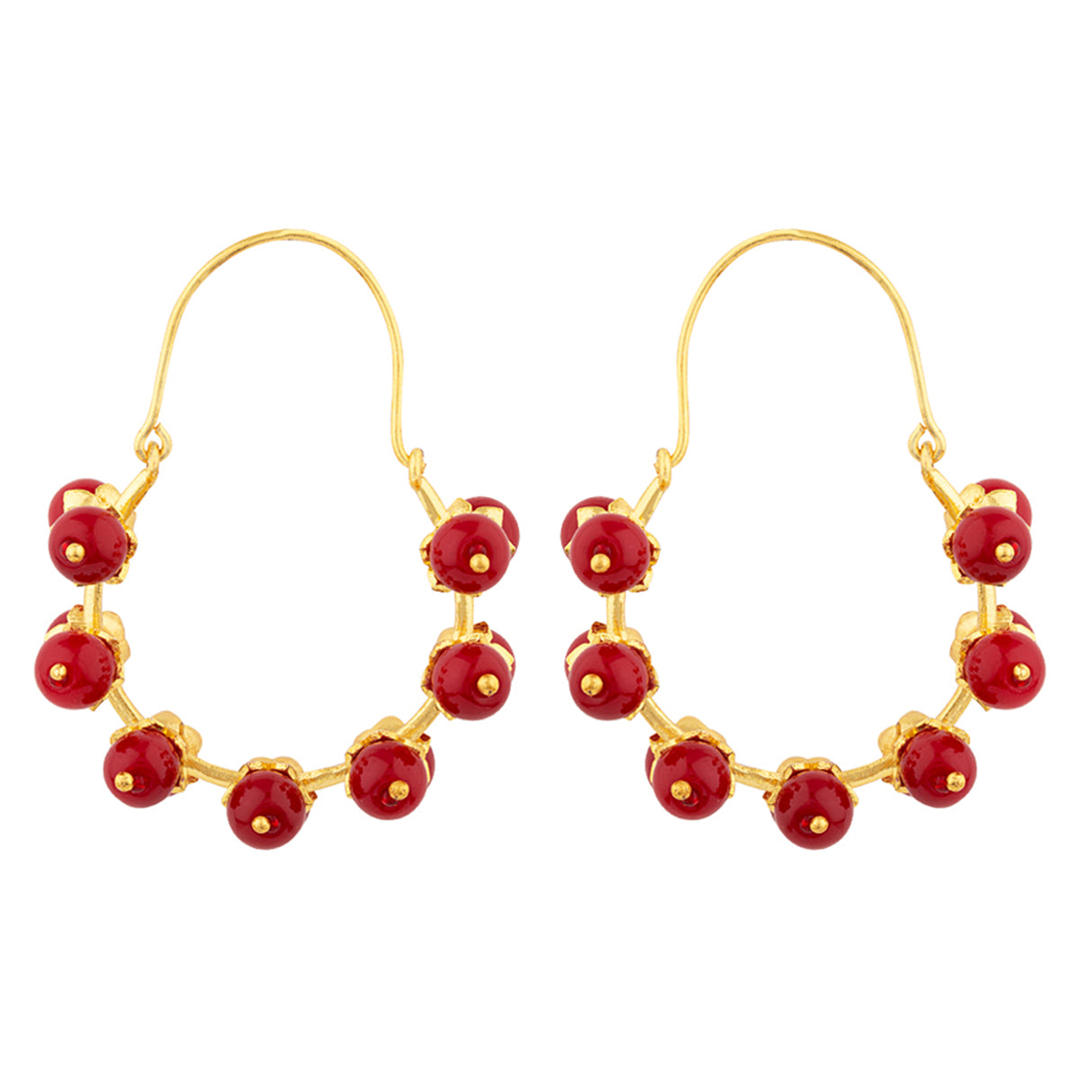 Adorned with red, well cut gems, the brass earrings have been given a yellow gold plating. Wear the hoops with a formal evening gown.