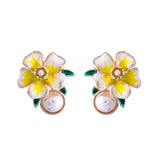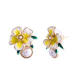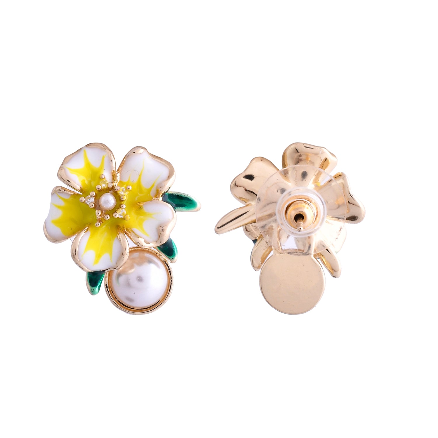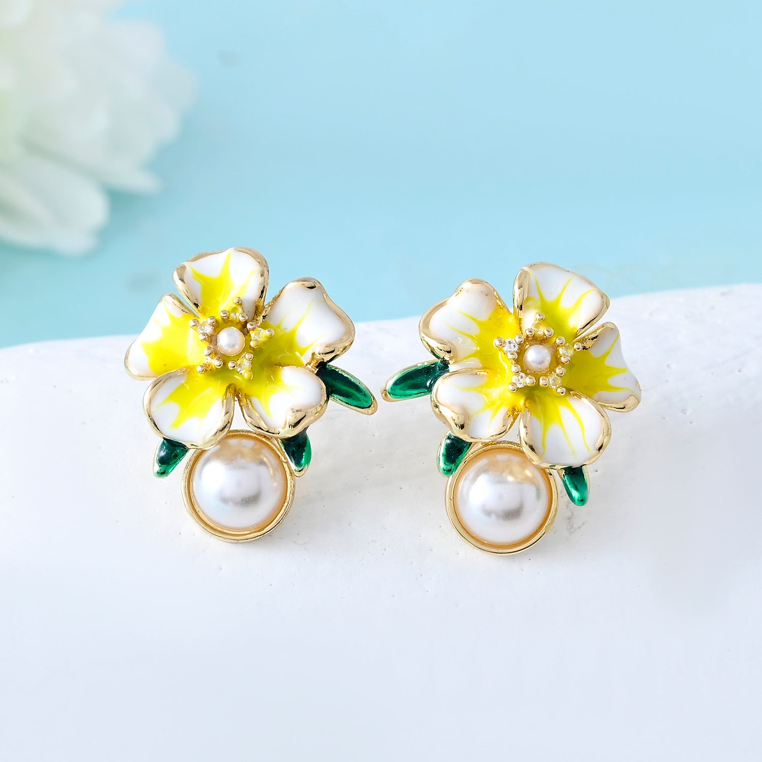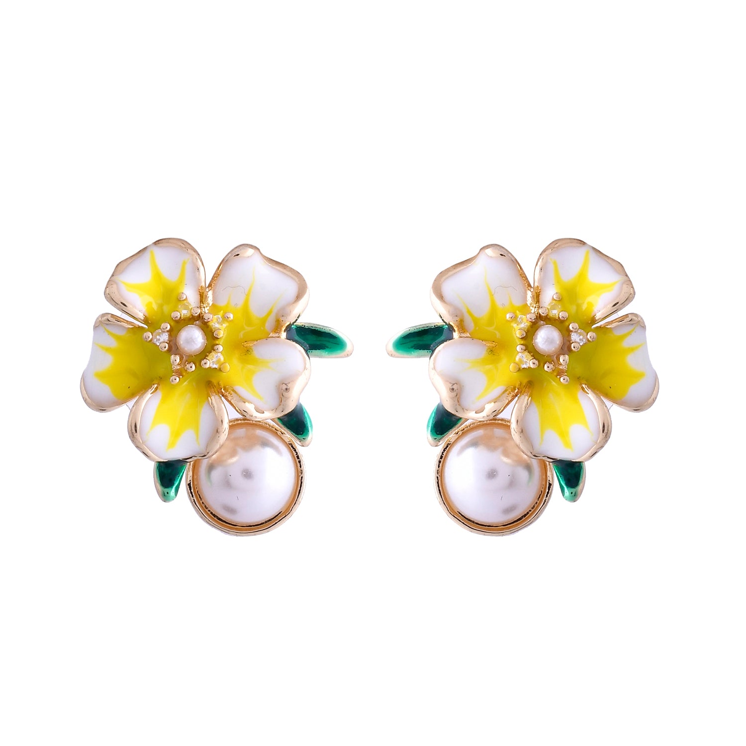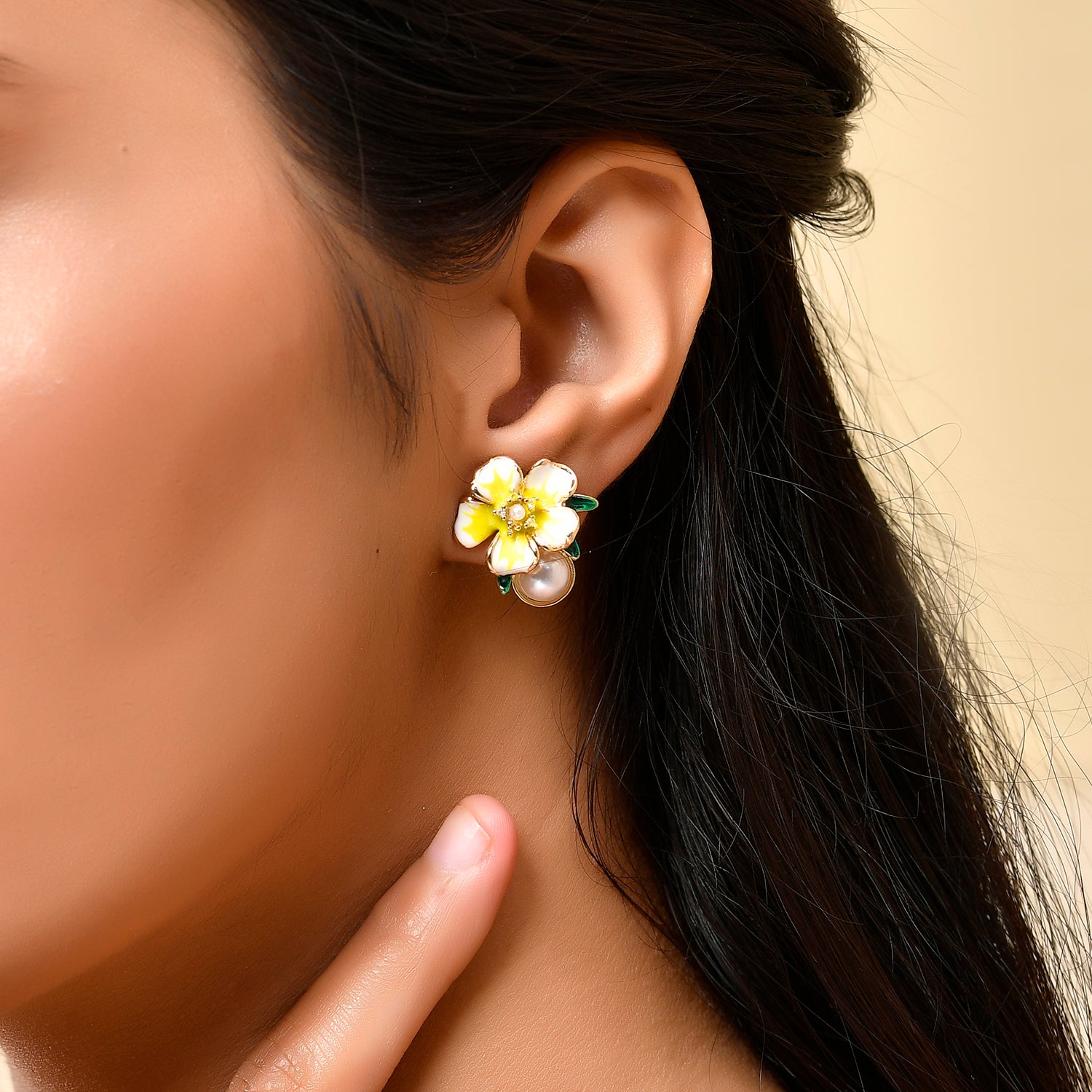 The Sunshine Stud Earrings, part of the Blossom Collection, are crafted with high-quality brass and plated in gold, ensuring durability and a luxurious finish. These enamel earrings boast a captivating floral design with vibrant yellow petals and white accents, complemented by delicate green leaves. The central pearl adds an elegant touch, making these earrings versatile enough for everyday wear, parties, weddings, and festive occasions. Whether styled with casual or formal outfits, these chic and contemporary earrings are perfect for women who appreciate a touch of nature-inspired beauty. Ideal as a gift for Valentine's Day, Diwali, Rakshabandhan, Christmas, or any special occasion, the Sunshine Stud Earrings make a thoughtful present for loved ones, including mothers, wives, girlfriends, sisters, and friends.