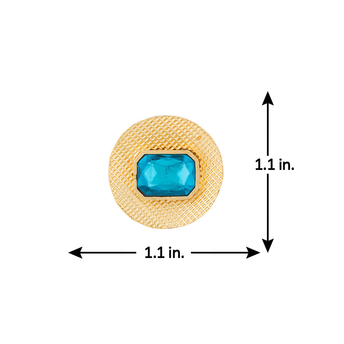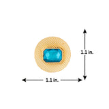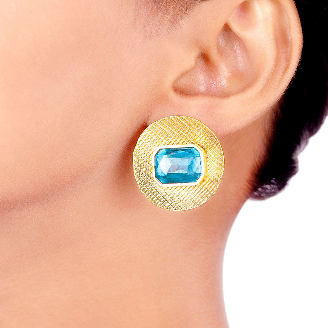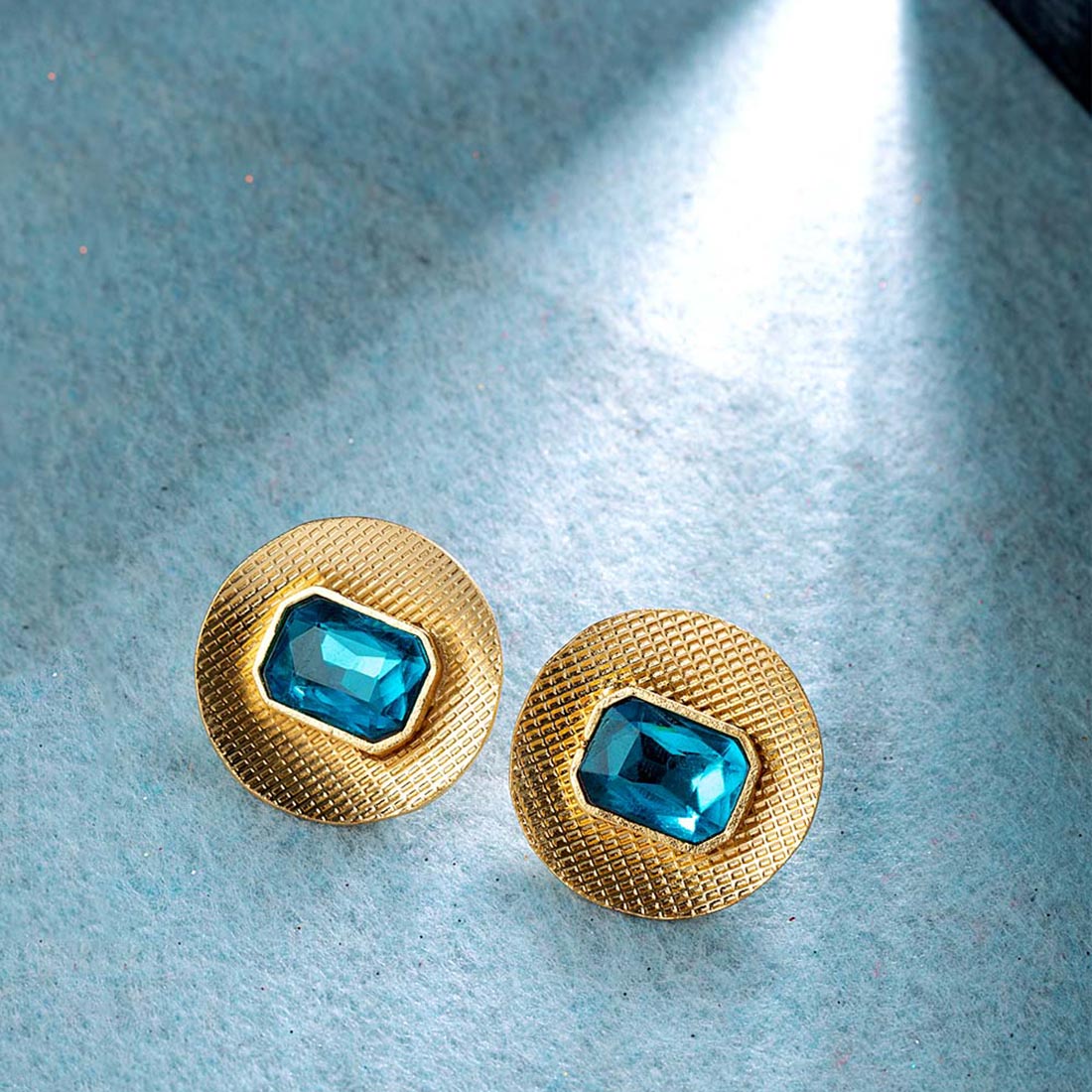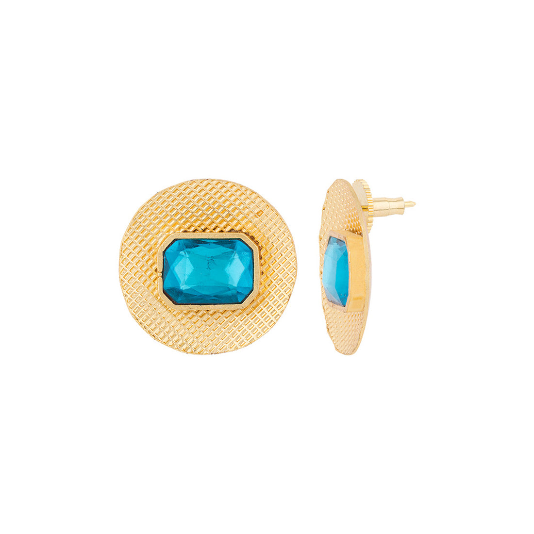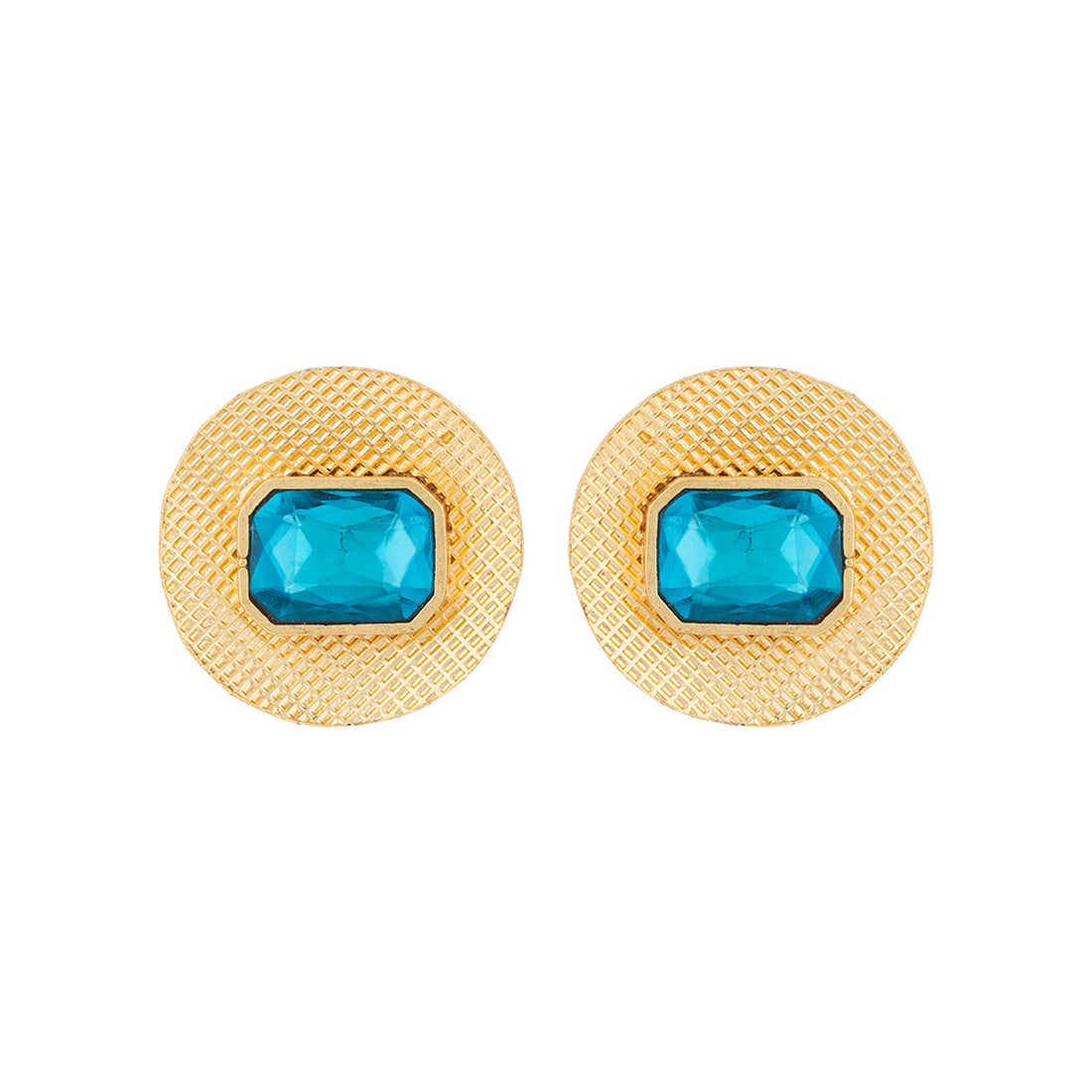 Look sharp in our Blue Amun disc shaped studs featuring sparkling blue stones on an etched golden base.