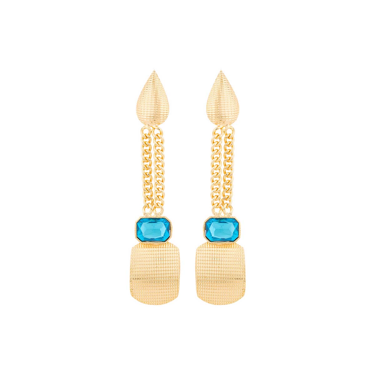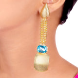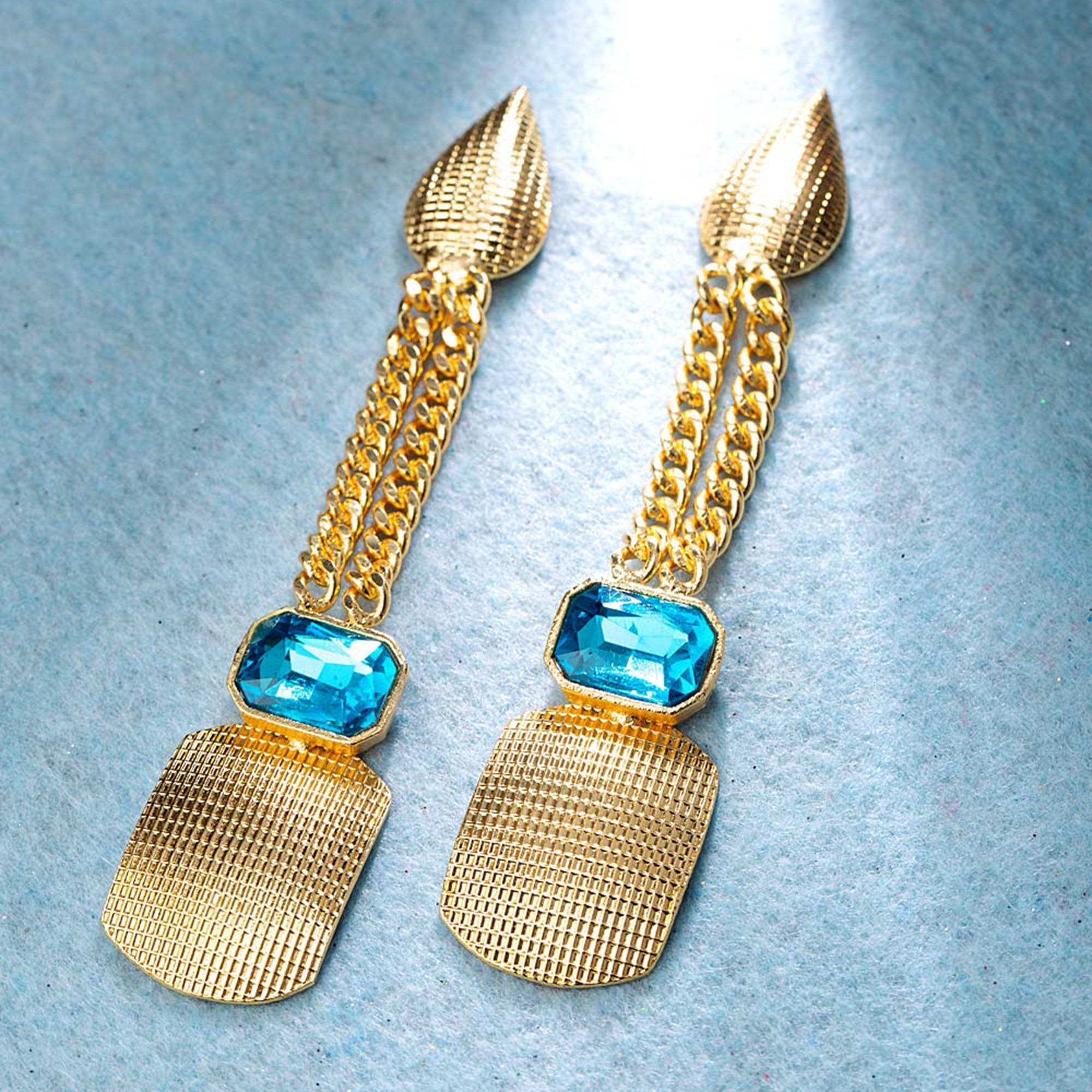 Look stylish in our Blue Amun danglers inspired by Egyptian gods. Featuring sparkling blue stones on a luxuriant golden base.