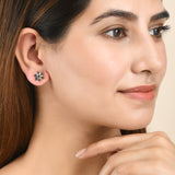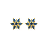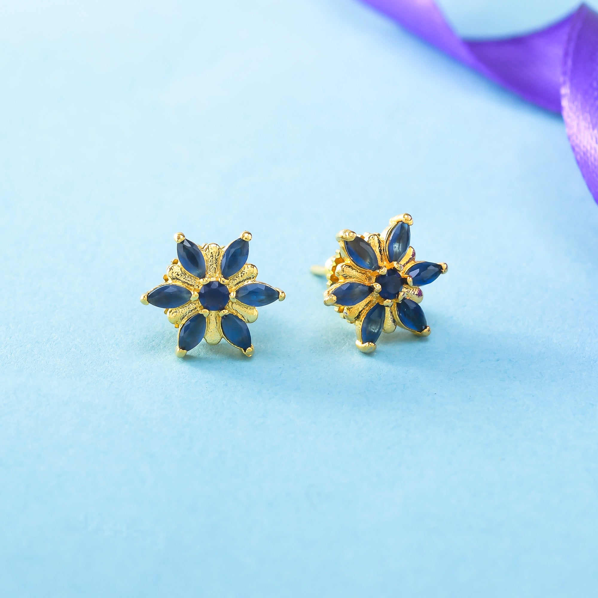Blue CZ gems adorned stud earrings with yellow gold plating. Fashioned out of brass. Lightweight, comfortable and versatile.