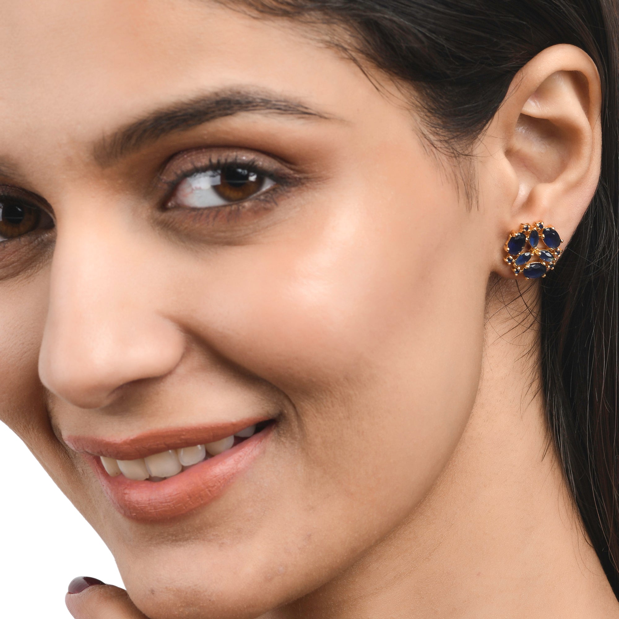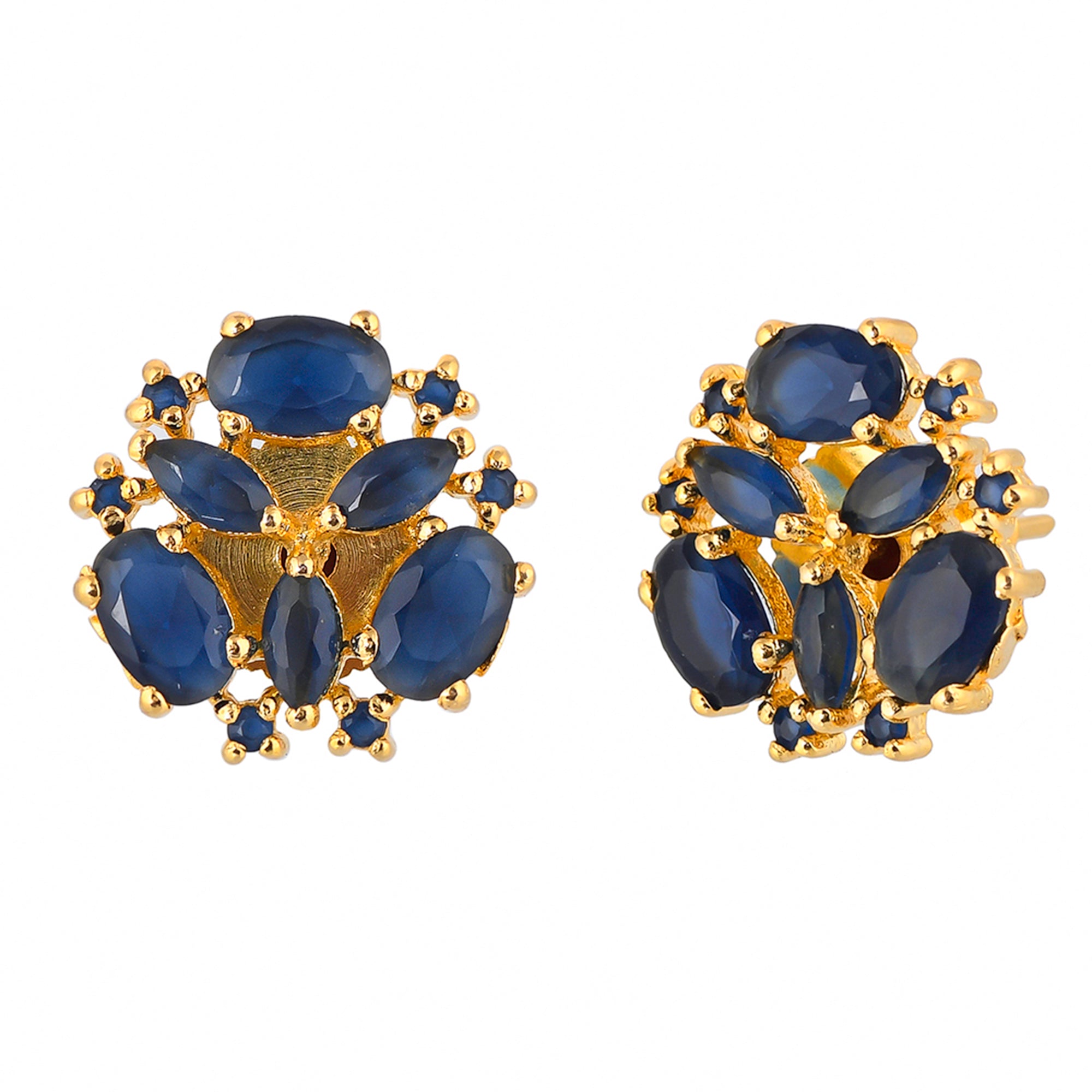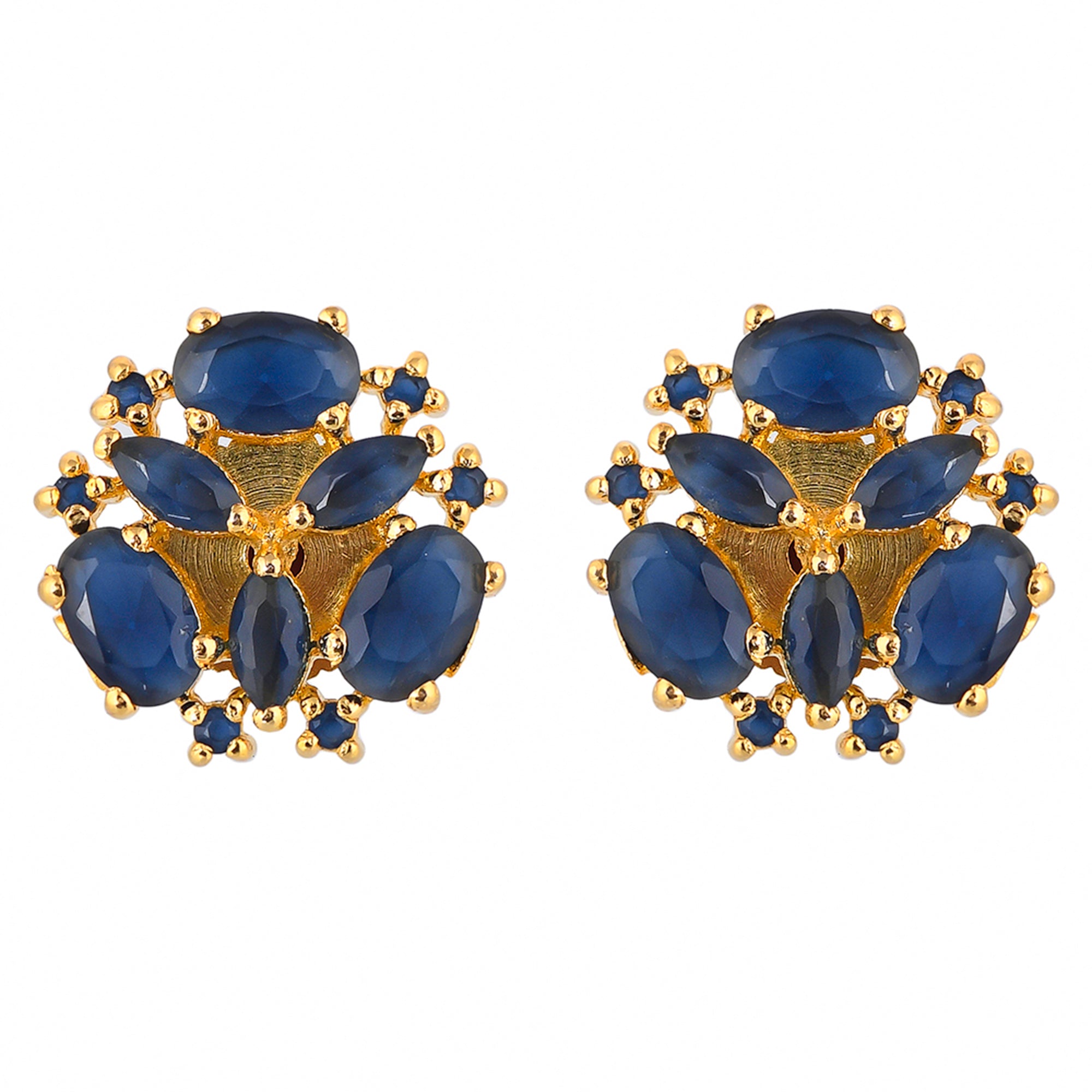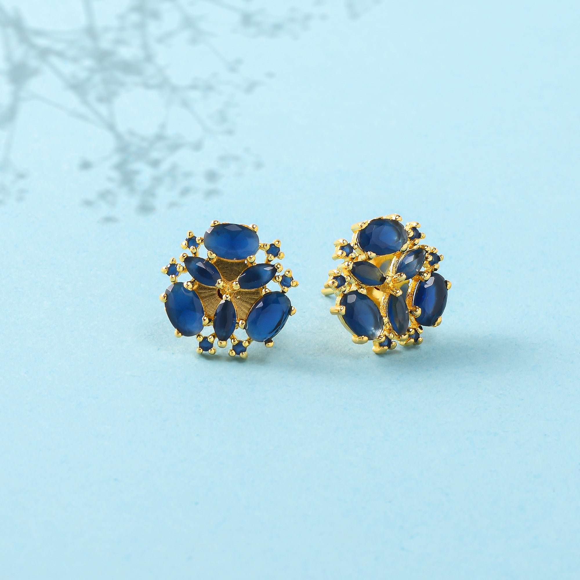 Blue zirconia gemstones adorned brass stud earrings with classic gold plating. Good match for everyday looks.