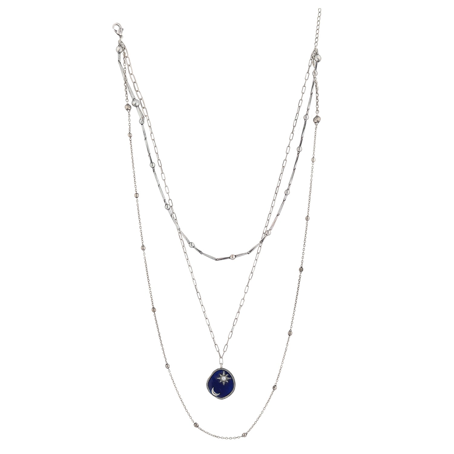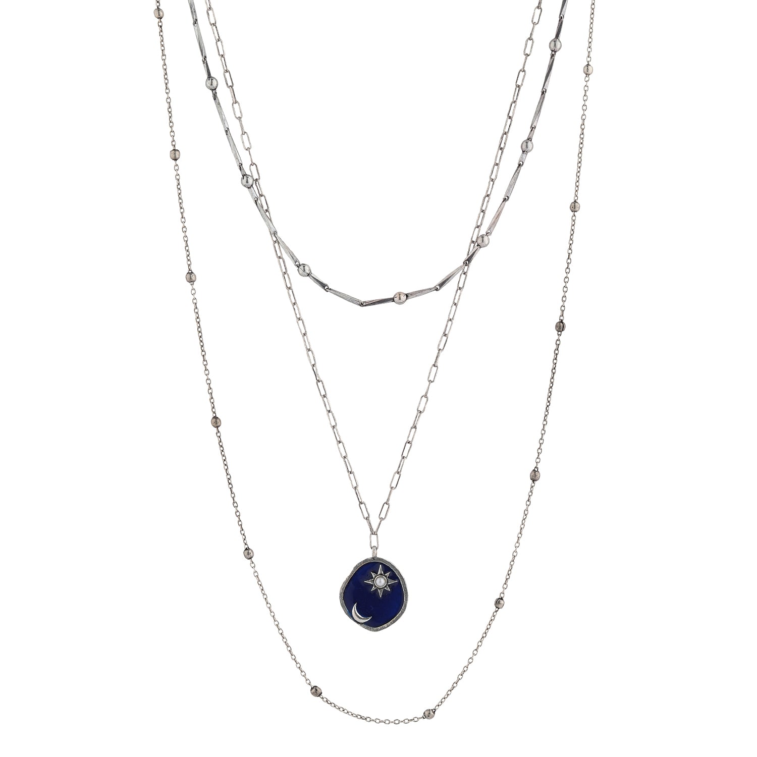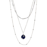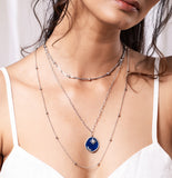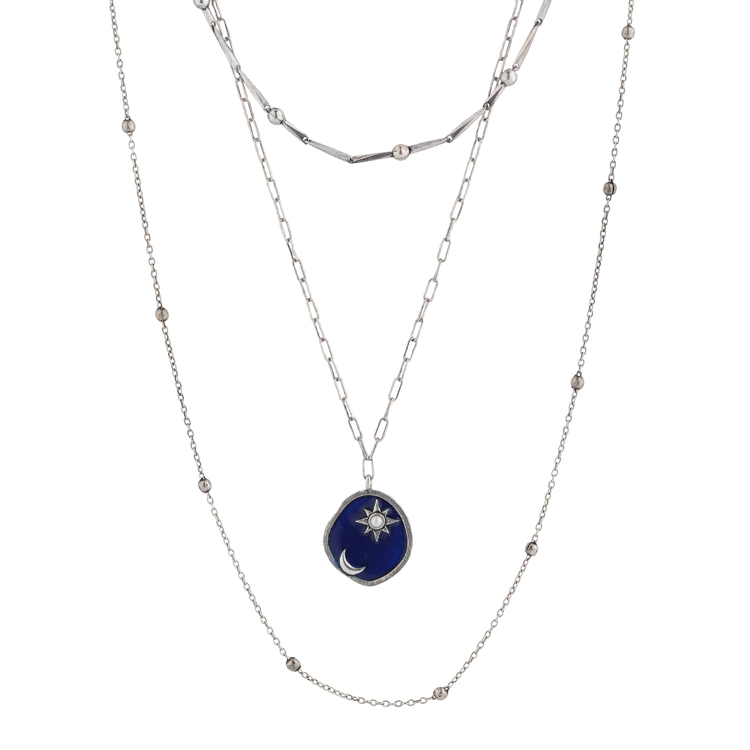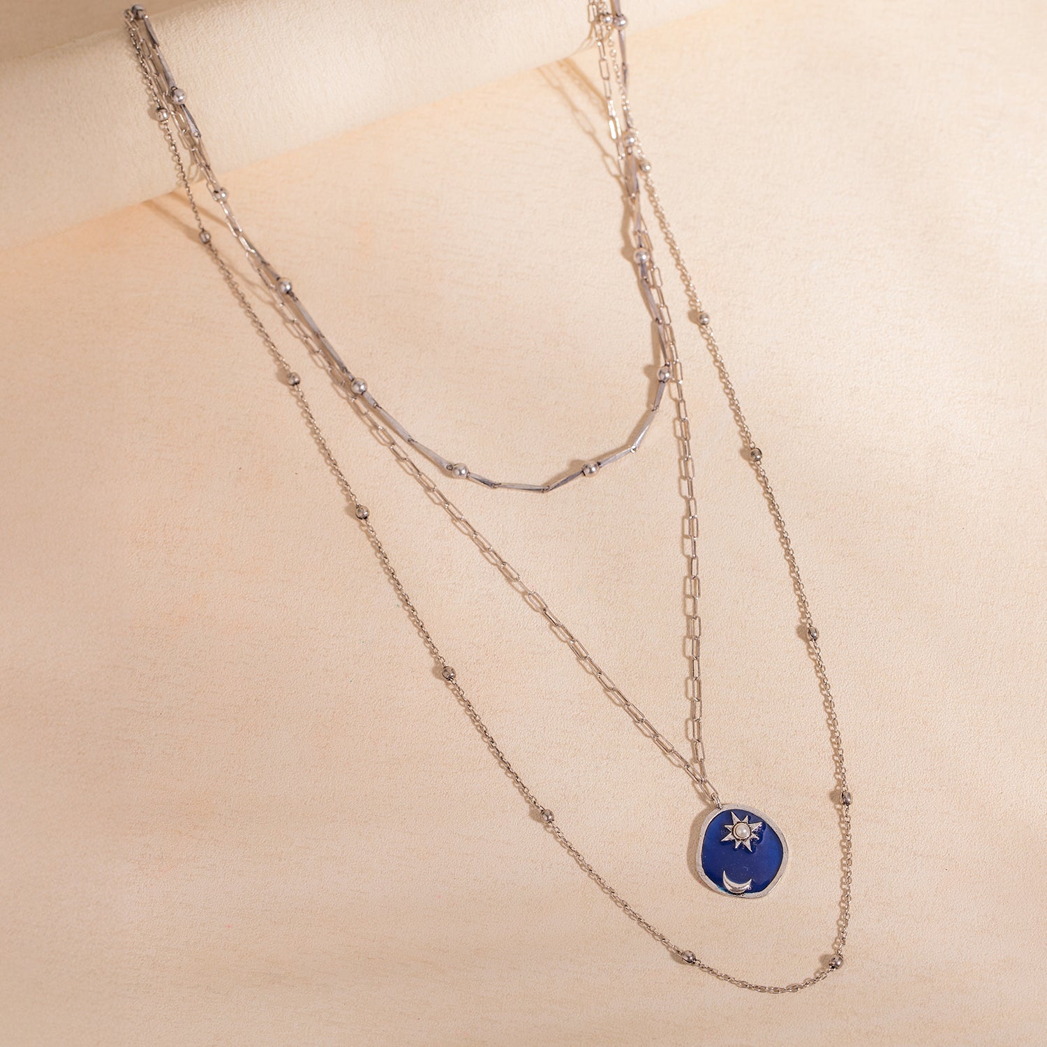 The Boho Tribe Cosmic Layered Necklace is an exquisite piece that captures the free-spirited essence of bohemian culture. Crafted from high-quality brass and plated with a striking silver oxidized finish, this necklace features three delicately layered chains adorned with unique bead accents and a stunning blue pendant with celestial motifs such as the sun and moon. This versatile necklace can be effortlessly styled with both casual and chic outfits, making it perfect for everyday wear, vacation adventures, office attire, or special occasions like Diwali, Rakshabandhan, Christmas, and Valentine's Day. It is an ideal gift for women, whether it's for your girlfriend, wife, mother, sister, or friend. Part of the Boho Tribe collection, this necklace embodies the beauty of handcrafted, statement jewelry, allowing you to express your unique style with confidence.