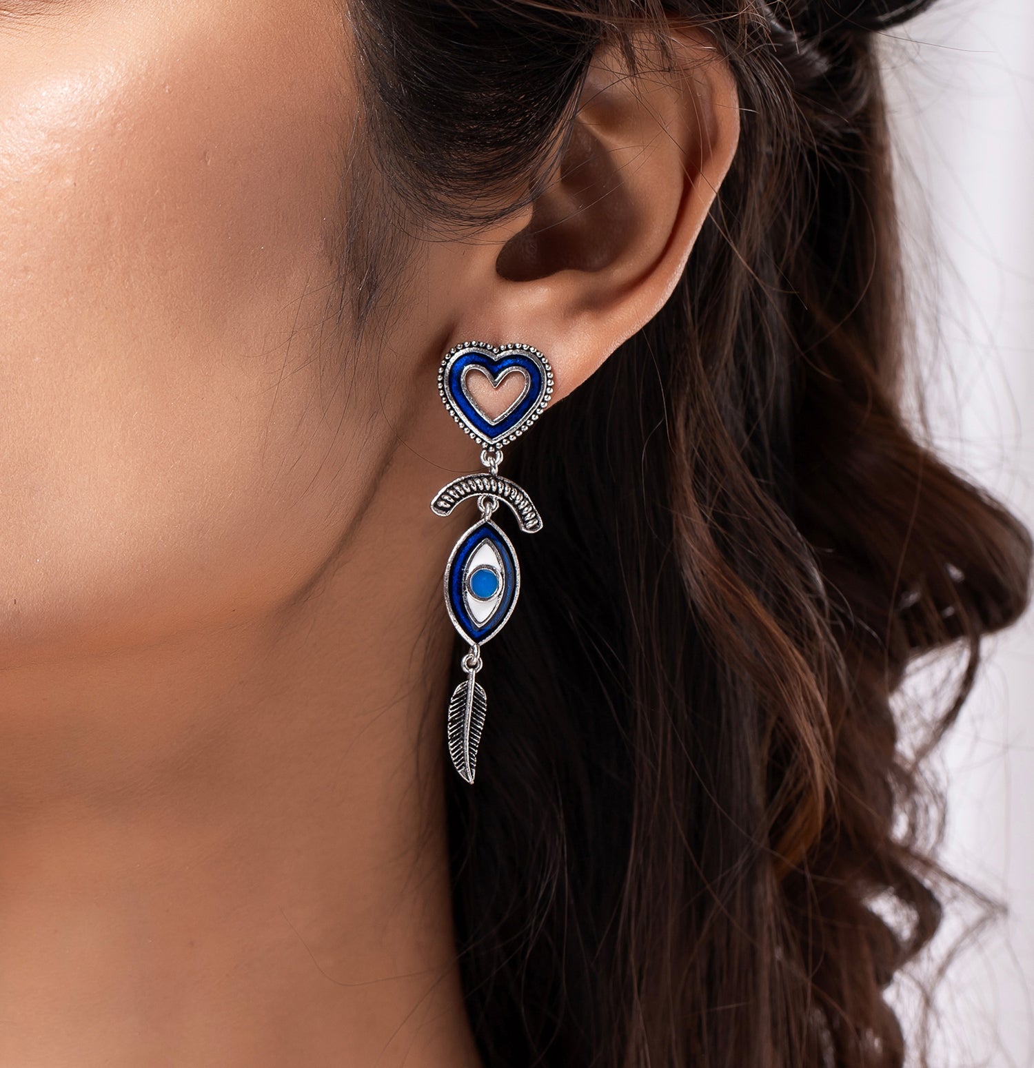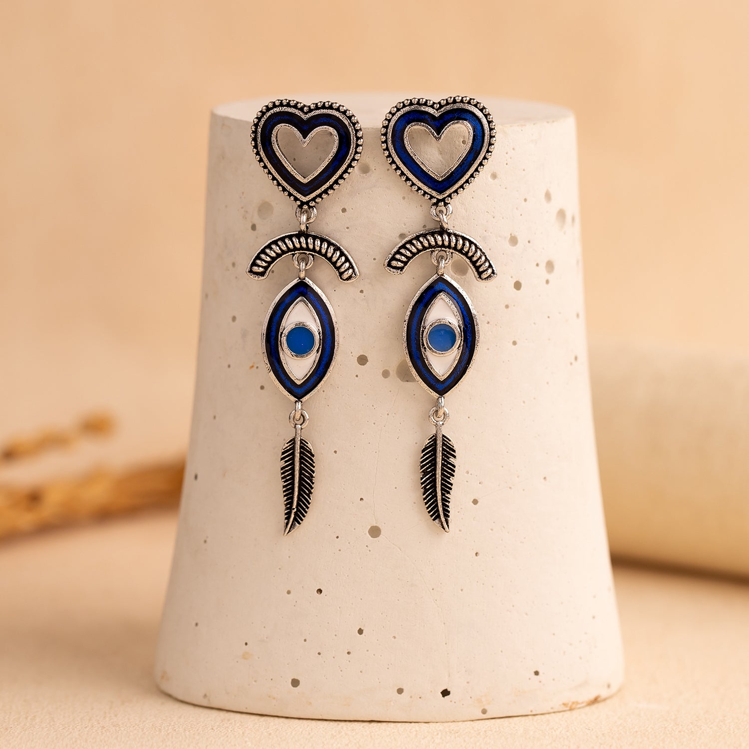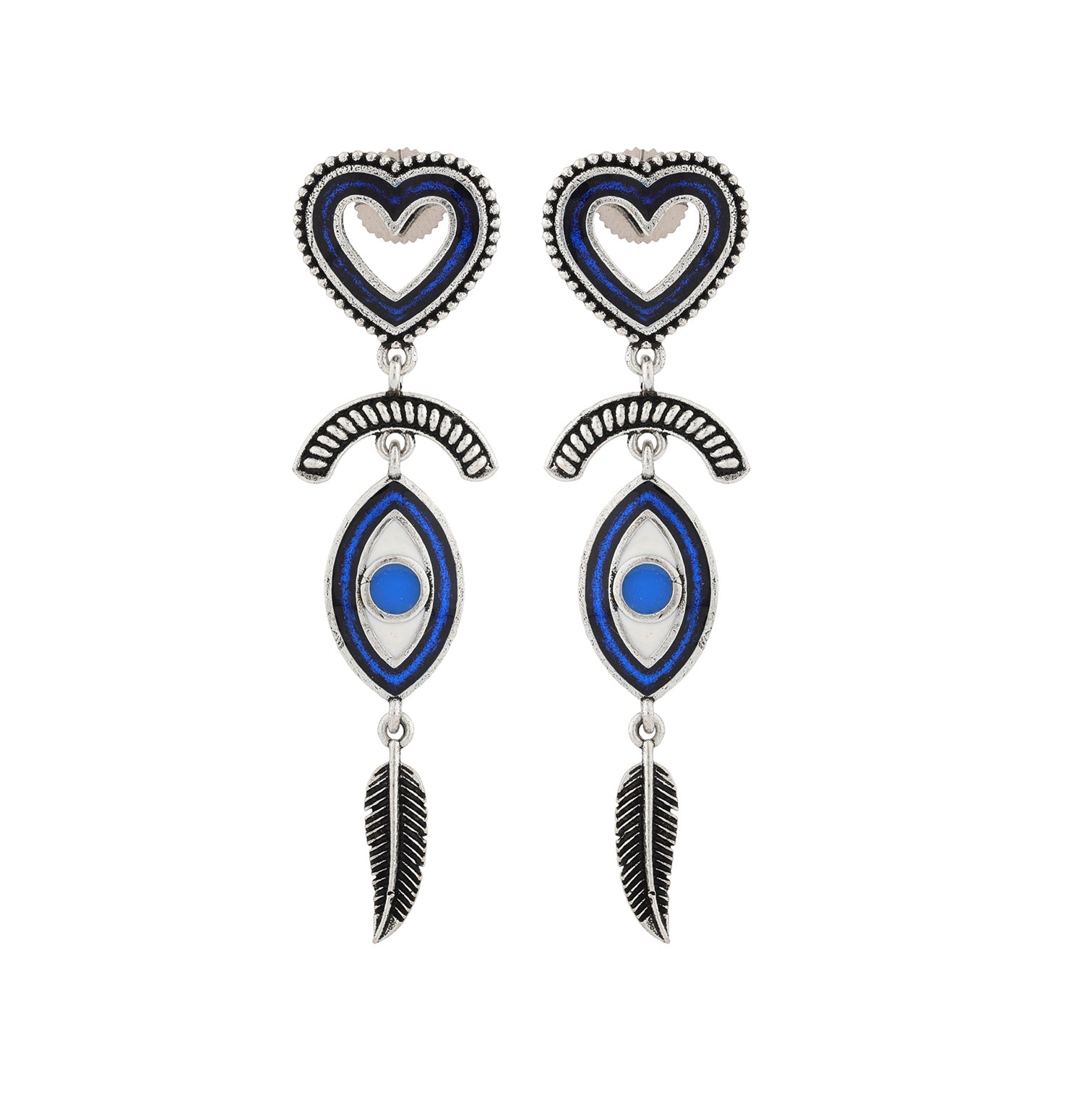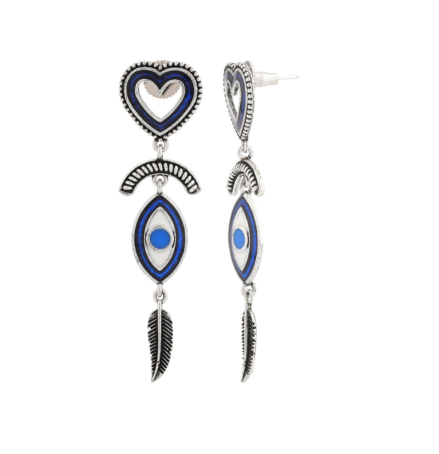 The Boho Tribe Feathered Insight Oxidised Earrings are an exquisite addition to any jewelry collection, designed with meticulous craftsmanship in mind. Crafted from high-quality brass and adorned with a silver oxidised plating, these earrings feature a distinctive heart-shaped stud and feathered dangles that evoke the free-spirited and ethnic essence of bohemian style. The vibrant blue accents provide a striking contrast to the oxidised silver, making these earrings an ideal choice for both everyday wear and special occasions. As part of the Boho Tribe collection, these statement earrings can easily complement a variety of outfits, from chic casual wear to elegant evening attire. Perfect for gifting, they make thoughtful presents for Valentine's Day, Diwali, Rakshabandhan, Christmas, New Year, and more, suitable for sisters, girlfriends, wives, mothers, and friends. Embrace the boho-chic trend with these stunning earrings, adding a touch of elegance and individuality to any ensemble.