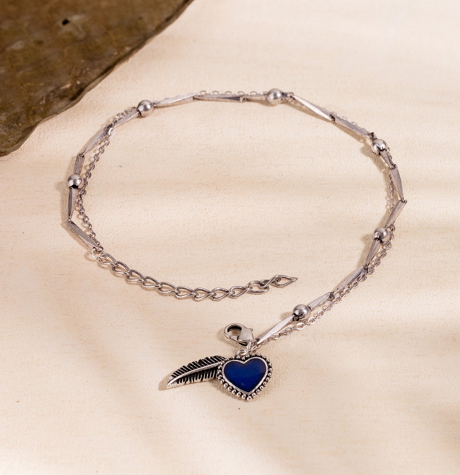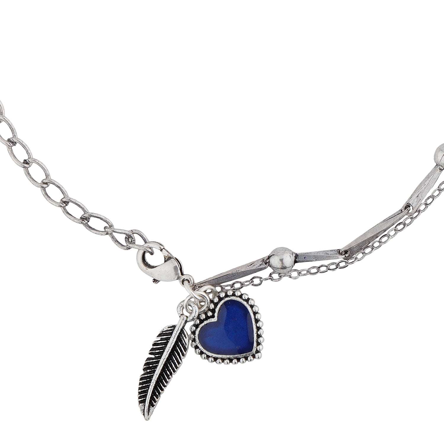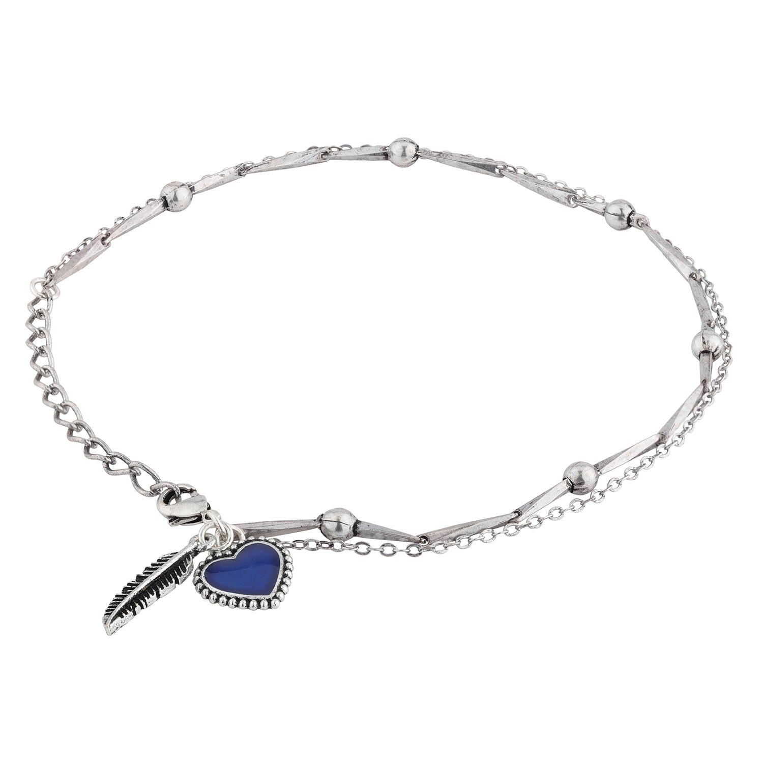 The Boho Tribe Feathers Of Love Oxidised Anklet is a stunning piece of jewelry crafted from high-quality brass with a silver oxidised plating, giving it a chic and timeless appeal. This anklet features a delicate chain adorned with small beads and intricate feather and heart charms, making it a perfect statement piece for any occasion. The deep blue heart charm adds a pop of color, enhancing its bohemian aesthetic. Ideal for everyday wear, vacation, or special events like Diwali, Rakshabandhan, and Valentine's Day, this anklet makes a thoughtful gift for women, whether it's for a sister, girlfriend, wife, mother, or friend. Pair it with casual outfits for a laid-back look or with more formal attire for a touch of elegance. The Boho Tribe collection celebrates the free-spirited and ethnic roots of bohemian culture, offering unique and handcrafted pieces that stand out in mainstream fashion.