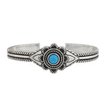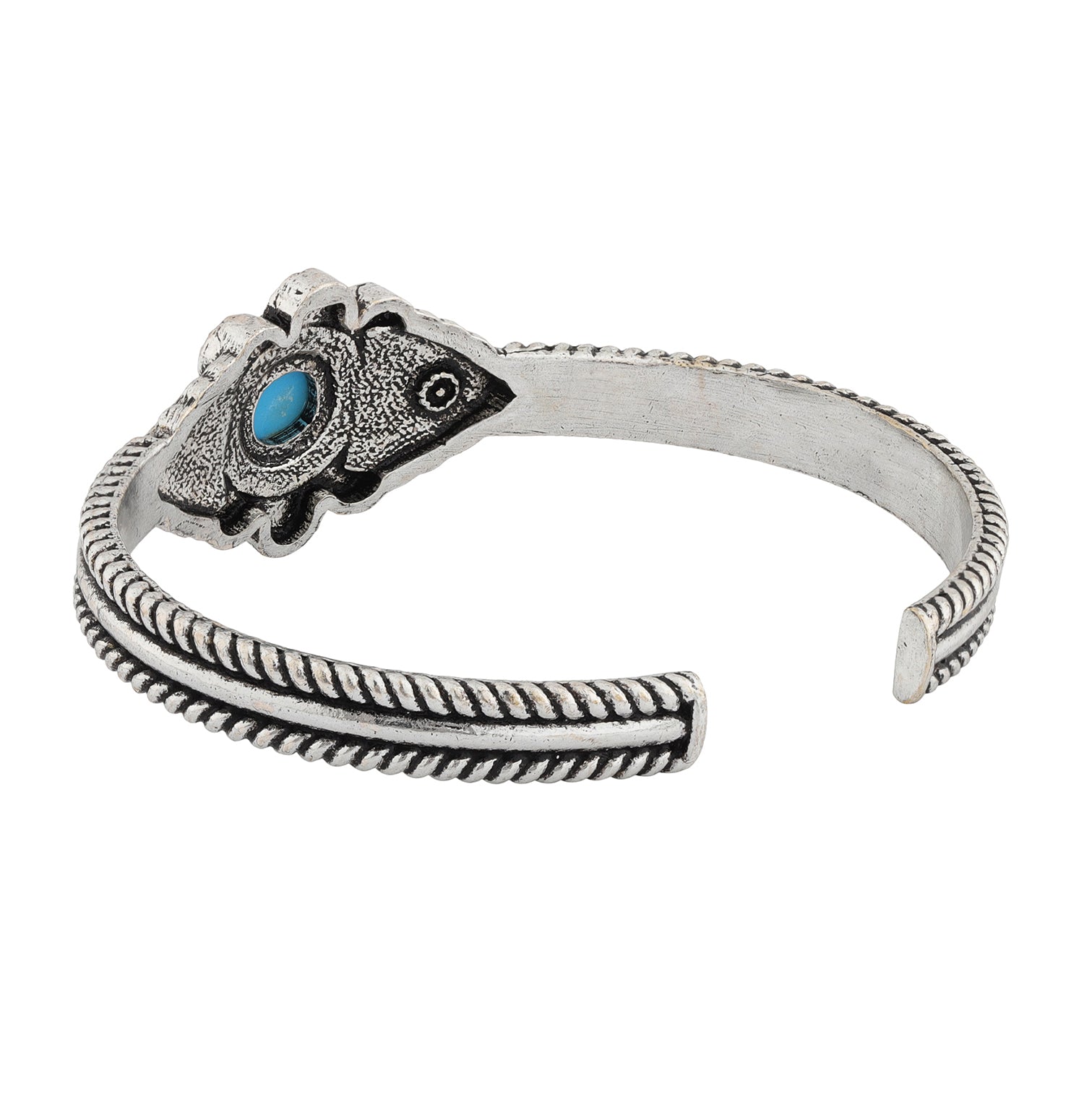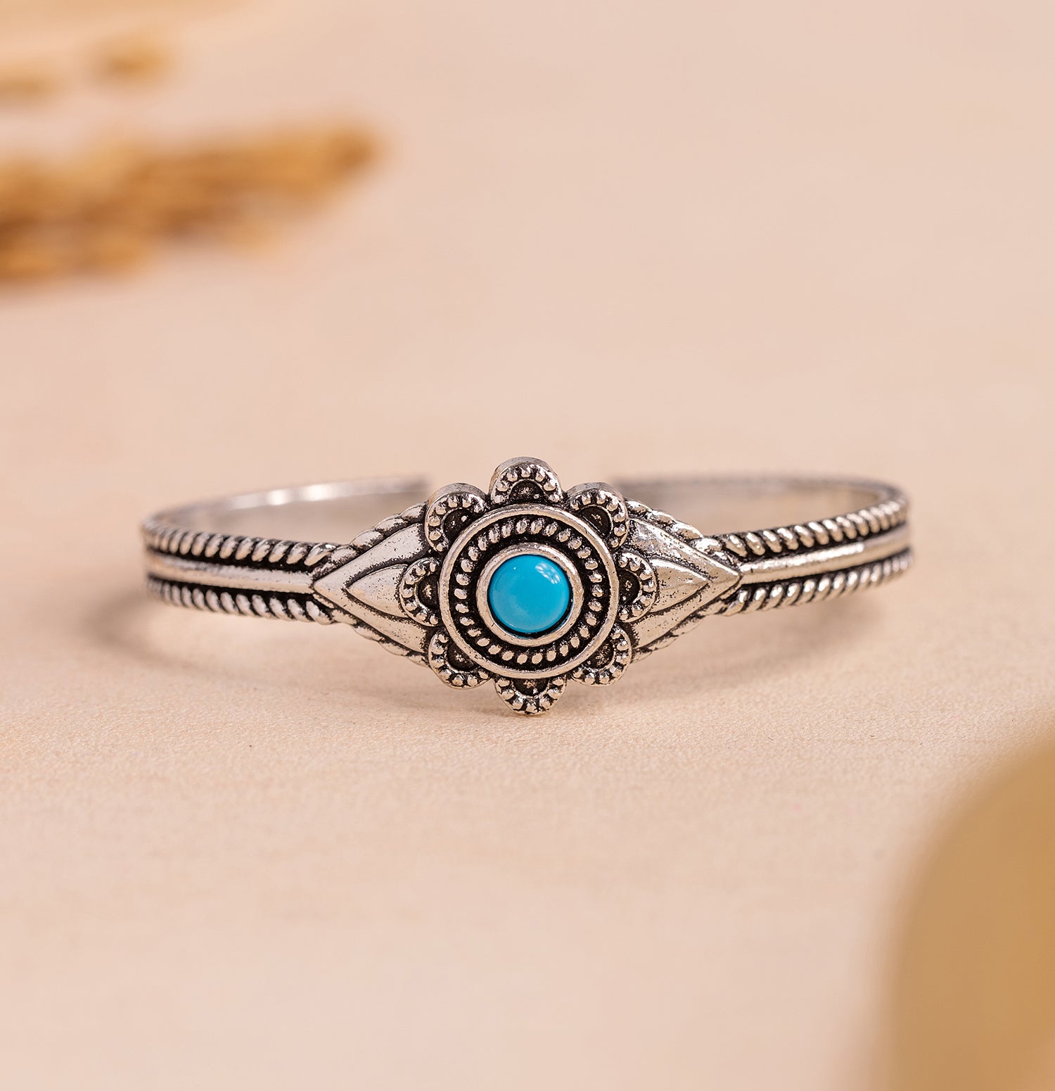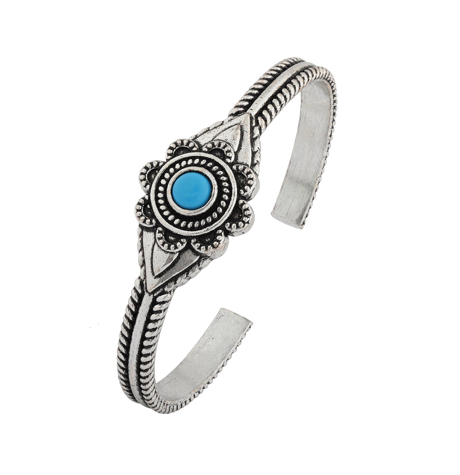 This Boho Tribe Flower Turquoise Cuff Bangle is a captivating piece of jewelry designed to reflect the free-spirited essence of the bohemian culture. Made from high-quality brass and featuring a silver oxidized plating, the bangle showcases an intricate flower motif adorned with a vibrant turquoise stone at its center. This stone, known for its symbolism of protection, tranquility, and wisdom, adds a touch of elegance and color to the piece. The bangle is part of the Boho Tribe collection, which emphasizes a blend of traditional and contemporary styles. Perfect for everyday wear, office jewelry, travel, or special occasions like Holi, Diwali, Rakshabandhan, and Christmas, this versatile piece can be paired with both western attire and boho accessories for a chic look. It also makes an ideal gift for women, whether for Valentine's Day, a birthday, or any other celebration, allowing you to express your appreciation for a mother, sister, girlfriend, wife, or friend.