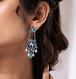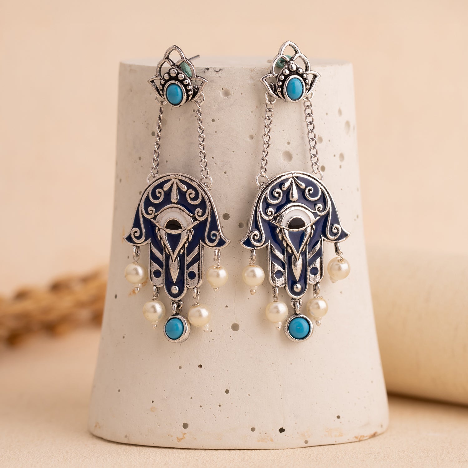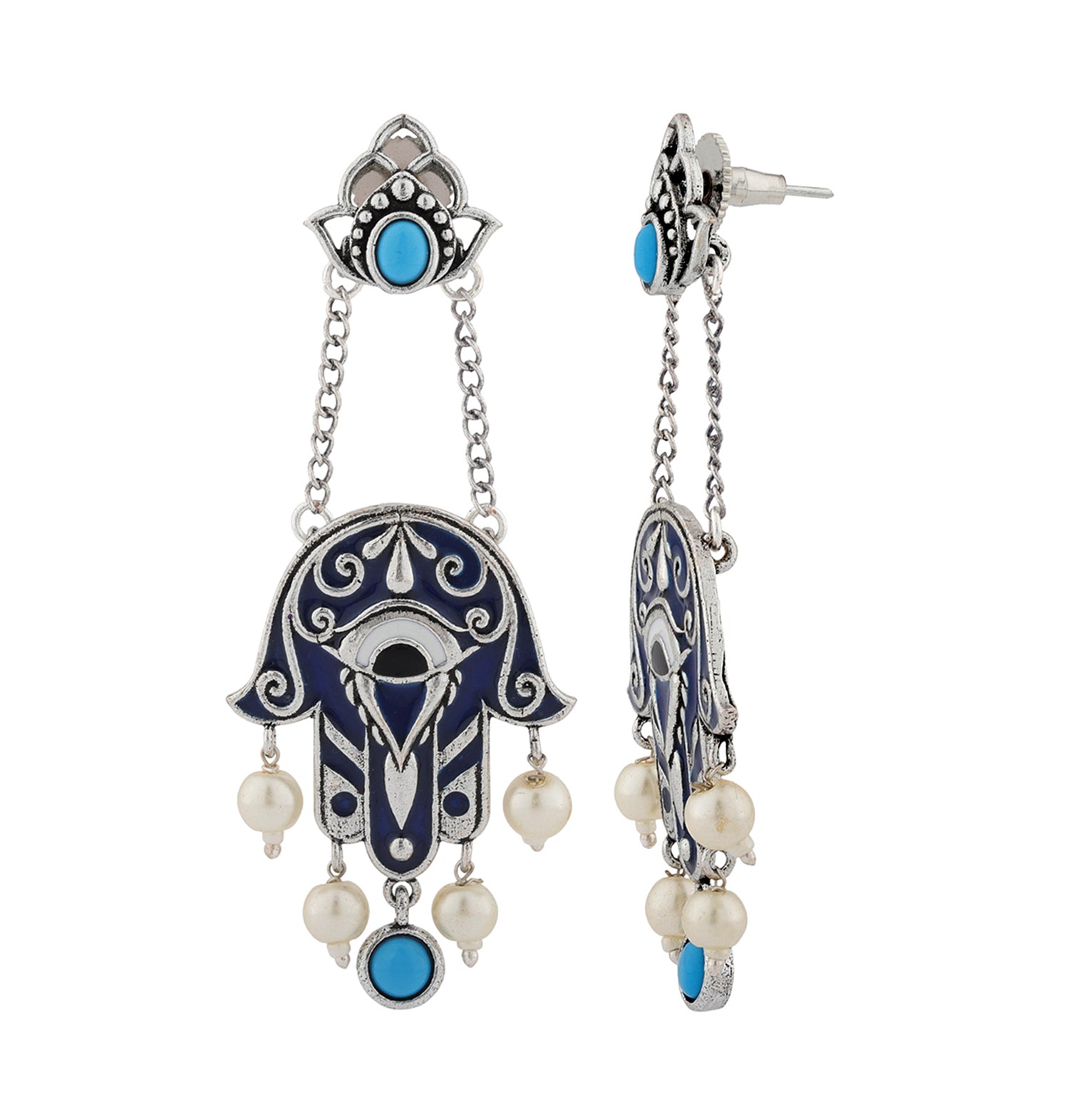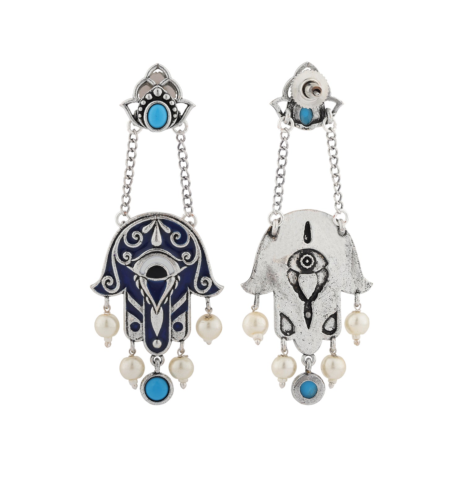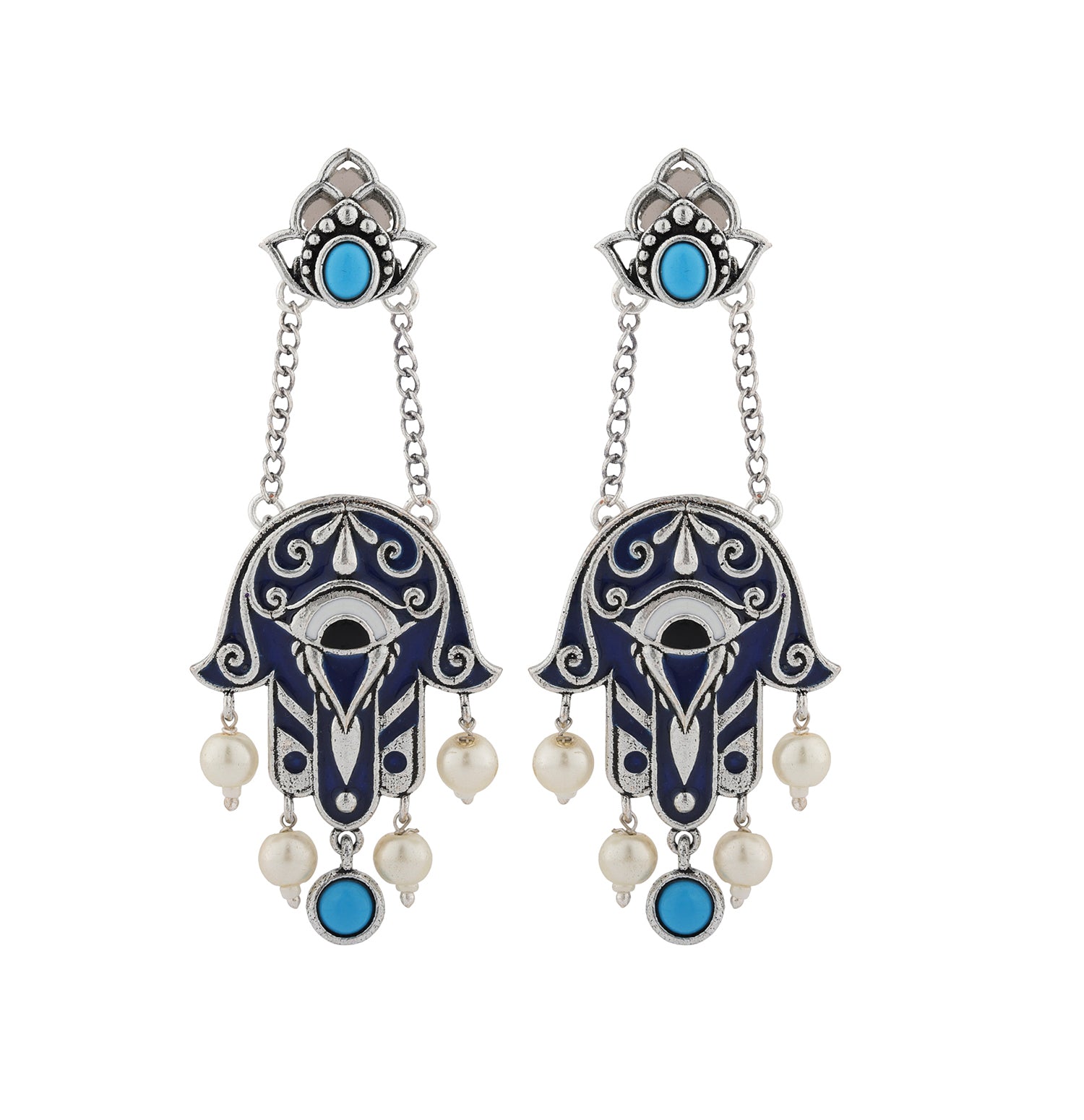 Discover the allure of the Boho Tribe Midnight Hamsa Oxidised Dangle Earrings, expertly crafted from high-quality brass with a lustrous silver oxidised plating. These earrings feature an intricate Hamsa design adorned with rich turquoise stones and delicate pearl accents, capturing the essence of the free-spirited bohemian style. Perfect for adding a statement touch to both casual and festive outfits, these earrings are versatile enough for everyday wear, vacation, office, and special occasions like Holi, Diwali, and Rakshabandhan. Ideal for gifting to women on Valentine's Day, Christmas, New Year, and other celebrations, these chic earrings are the perfect present for sisters, girlfriends, wives, mothers, and friends. Embrace the boho spirit and elevate your style with this stunning piece from the Boho Tribe collection.