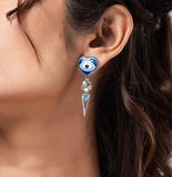 The Boho Tribe Nomadic Hearts Eye Oxidised Earrings are a captivating piece that embodies the spirit of bohemian culture. Crafted from high-quality brass and adorned with silver oxidised plating, these earrings showcase a heart-shaped design featuring an evil eye motif, known for warding off negative energy and protecting the wearer. Intricate floral and geometric patterns enhance their unique aesthetic. Perfect for everyday wear, vacations, and special occasions, these earrings effortlessly complement casual and formal outfits. The deep blue and silver hues add a touch of elegance and sophistication. Ideal for gifting on occasions like Valentine's Day, Diwali, Rakshabandhan, Christmas, and New Year, they make a thoughtful present for mothers, sisters, girlfriends, wives, and friends.