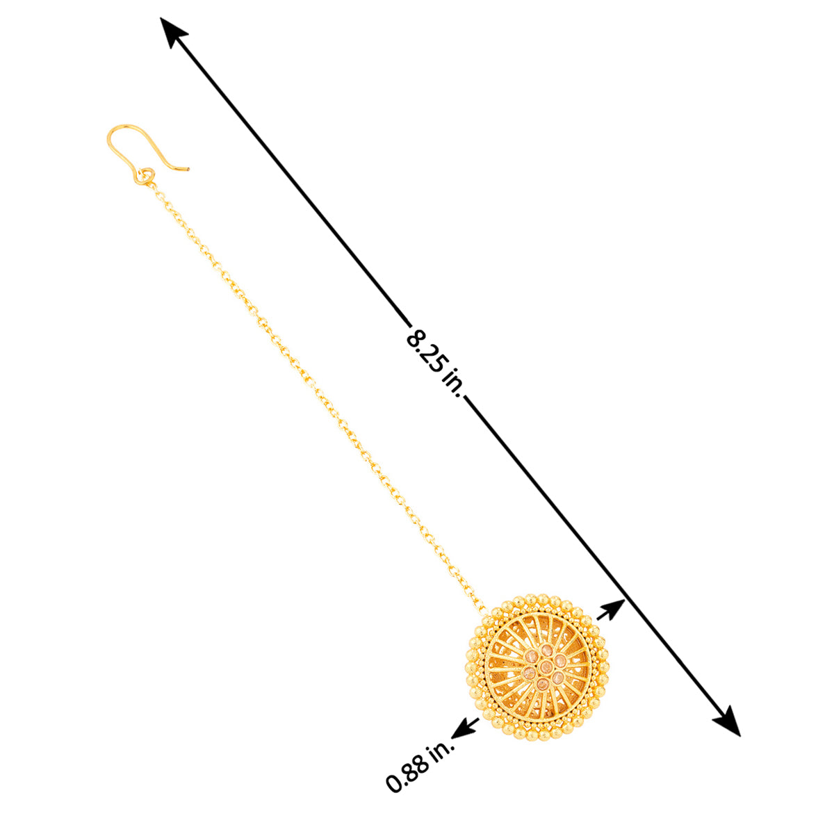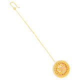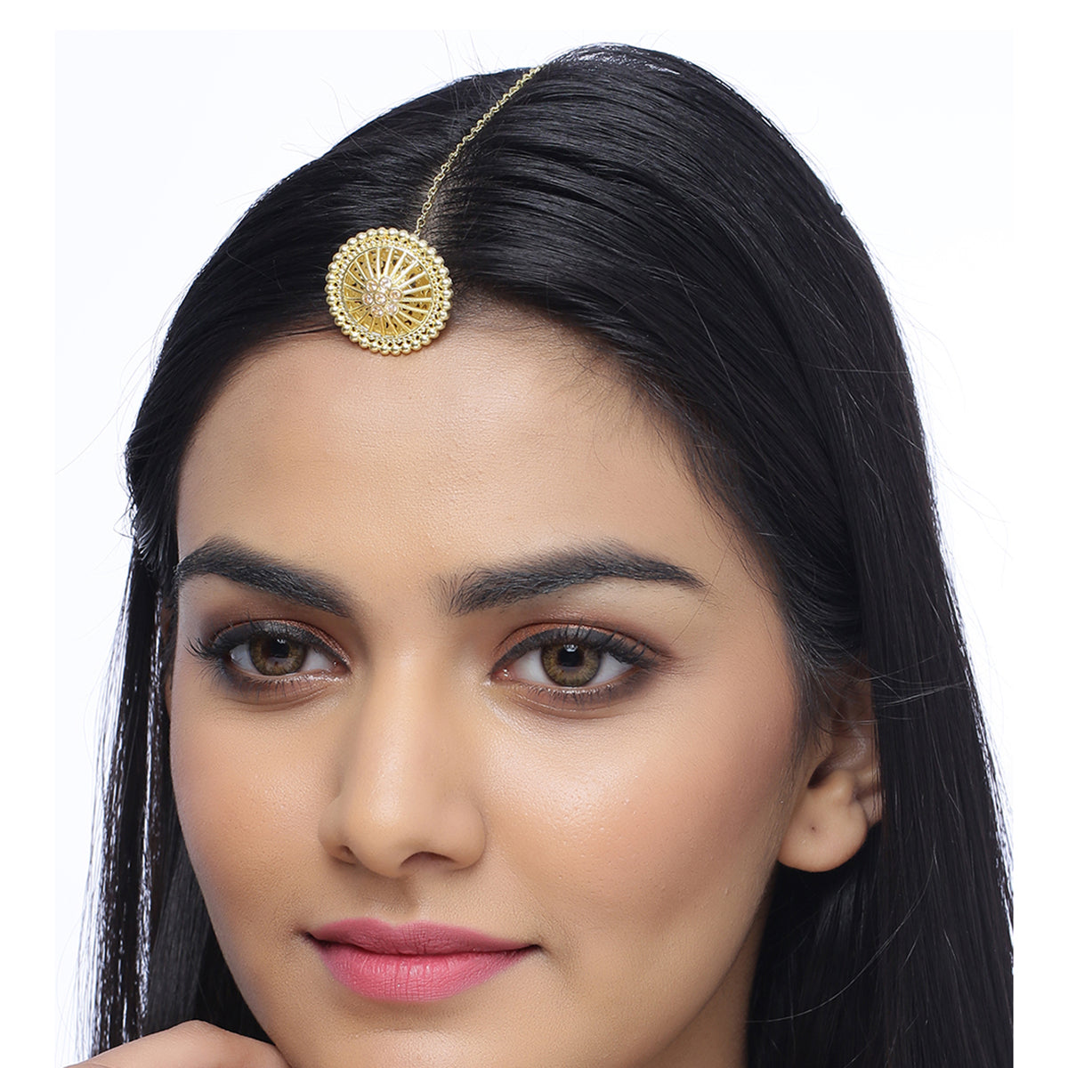 Cutwork design brass maang tika in a floral pattern. Yellow gold plated. Wear with Indian attire. This piece of jewelry comes with the Voylla assurance of quality and durability.