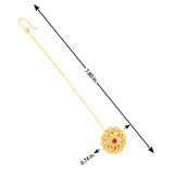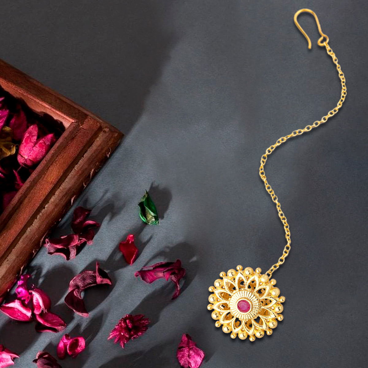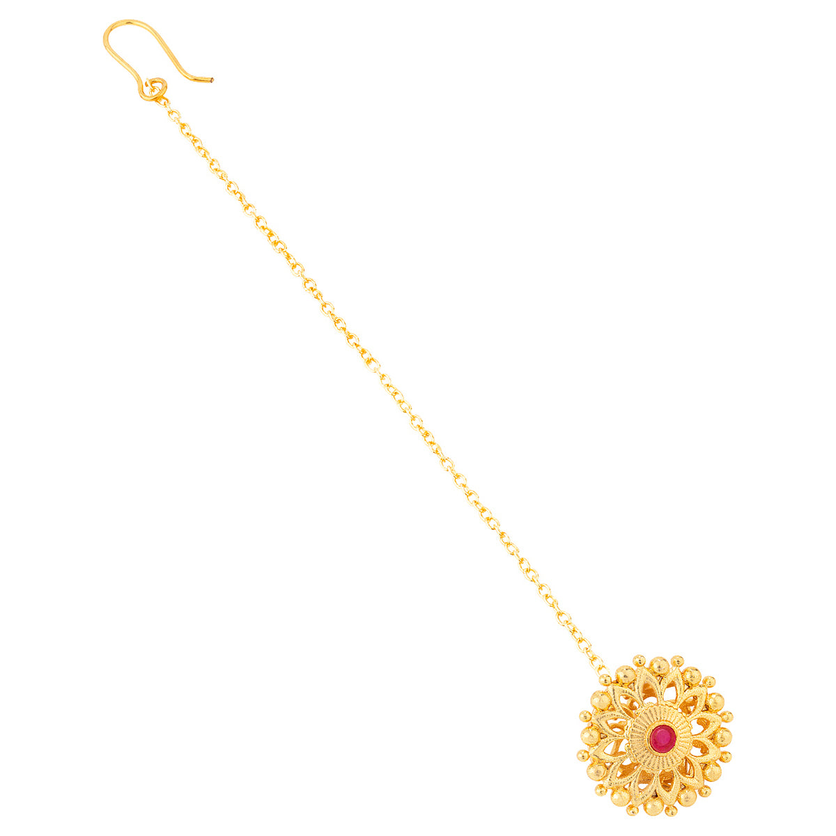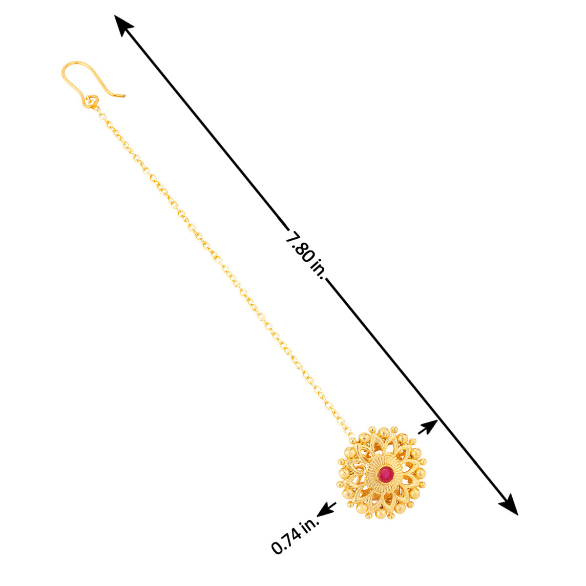 Floral motif lightly embellished maang tika. Made from brass and yellow gold plated. Good for Indian looks. This piece of jewelry comes with the Voylla assurance of quality and durability. Caring for your fashion jewelry: We, at Voylla, take care of every piece of jewelry so that you don't spend hours caring for them.