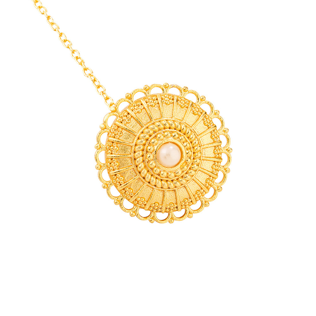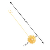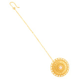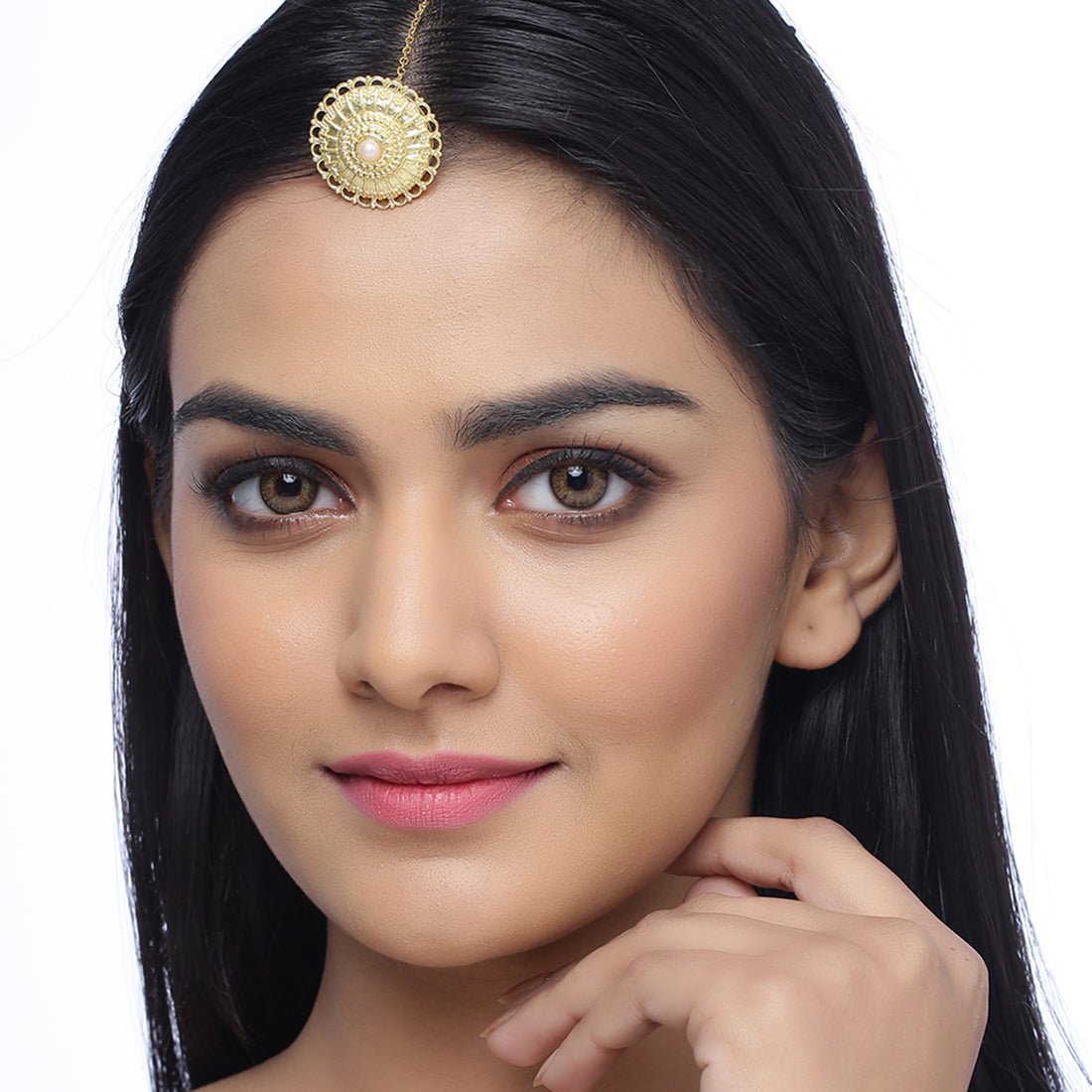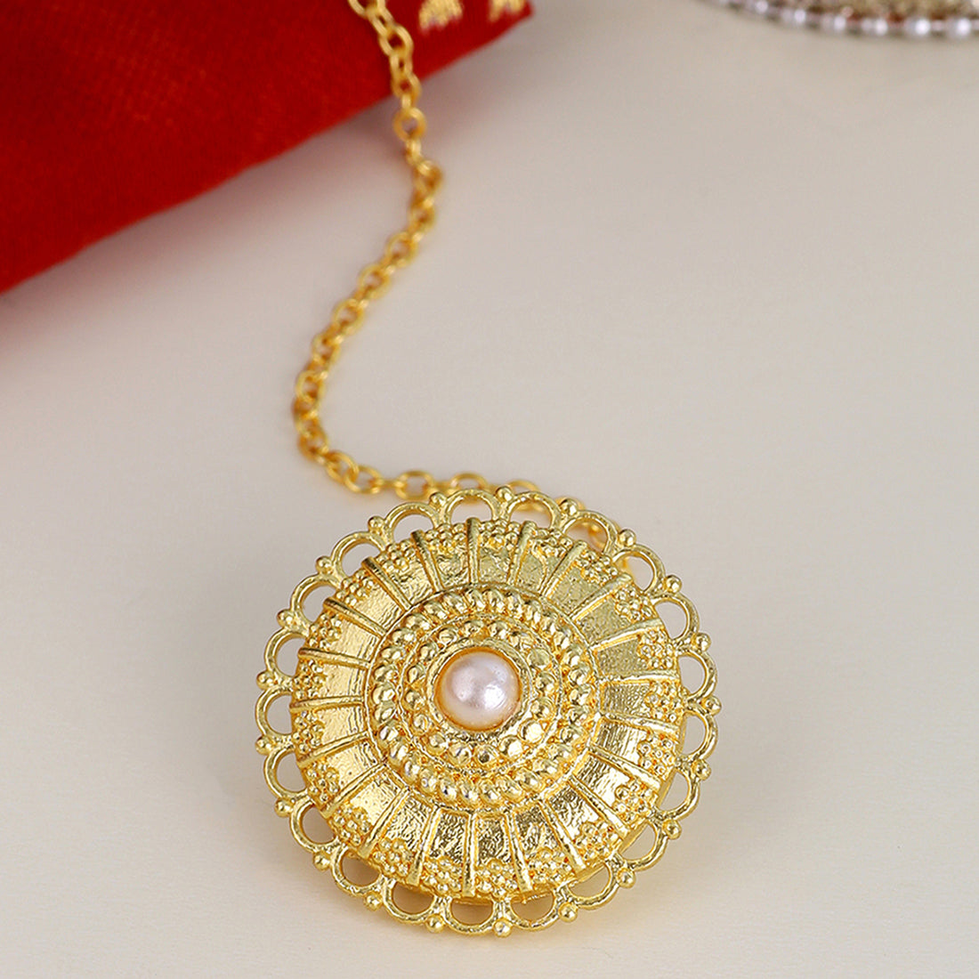 Flower motif maang tika with faux pearl. Made from brass and yellow gold plated. Good for ethnic looks. This piece of jewelry comes with the Voylla assurance of quality and durability.