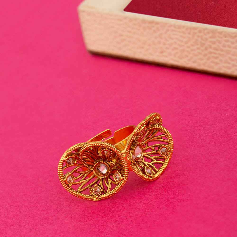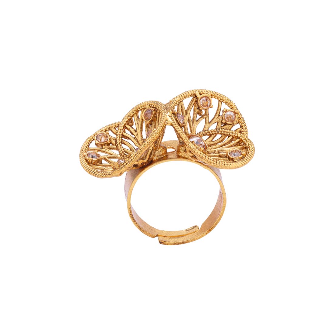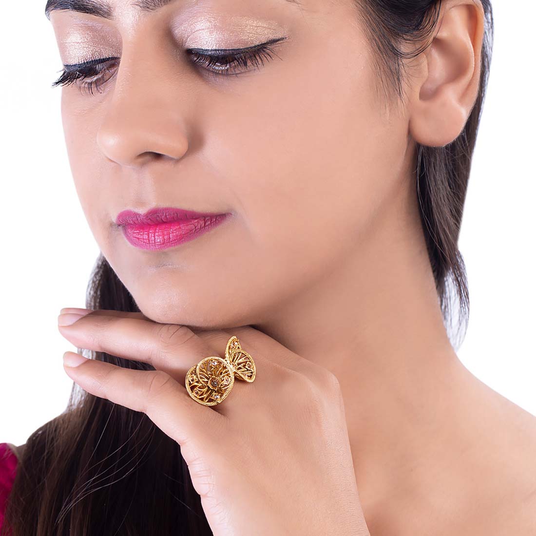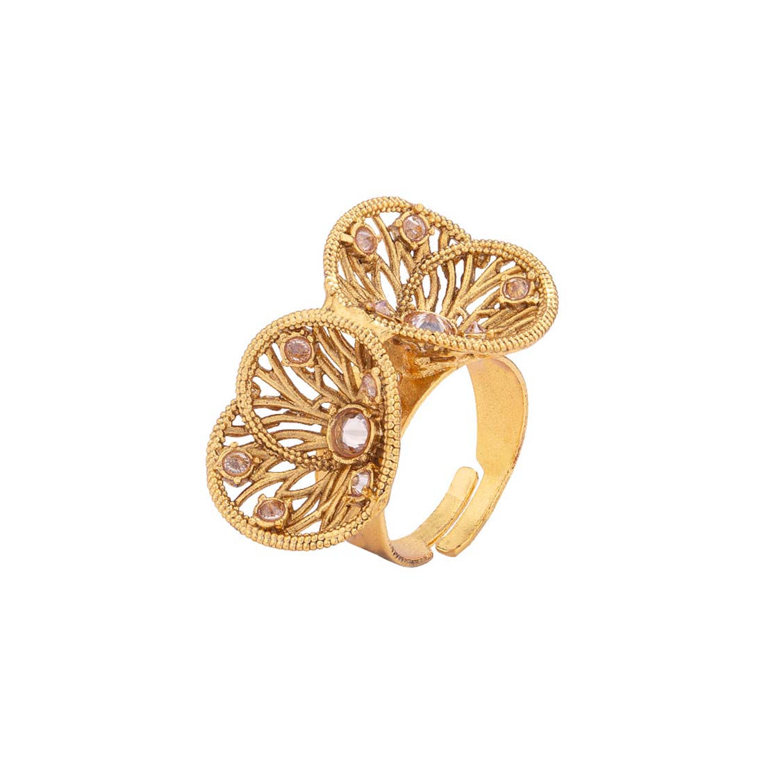Brass casual ring featuring flower motifs. Yellow gold plated and good for everyday wear.
