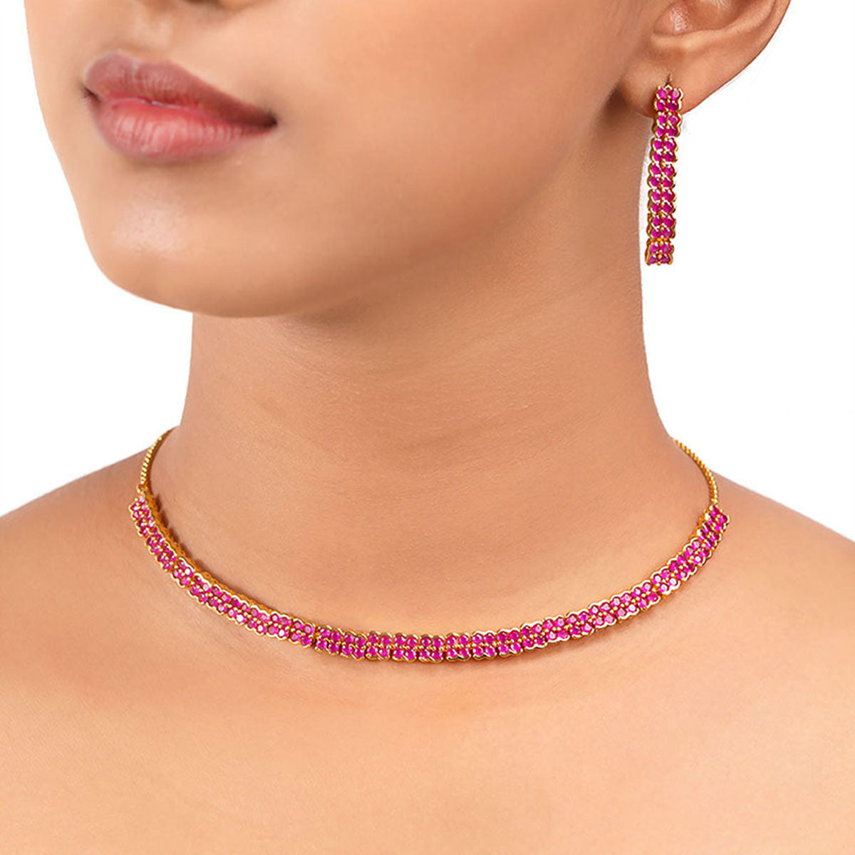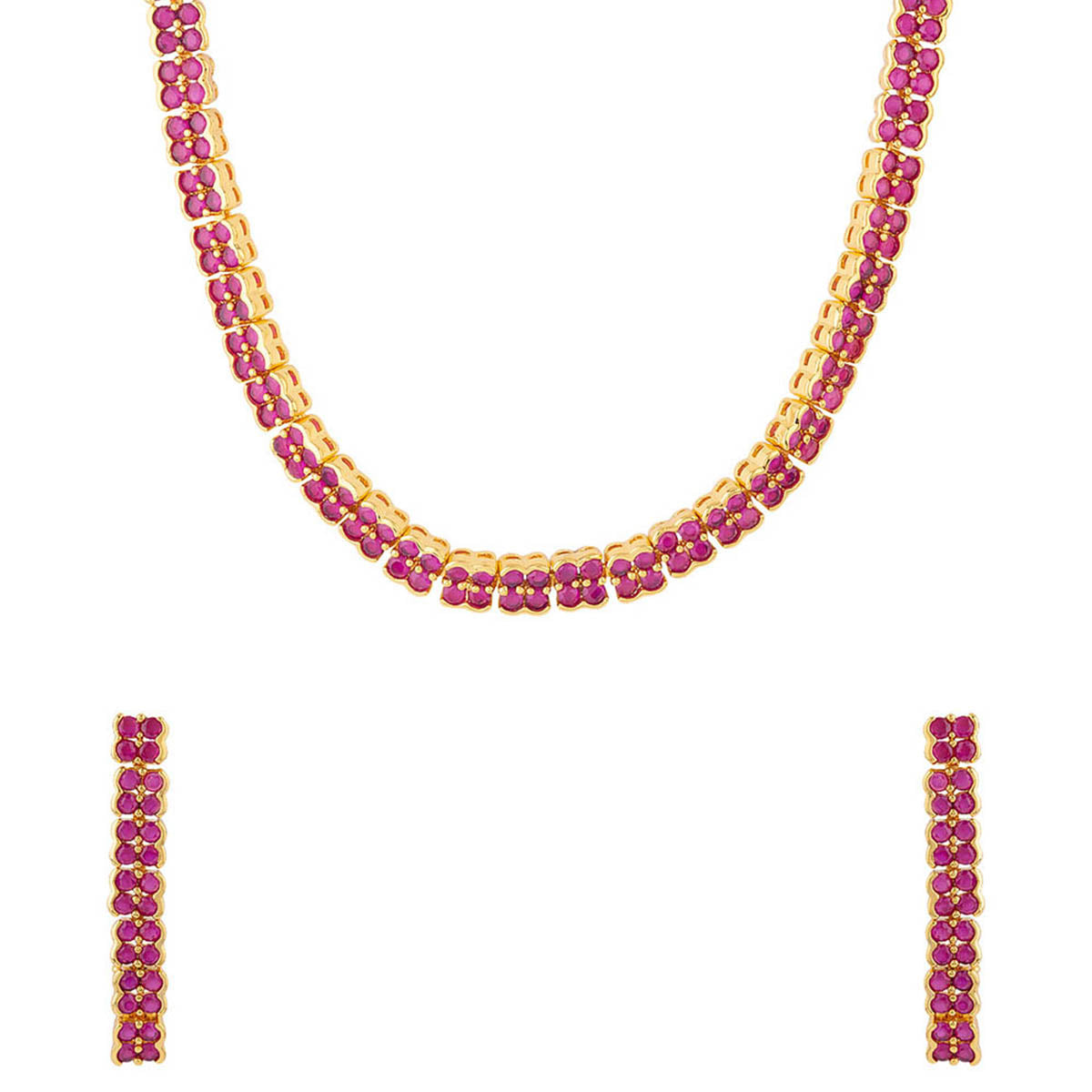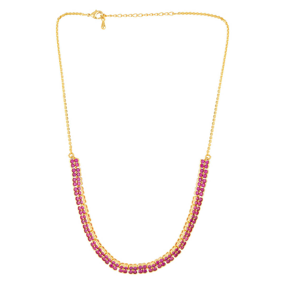 Red gemstones adorned brass necklace set with yellow gold plating. Wear with a formal evening gown. This piece of jewelry comes with the Voylla assurance of quality and durability.